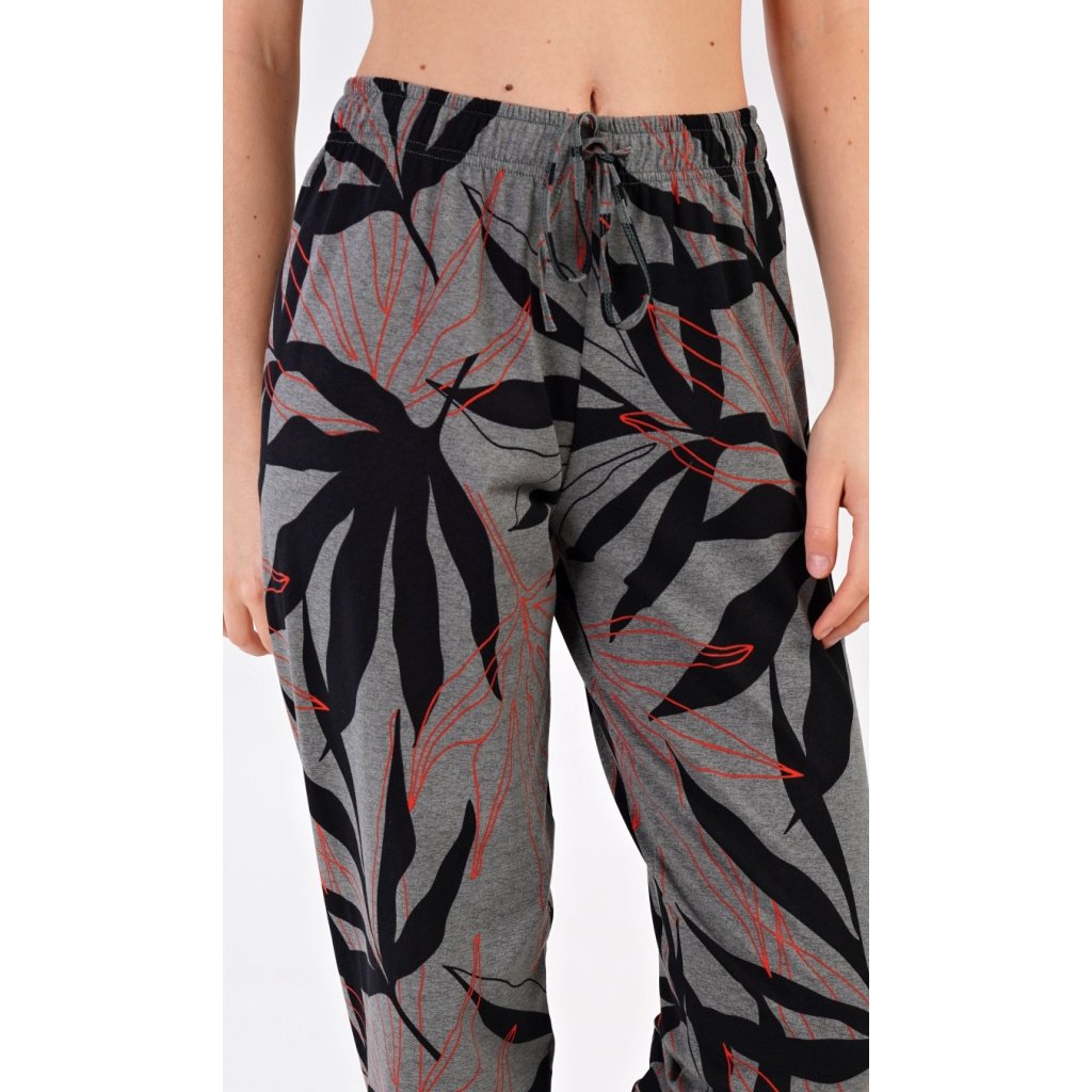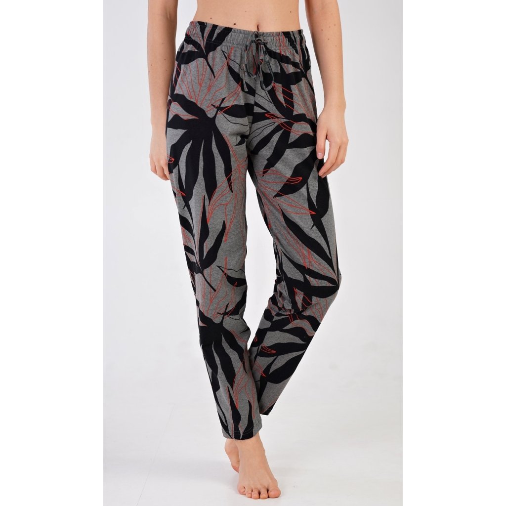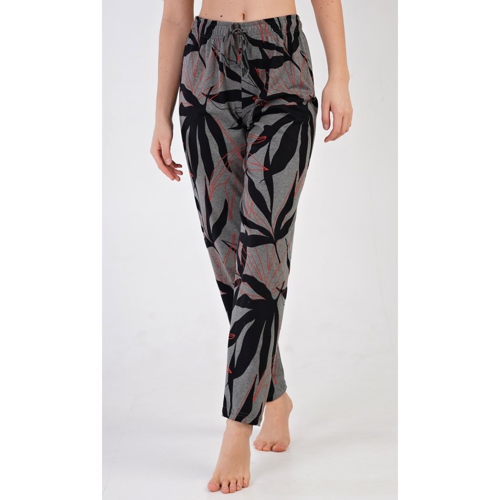 Dámské pyžamové kalhoty Listy. Dámské kalhoty Listy jsou zdobeny černými lístky a doplněny červenou konturou dalších listů. Kalhoty jsou v pase do gumy a mají šňůrku na stažení, nemají kapsy. Použitý materiál s podílem bavlny 70% je příjemný a poddajný na dotek. Kalhoty jsou vhodné i na denní nošení.