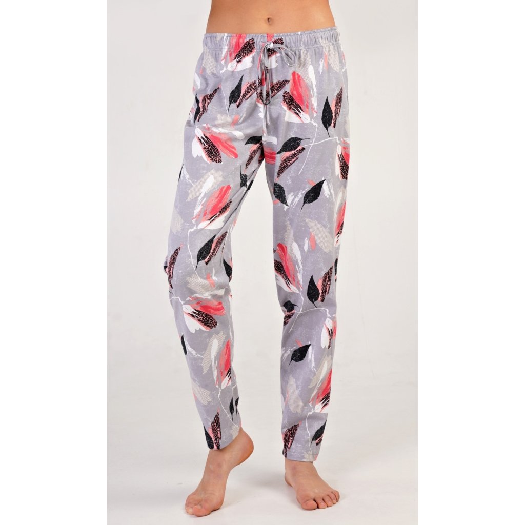 Dámské bavlněné pyžamové kalhoty Lucie. Dlouhé kalhoty jsou zdobeny barevnými listy na šedém podkladu. Kalhoty jsou v pase do gumy a mají praktickou šňůrku na stažení, nemají kapsy. Použitý bavlněný materiál je příjemný a poddajný na dotek. Kalhoty jsou vhodné i na denní nošení.