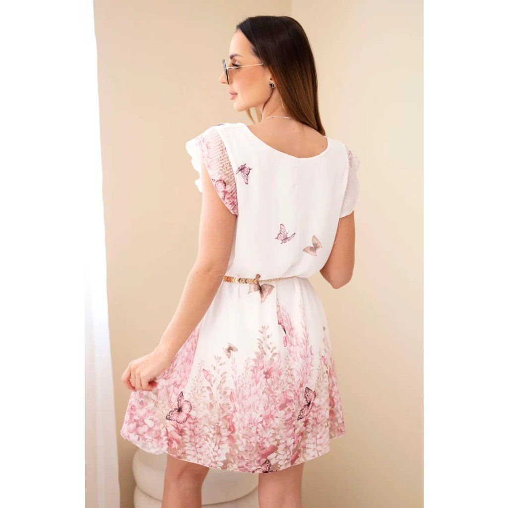 Dámské šaty s plisovaným rukávem a ozdobným páskem jsou elegantní a ženskou volbou, která se výborně hodí jak na každý den, tak při výjimečných příležitostech. Lehký, vzdušný střih způsobuje, že se šaty krásně přizpůsobí postavě a zvýrazní její přirozený tvar. Jemný vzor s motivy přírody a motýlů dodává stylizaci výjimečný charakter a něžnost.
