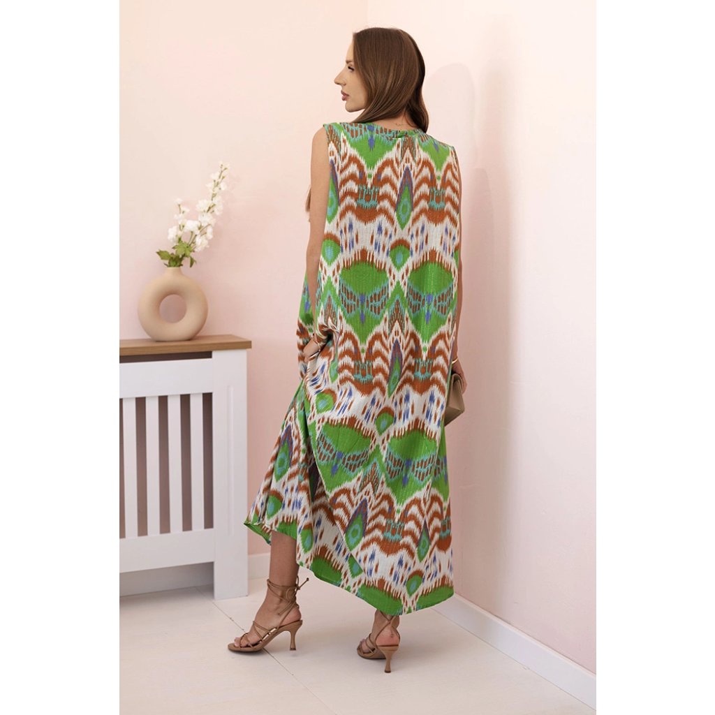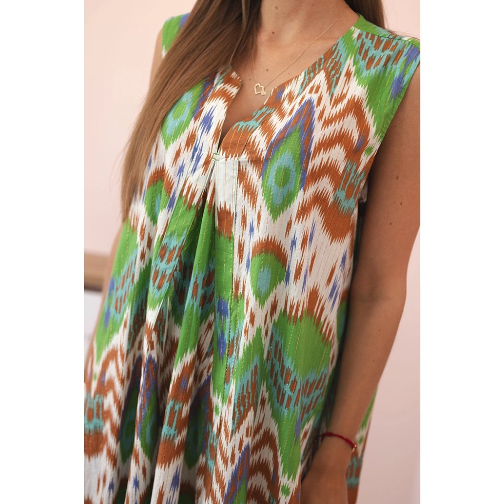 Tyto dámské šaty bez rukávů jsou ideální volbou pro teplejší dny. Jejich efektní, etnický vzor upoutá pozornost a rozšířený střih dodá postavě lehkost a volnost. Vyrobeny ze 100% bavlny, zajišťují maximální pohodlí, přirozenou prodyšnost a příjemný dotek. Výstřih do V dodává ženský šarm a volný střih je ideální jak na dovolenou, procházku po městě, tak i na letní setkání. Je to univerzální model, který by neměl chybět ve vašem šatníku.