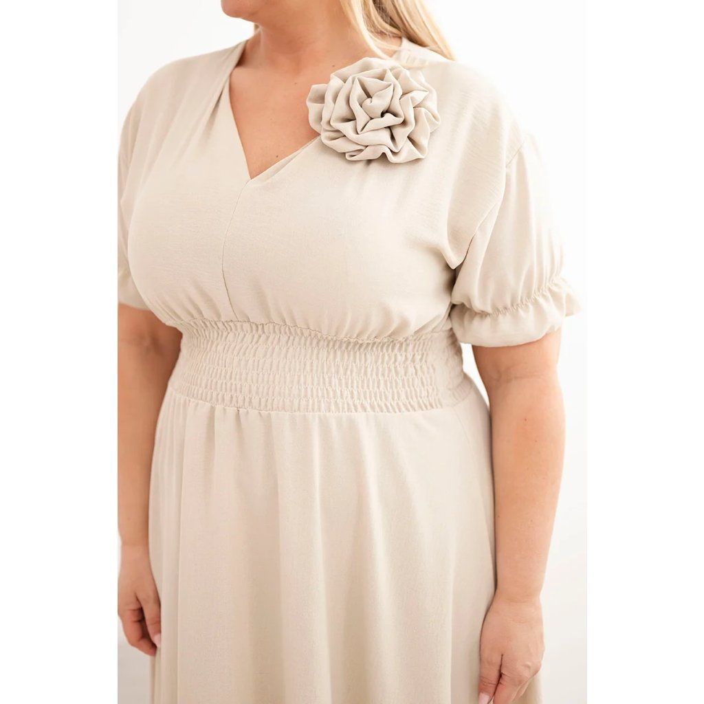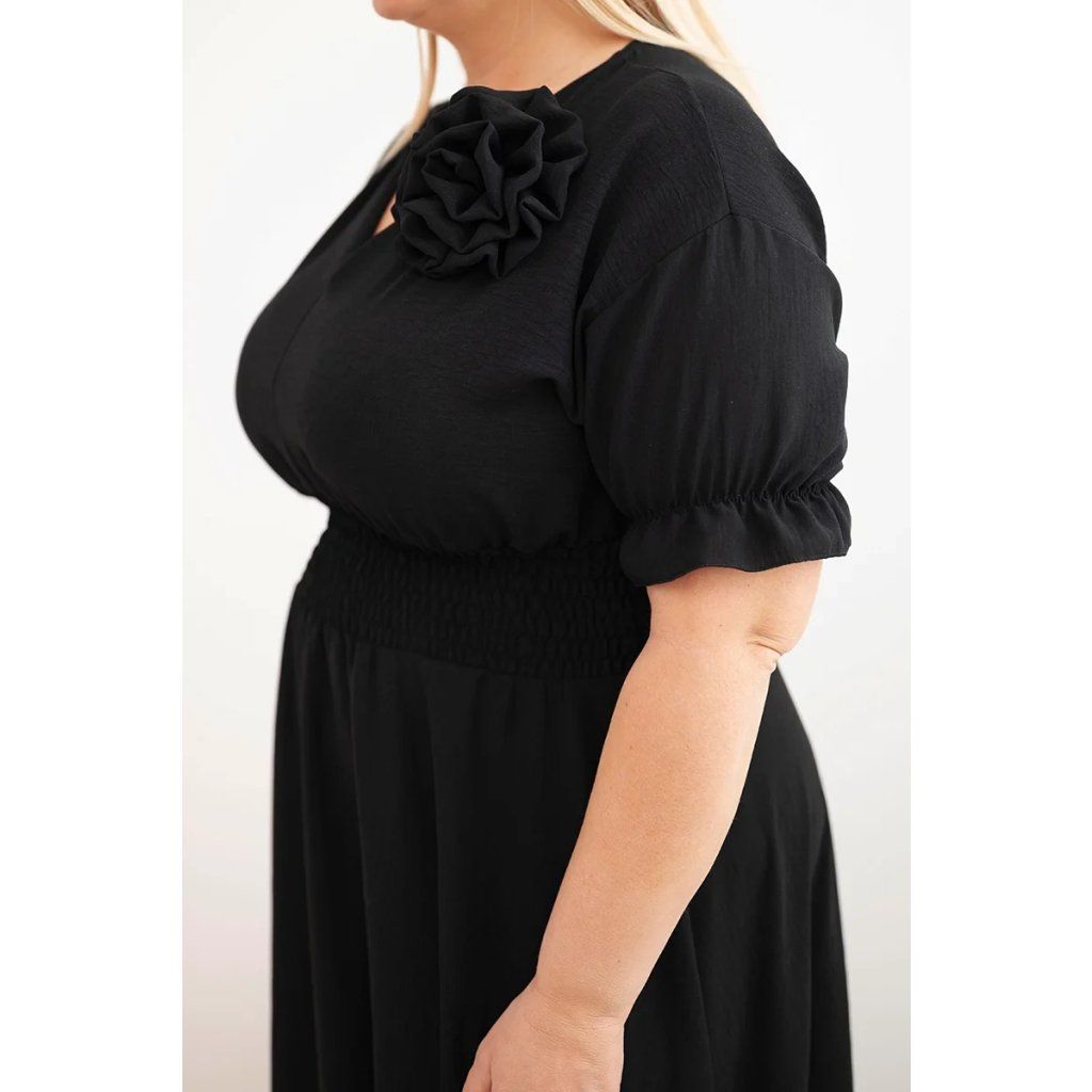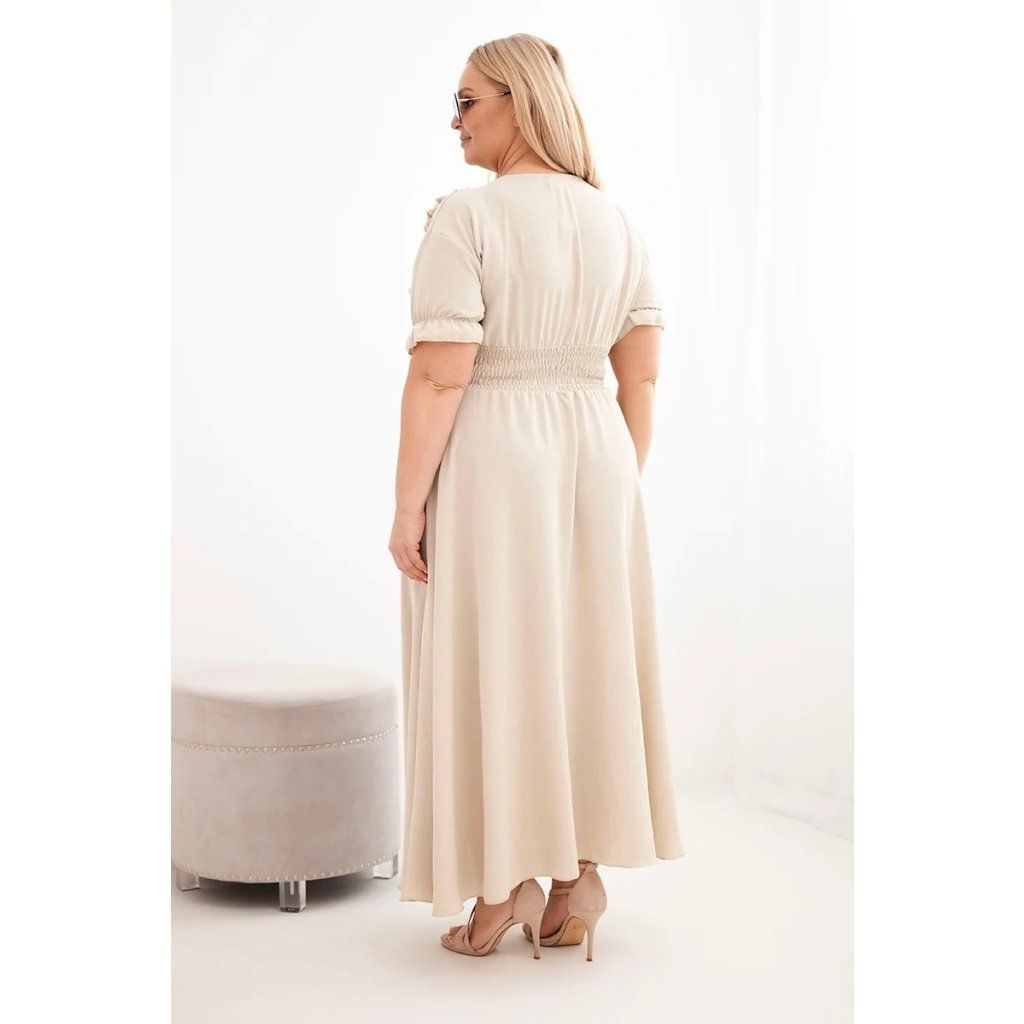 Elegantní a mimořádně pohodlné dámské šaty Plus Size jsou ideální volbou pro ženy, které si cení stylu a pohodlí v každodenních outfitech. Model se vyznačuje klasickým výstřihem do V, který opticky zeštíhluje krk a zdůrazňuje ženský charakter stylizace. Krátké rukávy zakončené jemnou volánkou dodávají lehkost a subtilní kouzlo.