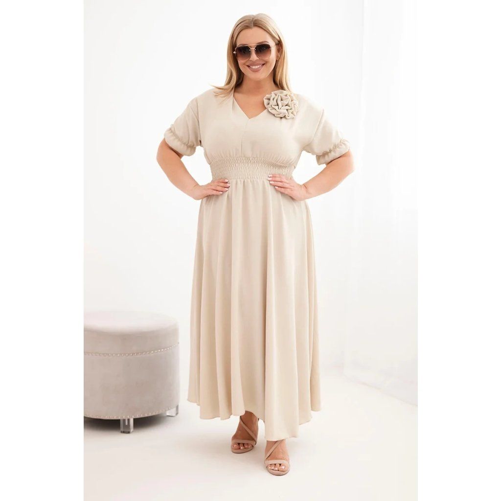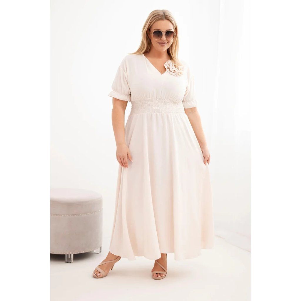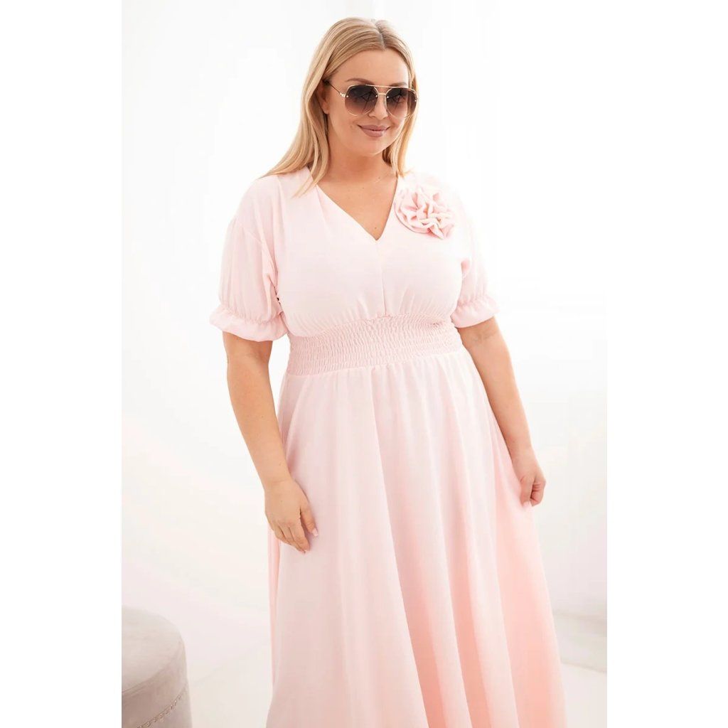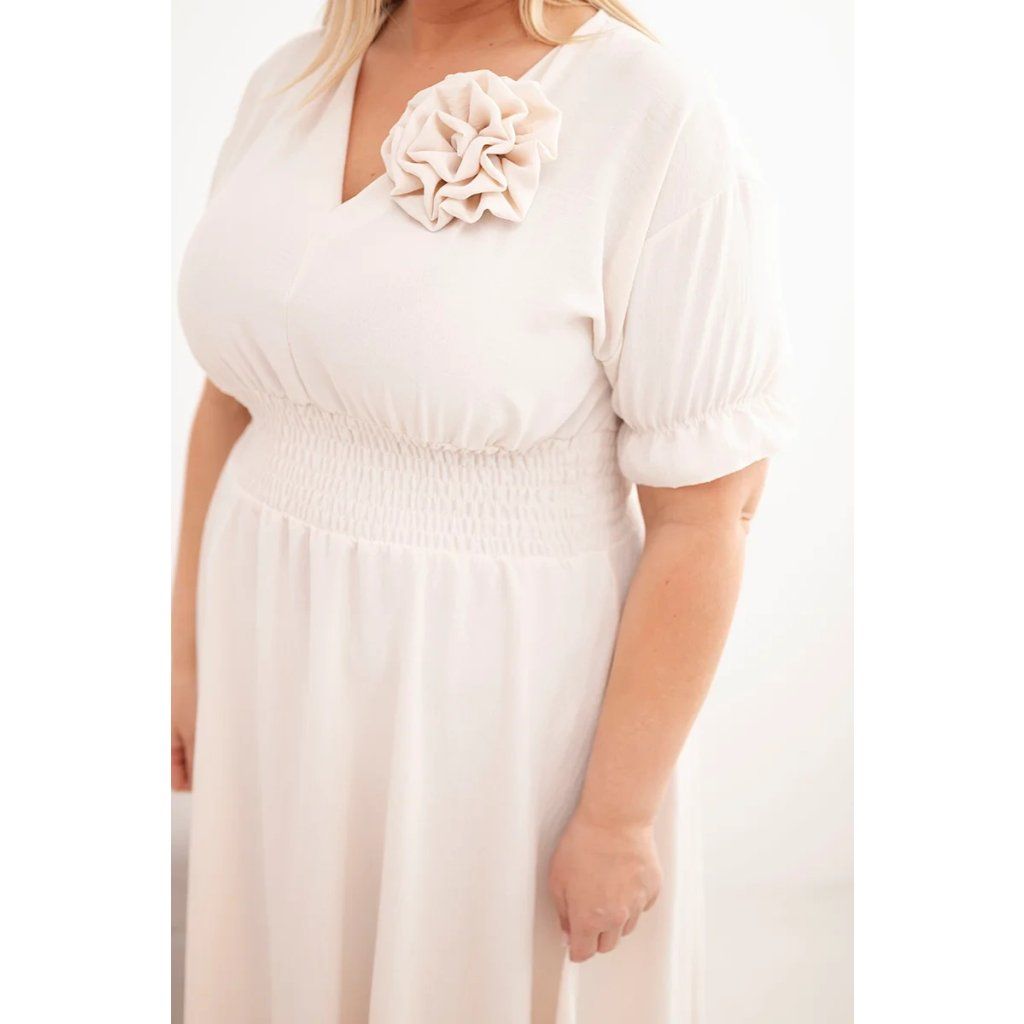 Elegantní a mimořádně pohodlné dámské šaty Plus Size jsou ideální volbou pro ženy, které si cení stylu a pohodlí v každodenních outfitech. Model se vyznačuje klasickým výstřihem do V, který opticky zeštíhluje krk a zdůrazňuje ženský charakter stylizace. Krátké rukávy zakončené jemnou volánkou dodávají lehkost a subtilní kouzlo.