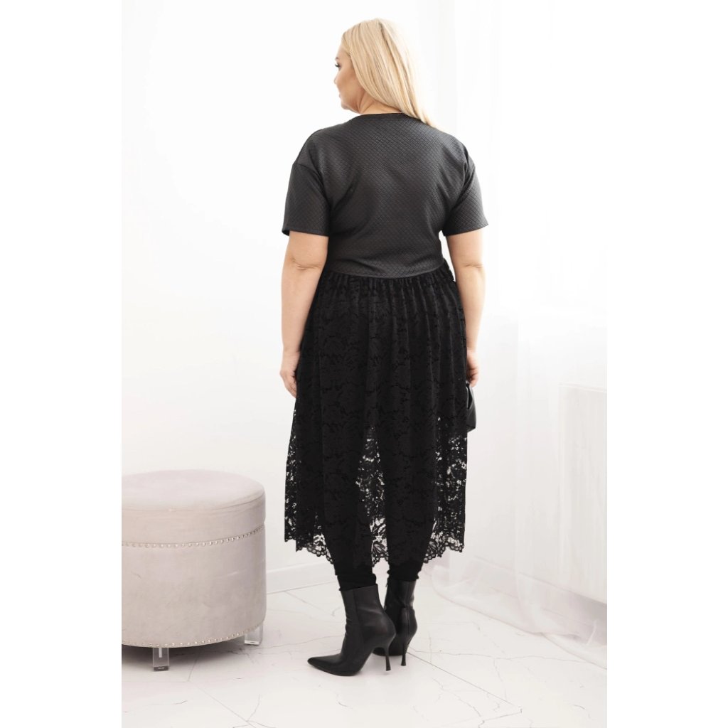 Tento elegantní dámský šaty jsou ideální kombinací moderního stylu a romantického akcentu. Hladký, strukturovaný vršek s krátkým rukávem jemně kontrastuje s efektním, krajkovým spodkem, čímž vytváří jedinečný celek. Je to model, který se skvěle hodí jak na každodenní nošení, tak na speciální příležitosti – od rodinných setkání po večerní vycházky.