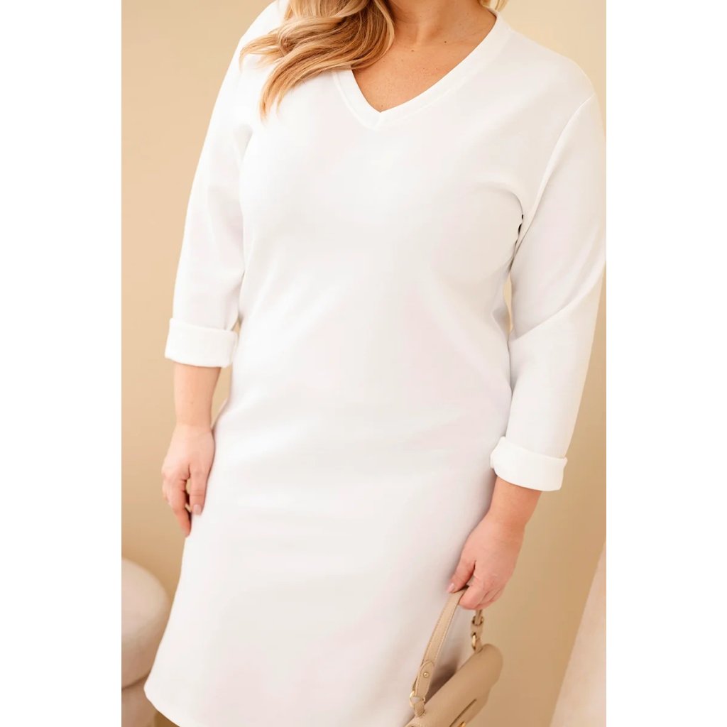 Dámské šaty klasického střihu z měkké, hebké látky, která krásně splývá se siluetou a zaručuje pohodlí po celý den. Výstřih do V decentně zdůrazňuje krk, zatímco tříčtvrteční rukávy dodávají šatům lehkost. Jednoduchý střih činí tento model ideálním pro každodenní nošení, do práce i na společenské akce.