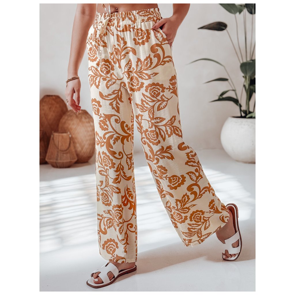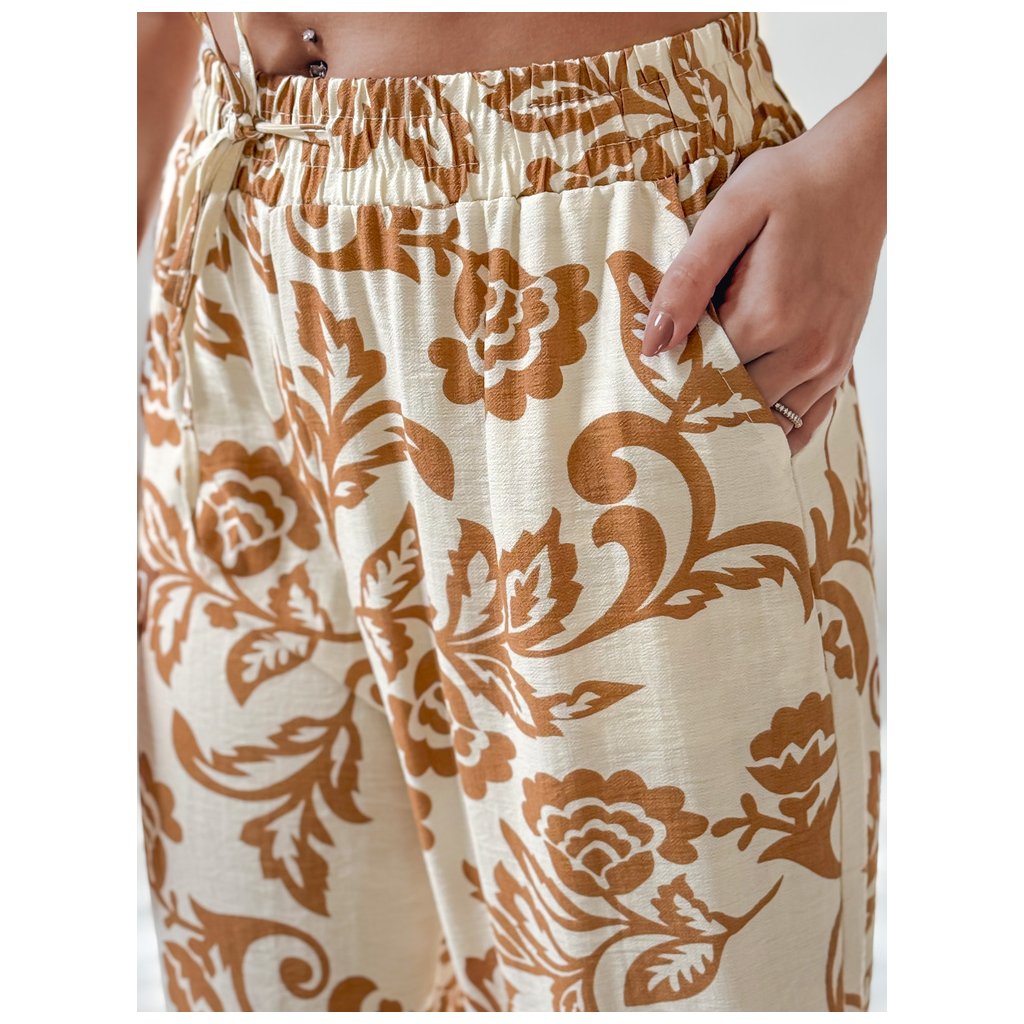 Tyto dámské kalhoty s vysokým pasem a výrazným květinovým potiskem jsou ideální na léto a teplé jarní dny. Jsou vyrobeny z prodyšné látky a poskytují pohodlí a volnost pohybu. Široké nohavice opticky prodlužují nohy, zatímco elastický pas s vázáním přiléhá k postavě. Ozdobné přední kapsy dodávají kalhotám půvab a vytvářejí pohodlný letní vzhled.