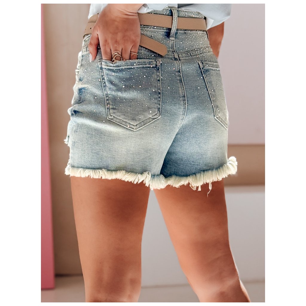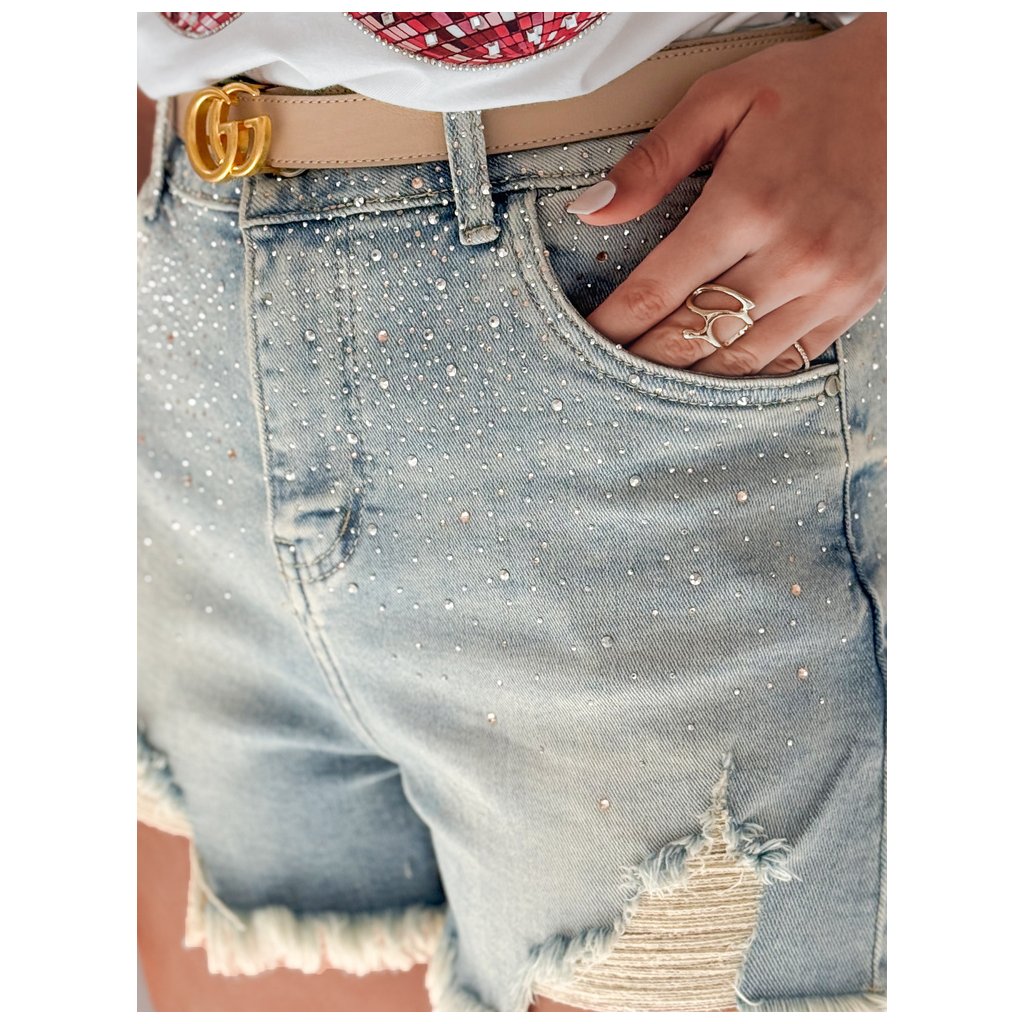 Tyto džínové kraťasy jsou skvělou volbou pro ty, kteří milují třpyt a pohodlí. Jemné kamínky roztroušené po celé délce kraťasů vytvářejí reflexní efekt, který se krásně třpytí v pohybu. Oděrky na nohavicích a roztřepené lemy dodávají kraťasům městský nádech. Díky klasickému zapínání a ozdobným kapsám tento střih dokonale lichotí postavě. Ideální na jarní procházky, letní festivaly nebo na každodenní outfity s topem.