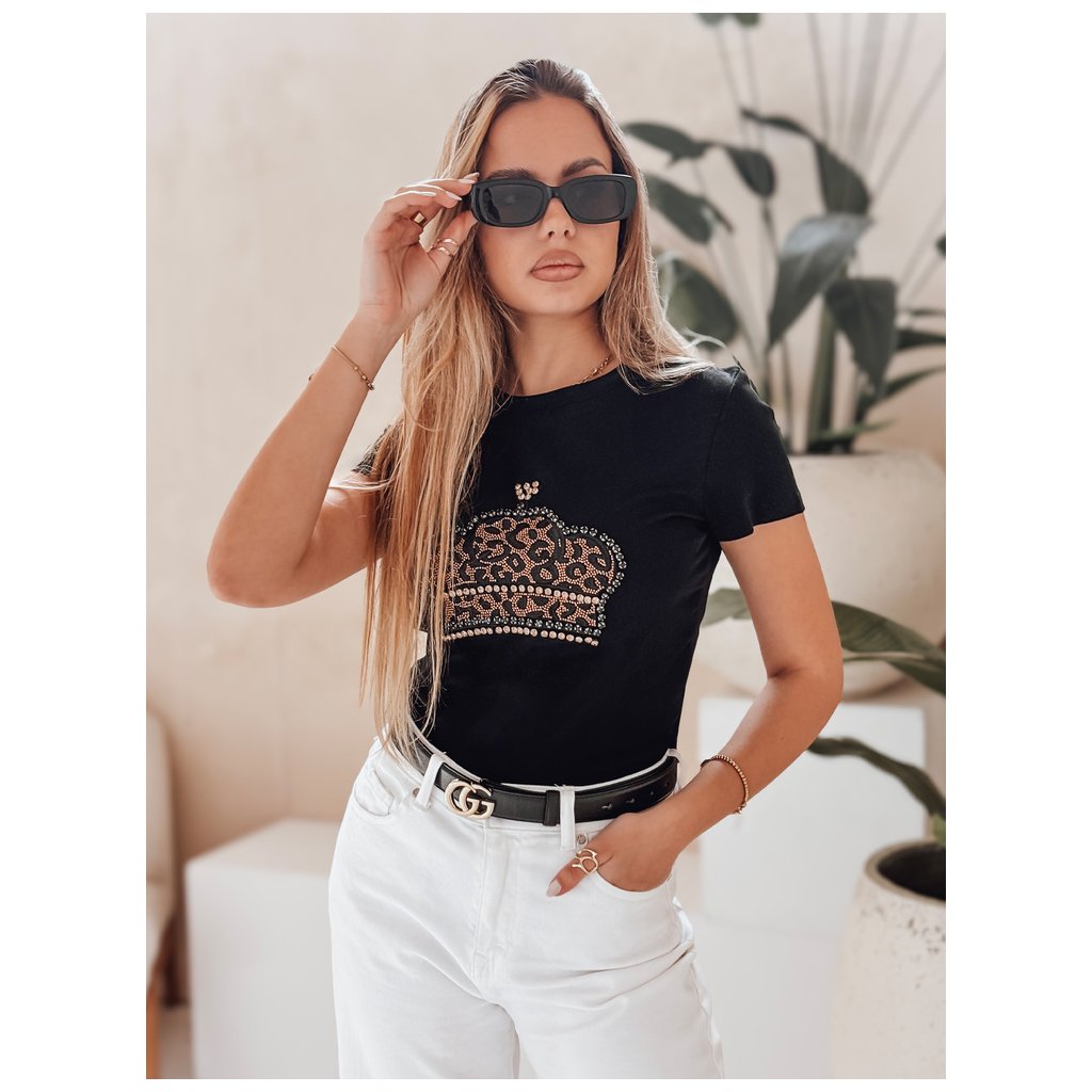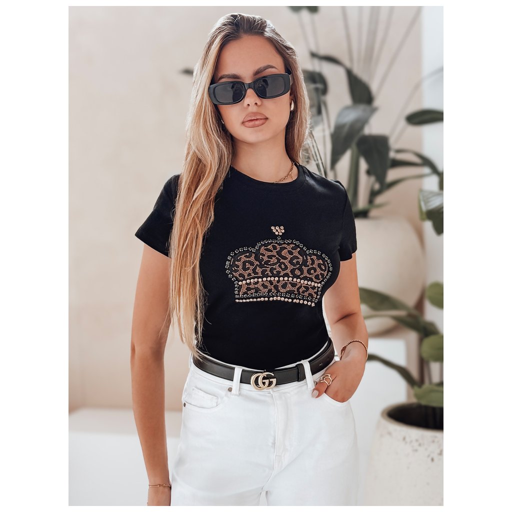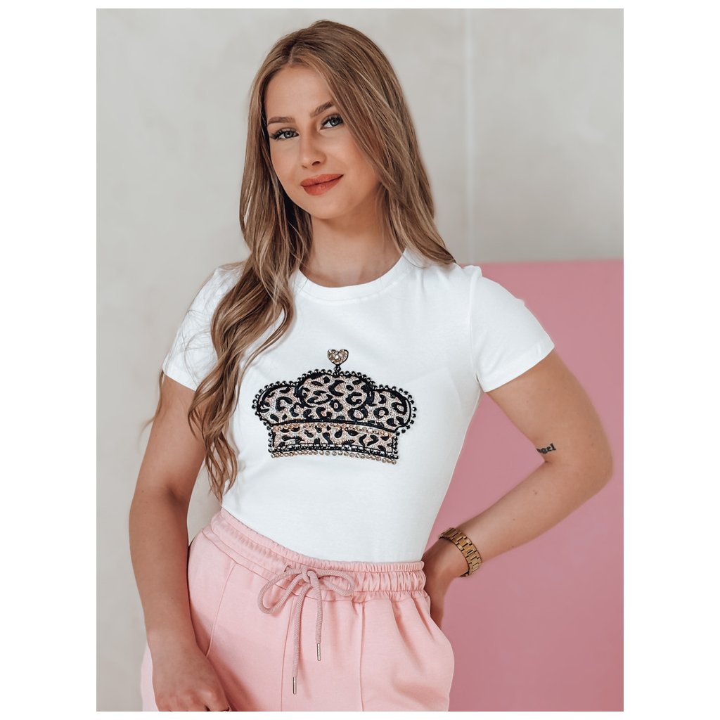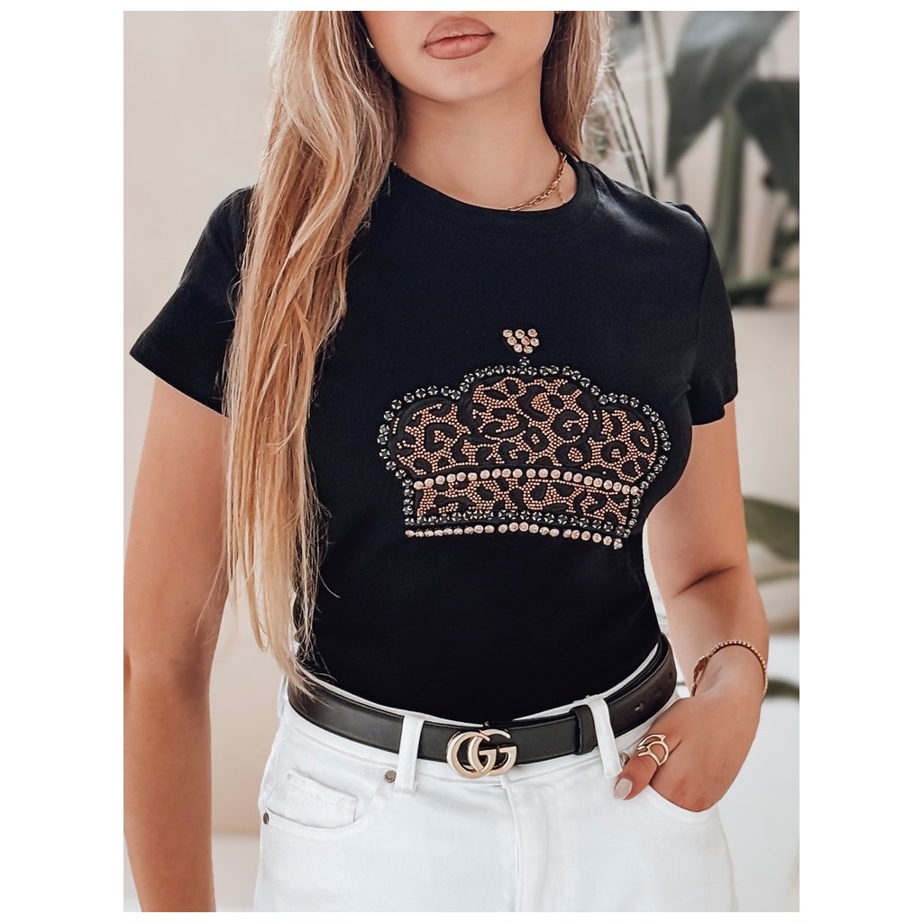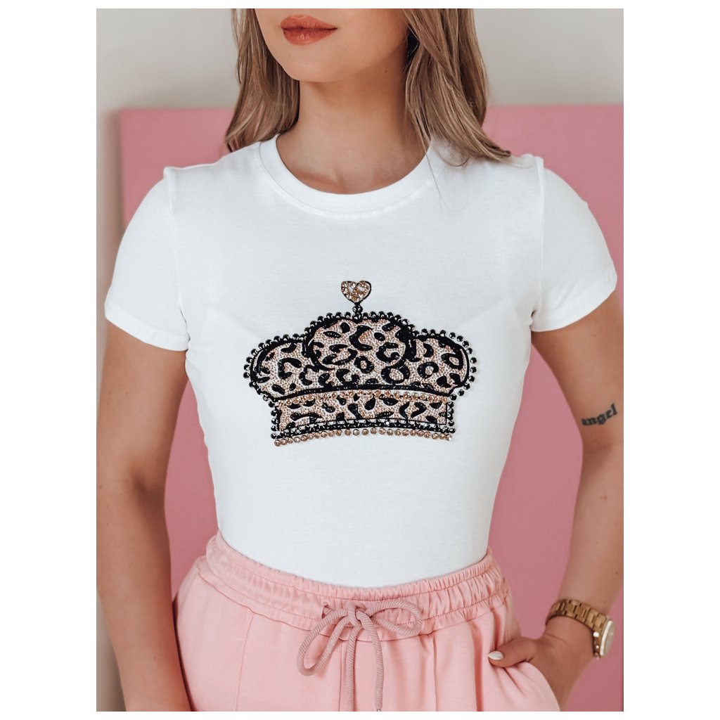 Toto přiléhavé dámské tričko s krátkým rukávem je skvělou volbou pro teplejší dny. Jeho poutavý potisk koruny, zdobený třpytivými kamínky, vytváří ozdobný akcent. Měkký materiál zajišťuje pohodlí a kulatý výstřih dodává klasický nádech. Toto tričko se perfektně hodí k jarním a letním outfitům.