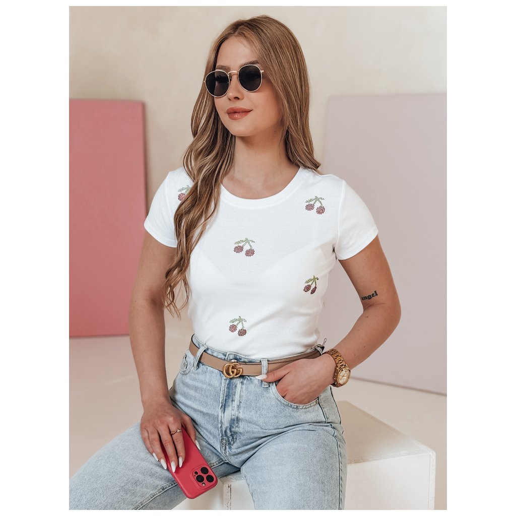 Dámské tričko s krátkým rukávem a kulatým výstřihem z tenké, prodyšné látky. Zdobené výraznými kamínkovými aplikacemi třešní dodává tričku jemný lesk a 3D efekt. Ideální na jaro a teplé dny – perfektně se hodí k džínům pro ležérní vzhled.