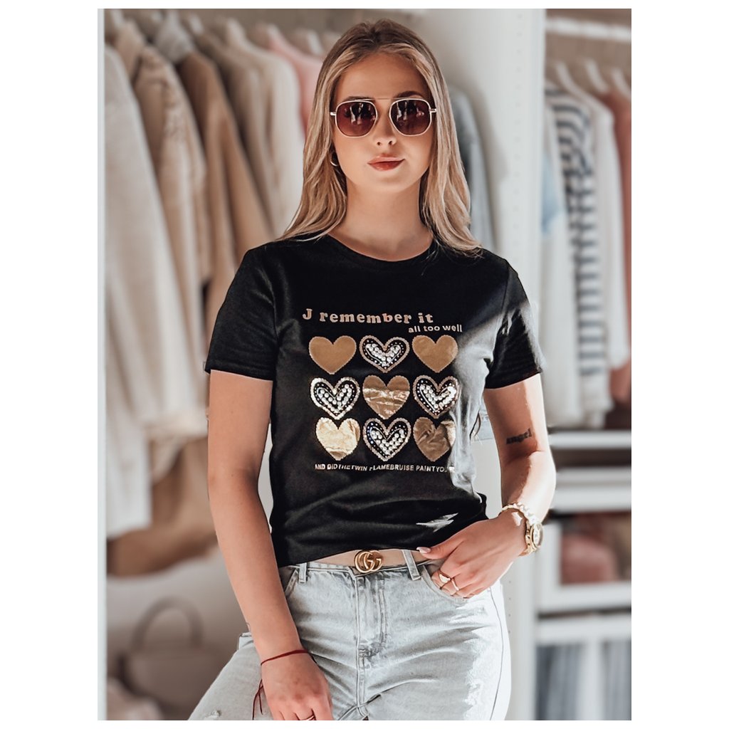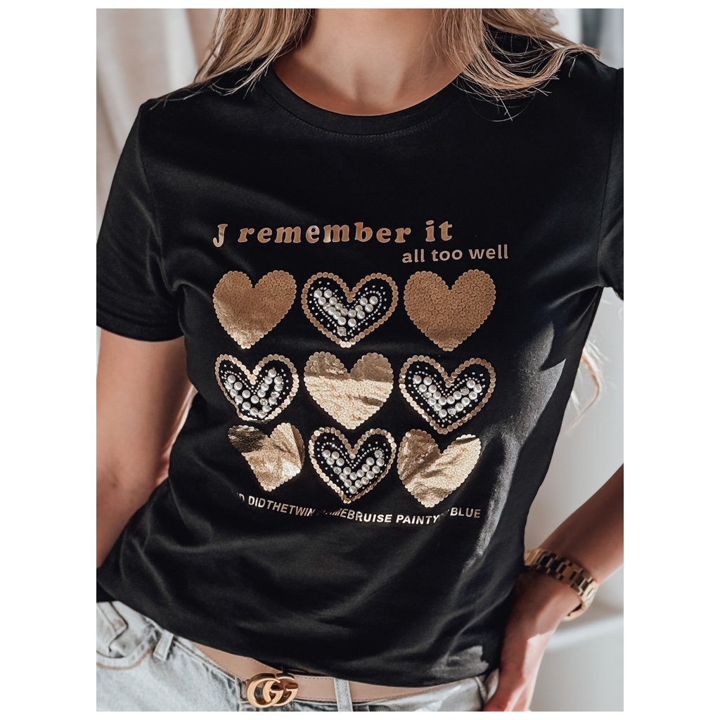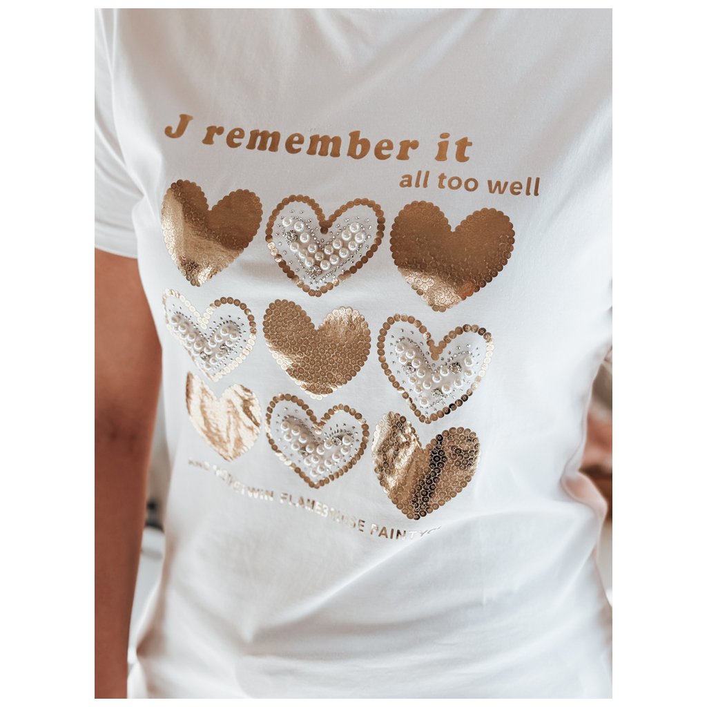 Toto dámské tričko klasického střihu se vyznačuje jedinečným potiskem srdíček zdobeným třpytivými flitry, perlami a kamínky. Dekorativní ozdoby dodávají tričku elegantní nádech. Ideální pro každodenní nošení nebo jako součást elegantnějšího outfitu.