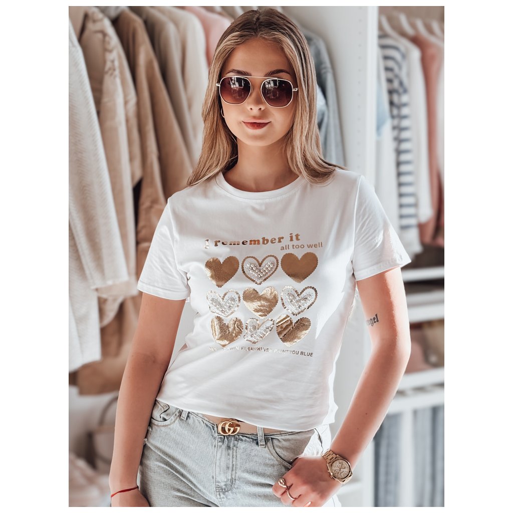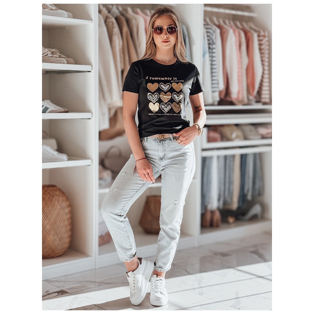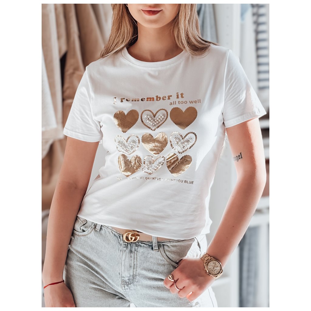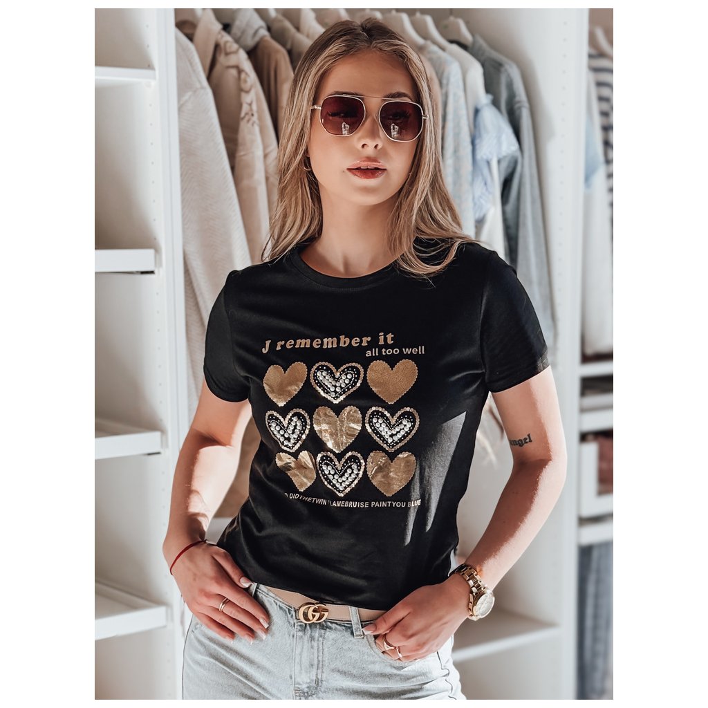 Toto dámské tričko klasického střihu se vyznačuje jedinečným potiskem srdíček zdobeným třpytivými flitry, perlami a kamínky. Dekorativní ozdoby dodávají tričku elegantní nádech. Ideální pro každodenní nošení nebo jako součást elegantnějšího outfitu.