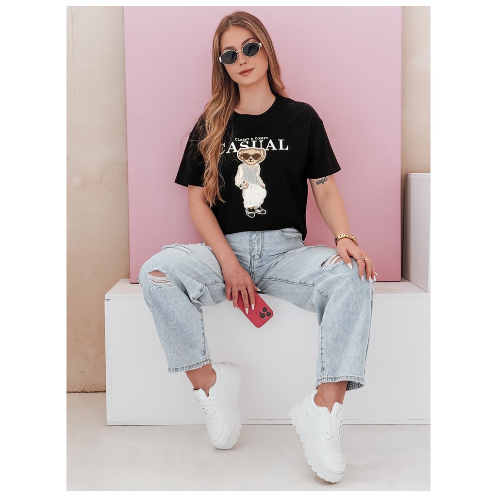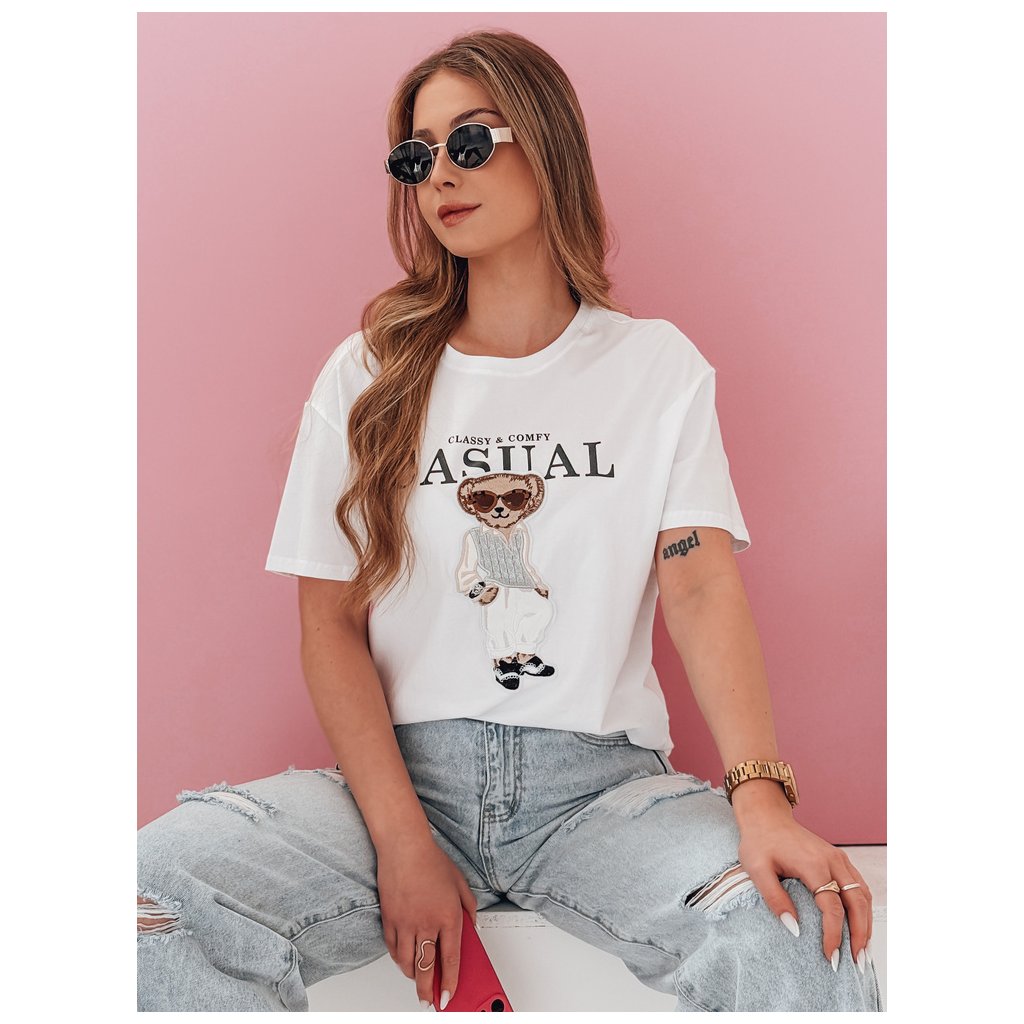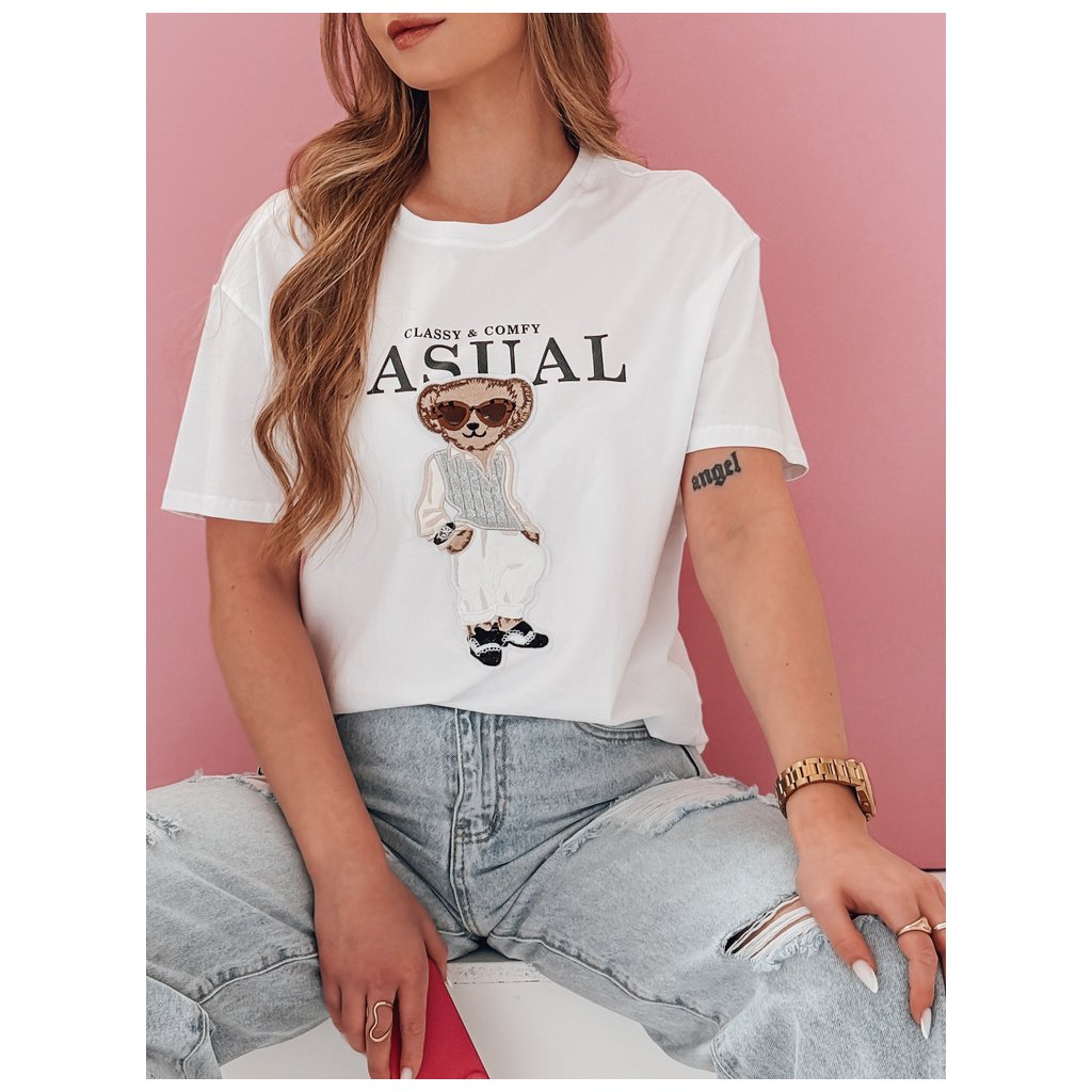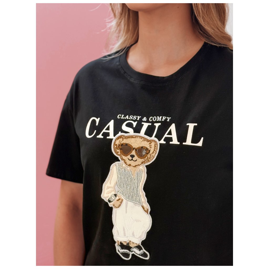 Toto dámské tričko s rozkošnou aplikací medvídka a sloganem „CLASSY & COMFY CASUAL“ v sobě spojuje styl a pohodlí. Je vyrobeno z měkké látky a je ideální pro každodenní nošení. Volný střih a hravé detaily poutavě upoutají pozornost, díky čemuž je tento kousek skvělou volbou pro jarní dny.