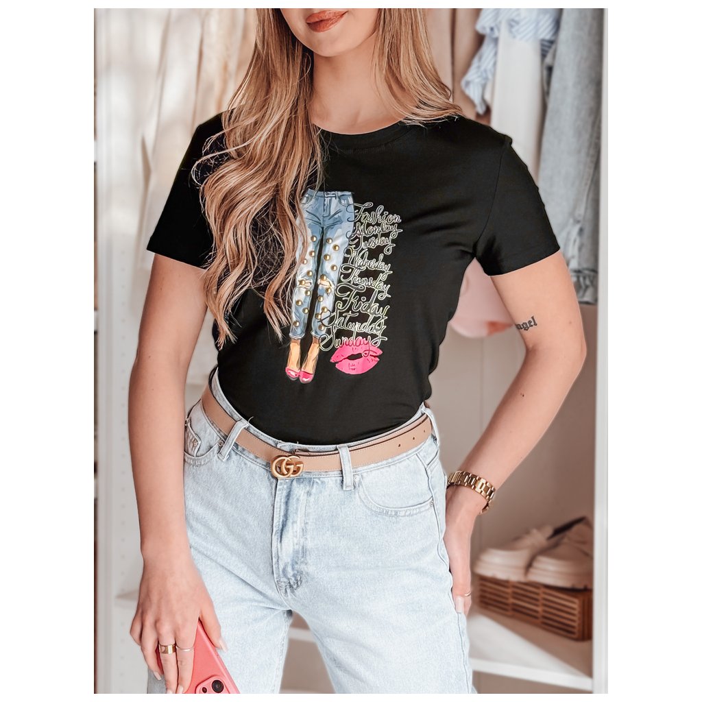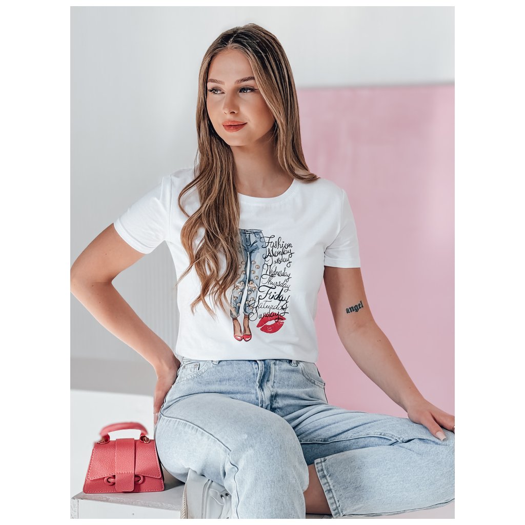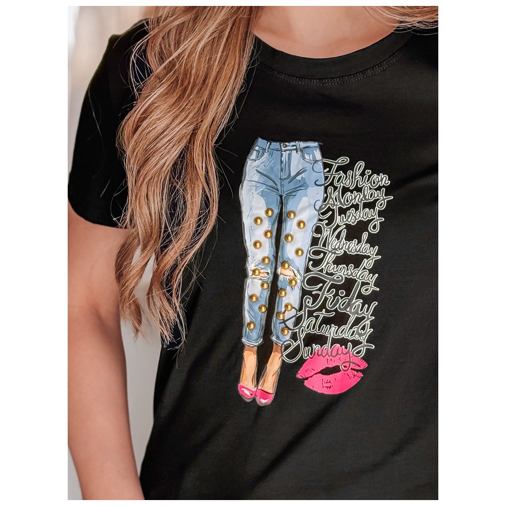Toto módní dámské tričko má potisk s džínami a dny v týdnu, zdobený kovovými cvočky pro 3D efekt. Díky pohodlnému střihu a měkké, prodyšné bavlně je ideální pro každodenní nošení. Ideální k ležérním outfitům s džínami, teniskami nebo elegantními doplňky.