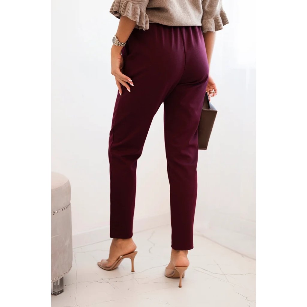 Hladký materiál a klasický střih zajišťují, že kalhoty skvěle ladí s košilemi, blůzkami a saky. Vsazená guma v pase zaručuje lepší přizpůsobení, a dekorativní pásek s kovovou sponou podtrhuje pas a dodává celku elegantní charakter.