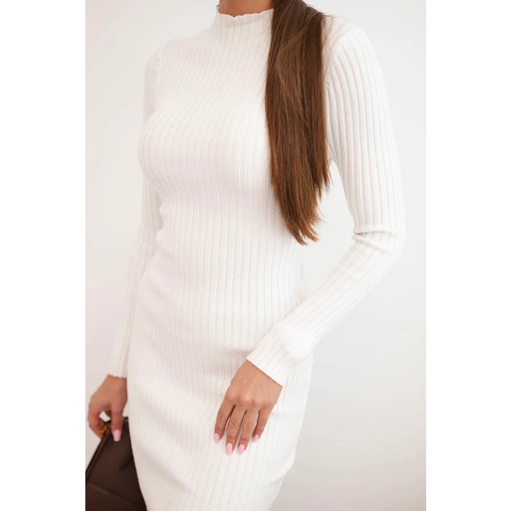 Tyto dámské pletené šaty jsou ideální volbou pro ženy, které si cení elegance a pohodlí v jednom. Vyrobeno z elastického, měkkého materiálu, dokonale se přizpůsobí postavě a zdůrazňuje ženské tvary. Přiléhavý střih v kombinaci s dlouhým rukávem a stojáčkem dělá z tohoto modelu skvělou volbu jak na každodenní nošení, tak na speciální příležitosti – do práce, na schůzku nebo na večerní výstup.