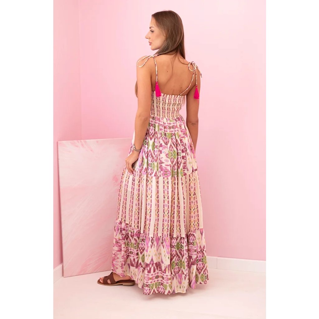 Hledáte ideální šaty na léto, dovolenou nebo festivaly? Tyto dámské maxi šaty na ramínka jsou skvělou volbou pro ženy, které si cení pohodlí a originálního stylu. Vyrobeny ze 100% lehké a prodyšné viskózy, zajišťují pohodlí i v nejteplejších dnech. Módní etnický vzor a šťavnaté barvy zajistí, že v davu rozhodně vyniknete. Horní část šatů je z elastické gumy, která se krásně přizpůsobí postavě, a nastavitelné ramínka s ozdobnými střapci dodávají šarm. Spodní část s volánem dodává lehkost a romantický charakter. Tento model je ideální na pláž, procházky i letní setkání s přáteli. Velikost je univerzální a vhodná pro ženy velikosti S, M nebo L.