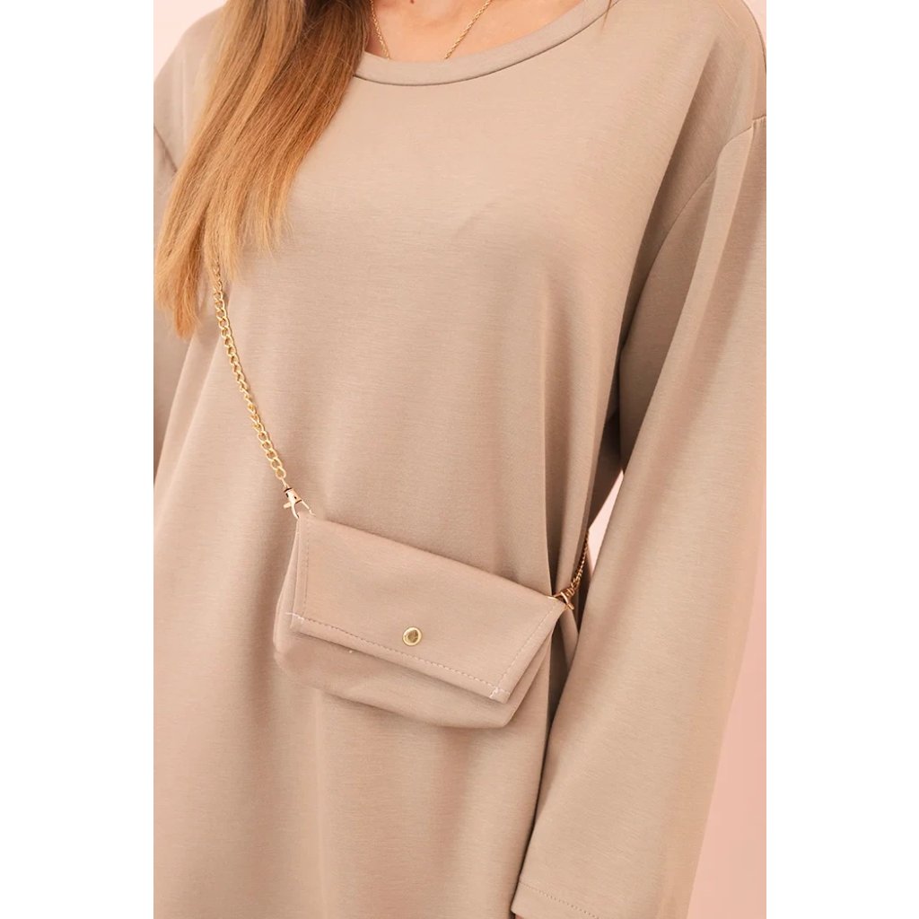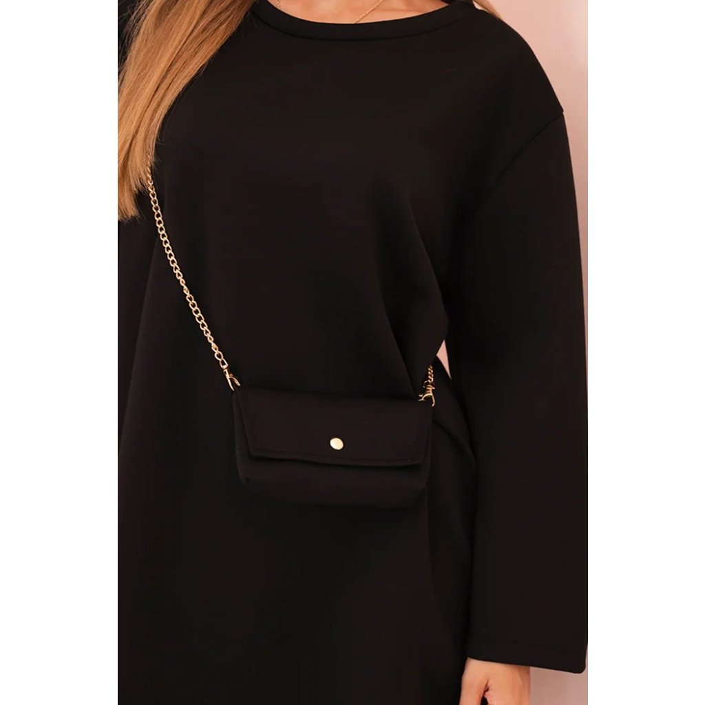 Detaily: taška na zlatém řetízku, dlouhý rukáv, kulatý výstřih