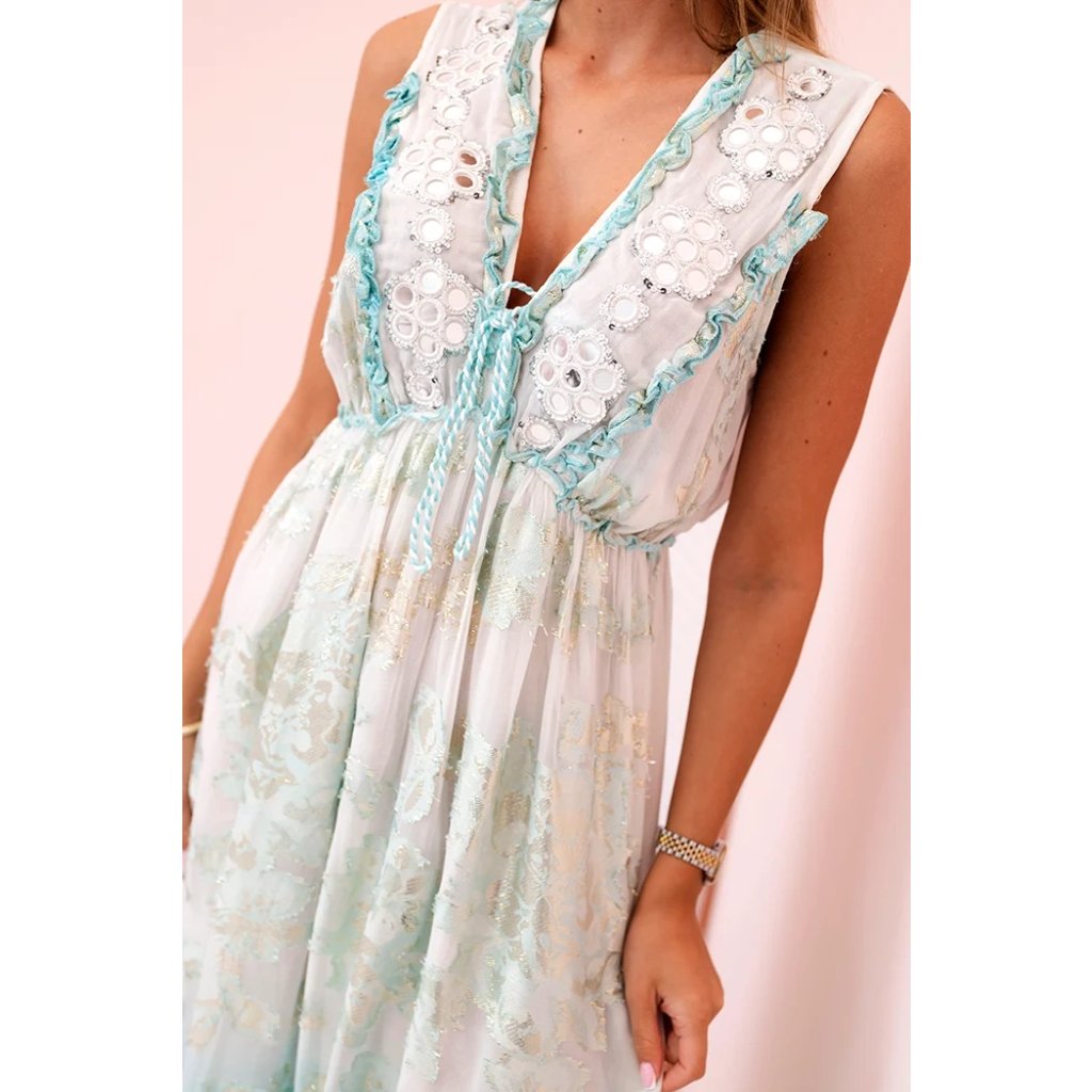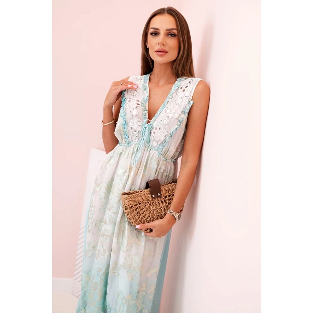 Pokud hledáte ideální šaty na letní dny, tyto dámské maxi šaty s výšivkou a hlubokým výstřihem jsou skvělou volbou. Lehký střih z viskózy krásně sedí na postavě a poskytuje maximální pohodlí i během horkých dnů. Vyšívané detaily na výstřihu dodávají šatům boho charakter a elastický pas zdůrazňuje ženskou postavu. Tento model je ideální na dovolenou, procházky po pláži nebo letní párty. Díky jedinečnému designu s módními romantickými prvky upoutá pozornost a dodá každému outfitu lehkost. Velikost je univerzální a vhodná pro ženy ve velikostech S, M nebo L.