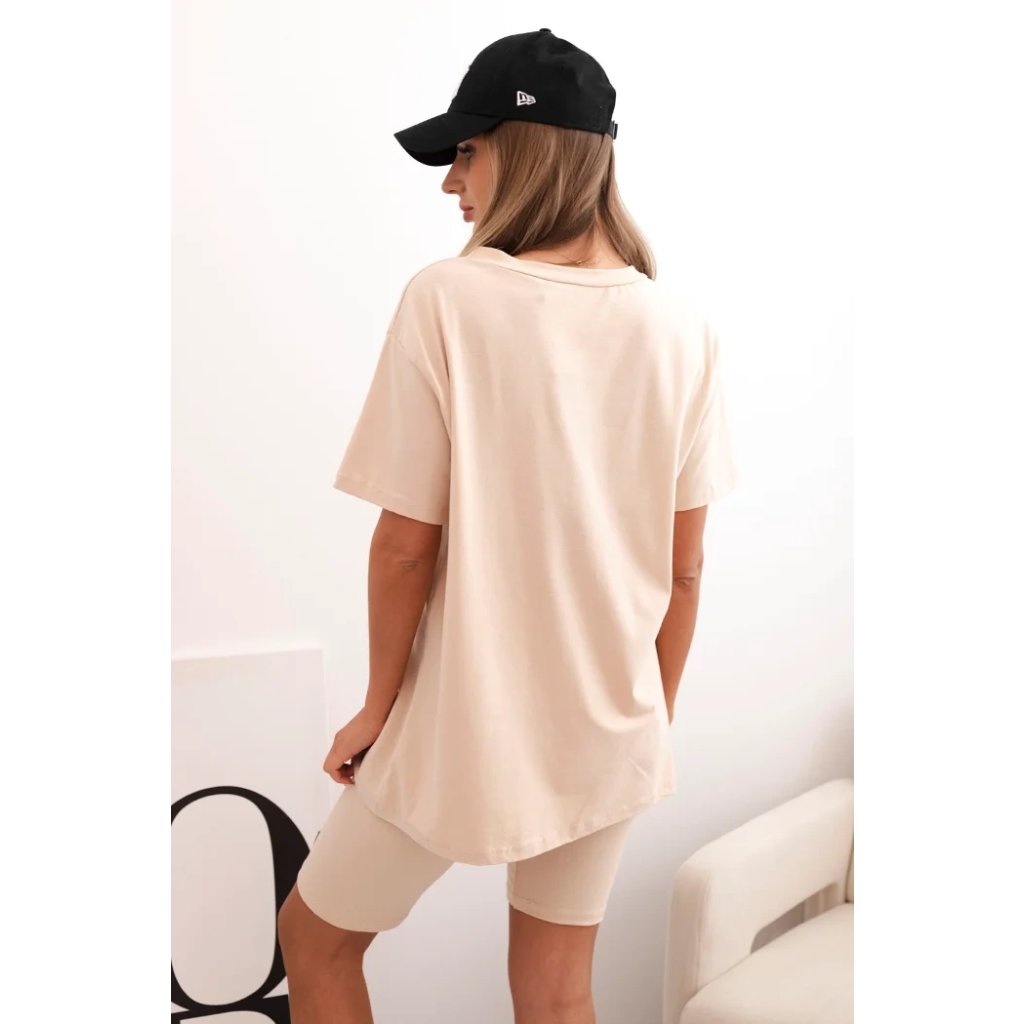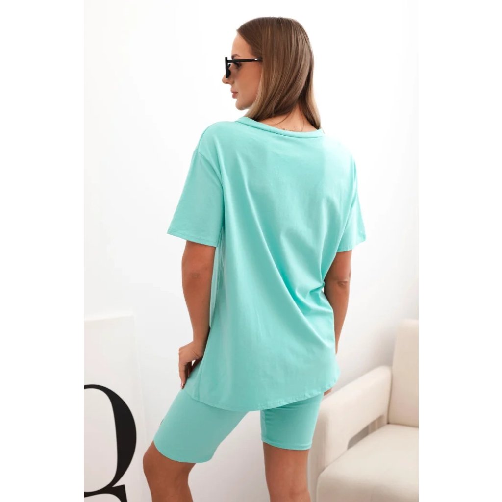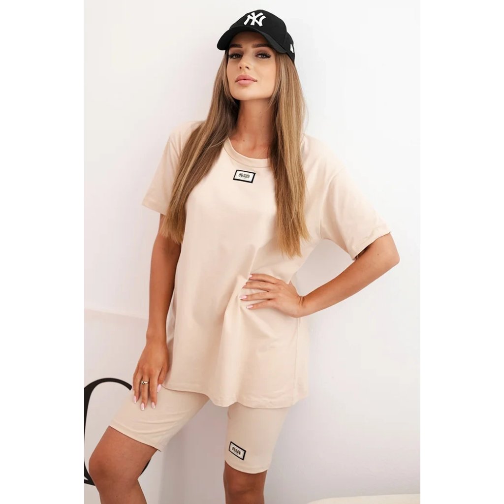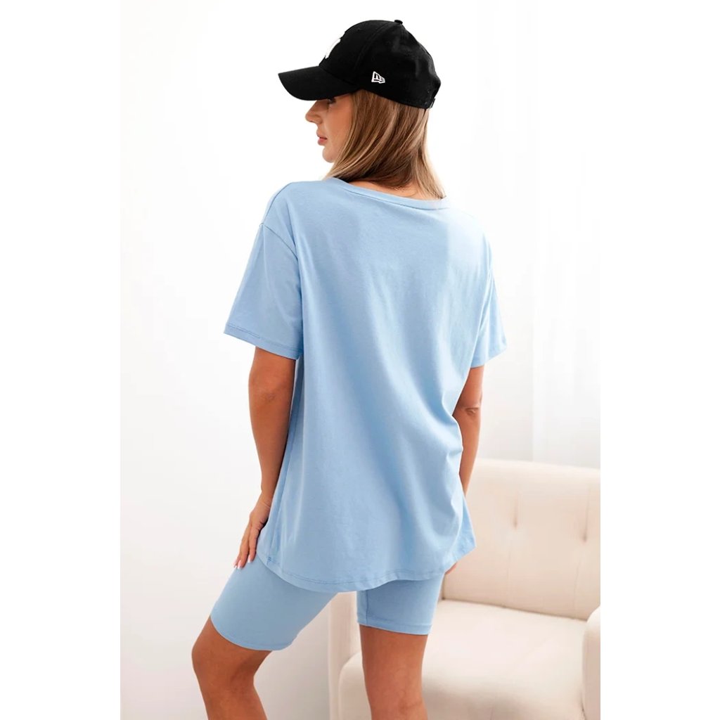 Souprava je ušitá z příjemné bavlny s přídavkem elastanu, což zajišťuje pružnost a pohodlí po celý den. Střih je volný a pohodlný, elastický pas šortek zajišťuje přizpůsobení postavě. Tričko má kulatý výstřih a jednoduchý střih, který se hodí do každého ležérního outfitu. Velikost je univerzální a vhodná pro ženy velikostí S, M nebo L.