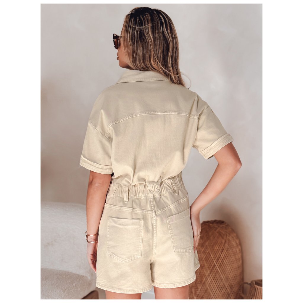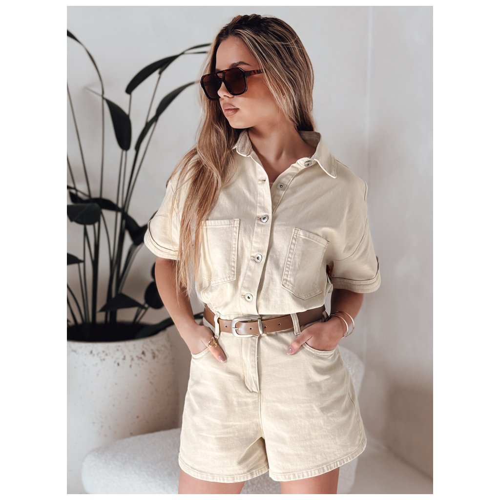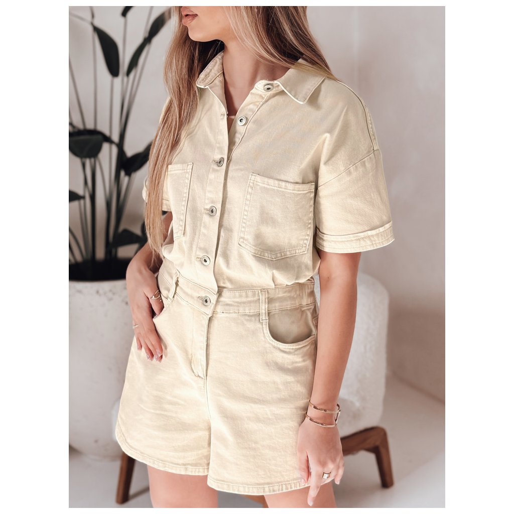 Tento krátký džínový overal je ideální volbou pro teplé dny. Klasický límec, zapínání na knoflíky a náprsní kapsy dodávají modelu charakter. Elastický pas a pásek decentně tvarují siluetu. Krátké rukávy a volný střih z něj činí pohodlnou volbu pro každodenní nošení v teplejších dnech.