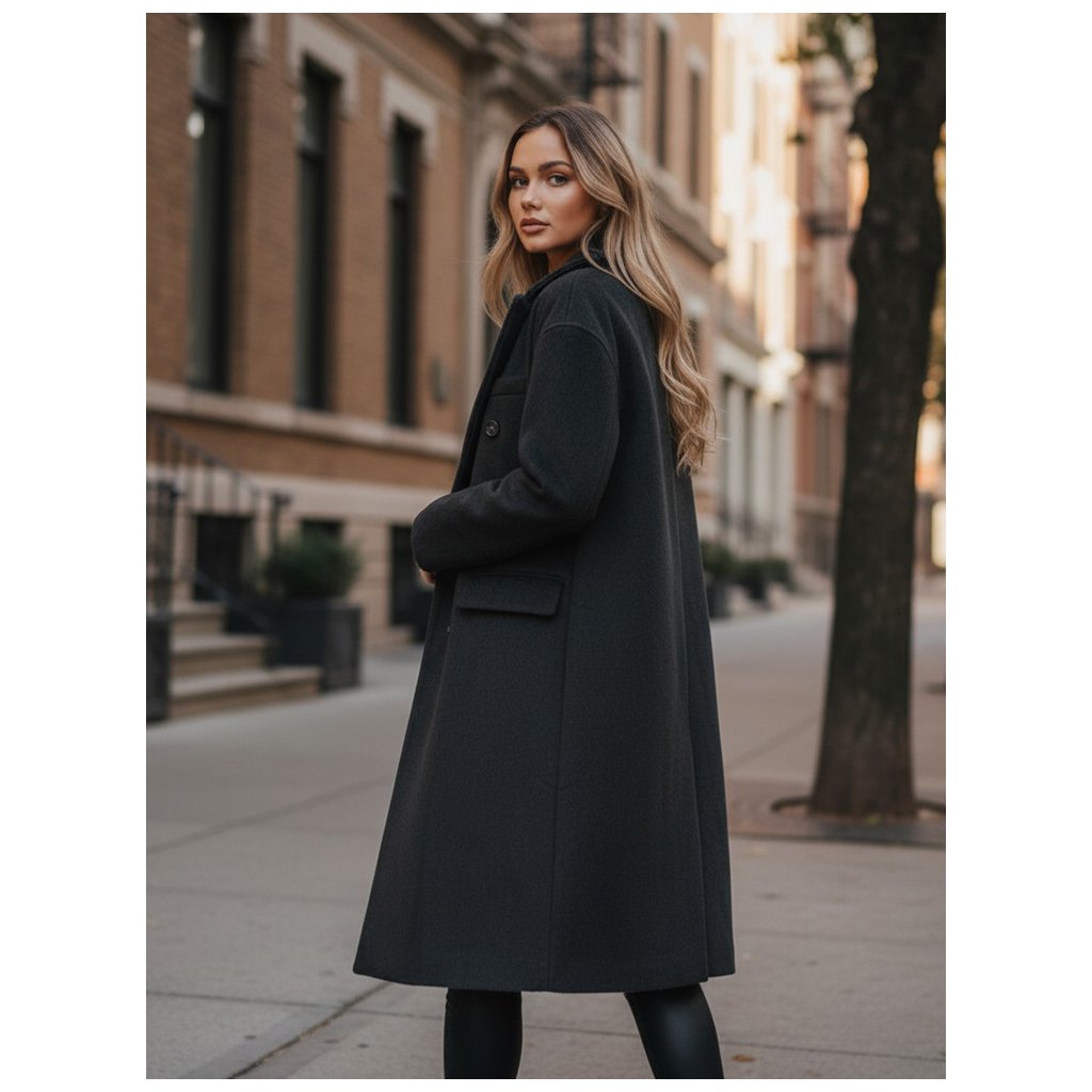 Tento klasický černý dámský kabát s mírně oversized střihem je nadčasovou volbou pro ženy, které oceňují eleganci a jednoduchost. Dvouřadé zapínání na knoflíky dodává kabátu elegantní nádech, zatímco široké klopy zdůrazňují stylový charakter. Rovný střih a lem po kolena zajišťují lichotivý střih a praktické klopy na kapsách zvyšují funkčnost.