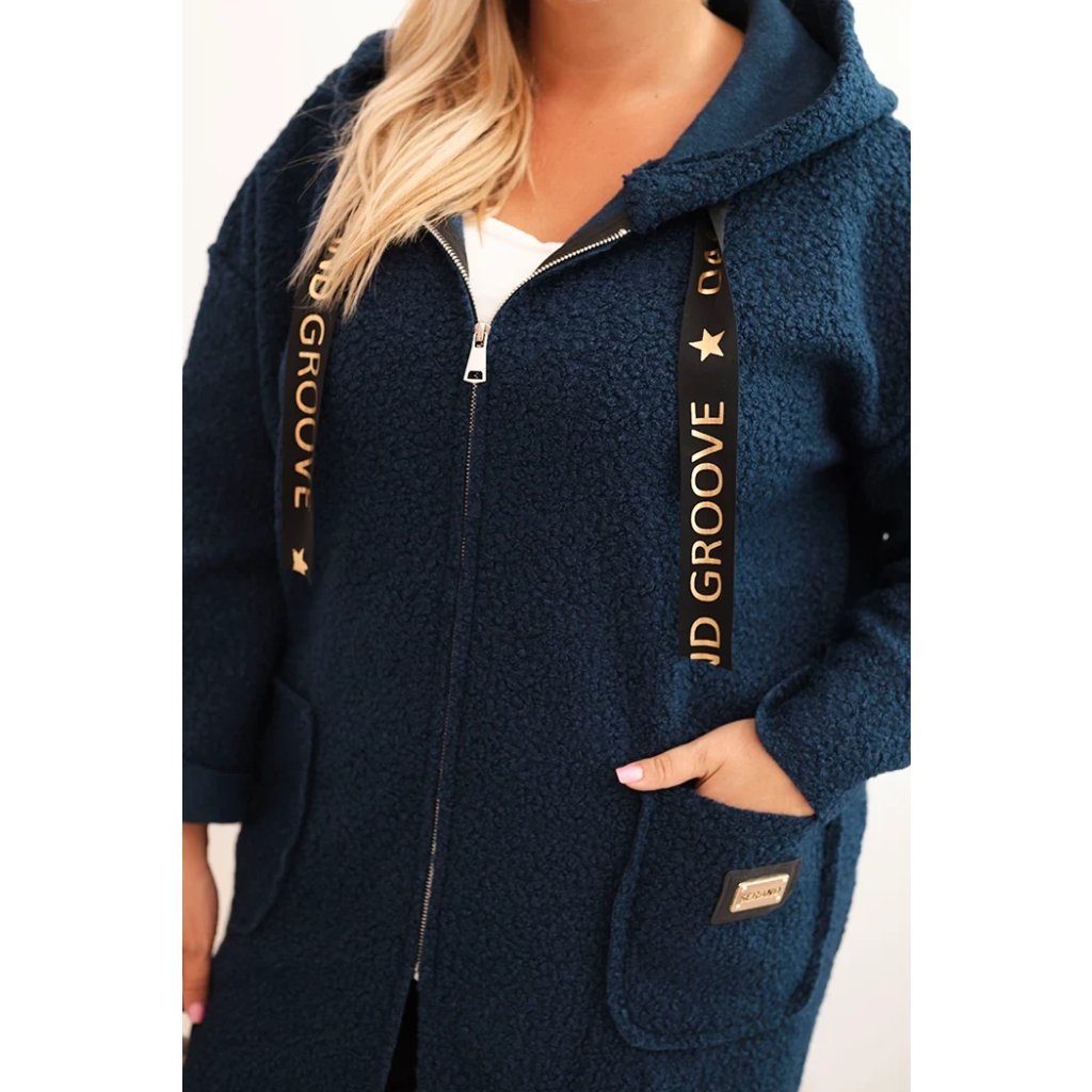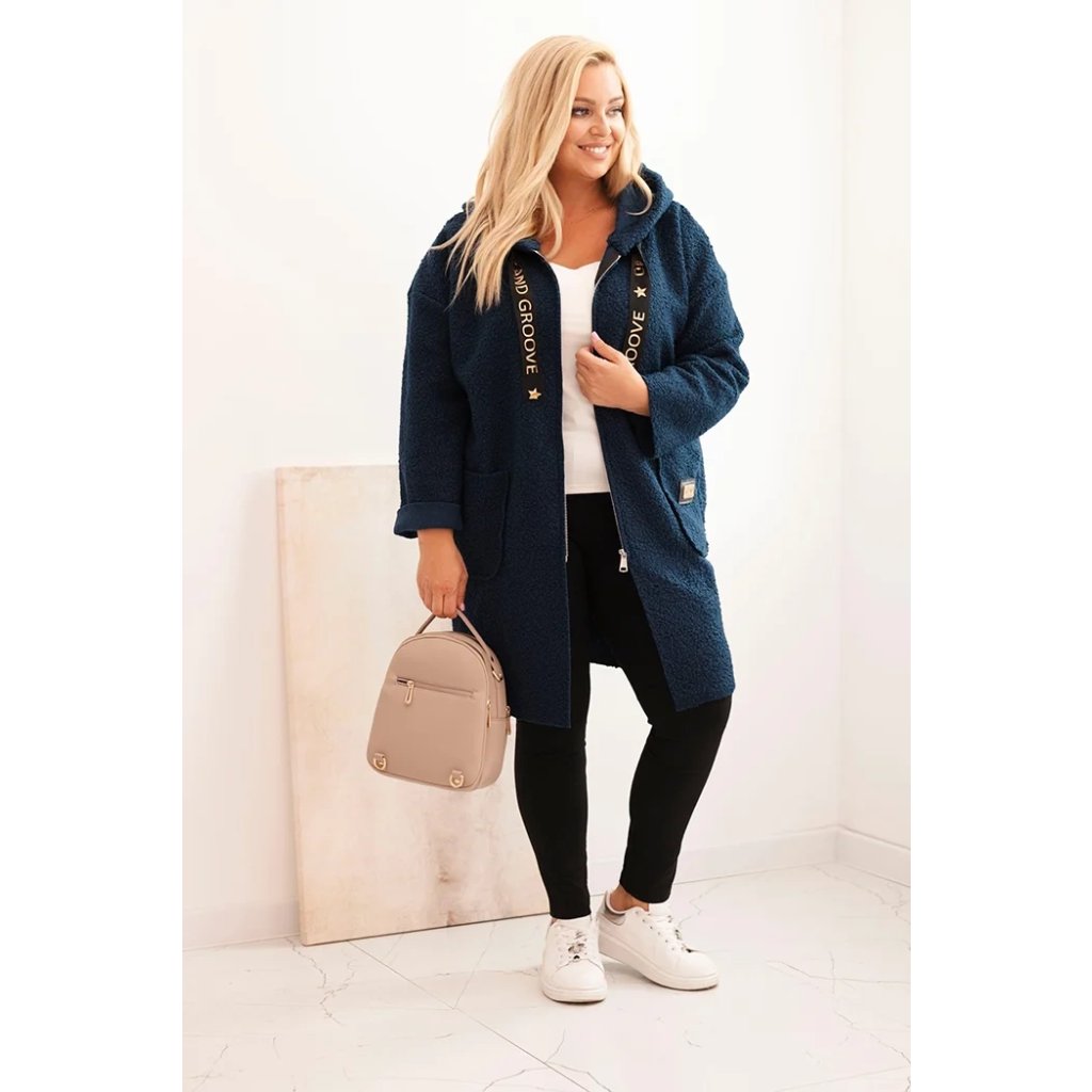 Dámský kabát Plus Size z umělého beránka s kapucí a kapsami modrý