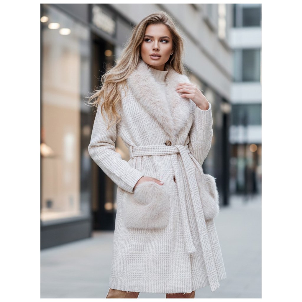 Dámský béžový kabát z umělé kožešiny TY5278Stylová dámská bunda s klasickou siluetou a elegantním lemováním z umělé kožešiny. Zapínání na knoflíky a další pásek v pase zajišťují pohodlné nošení. Velké boční kapsy lemované umělou kožešinou dodávají kabátu osobitý charakter a zvyšují pohodlí. Měkký límec z umělé kožešiny dodává hřejivost a podtrhuje ženský vzhled.