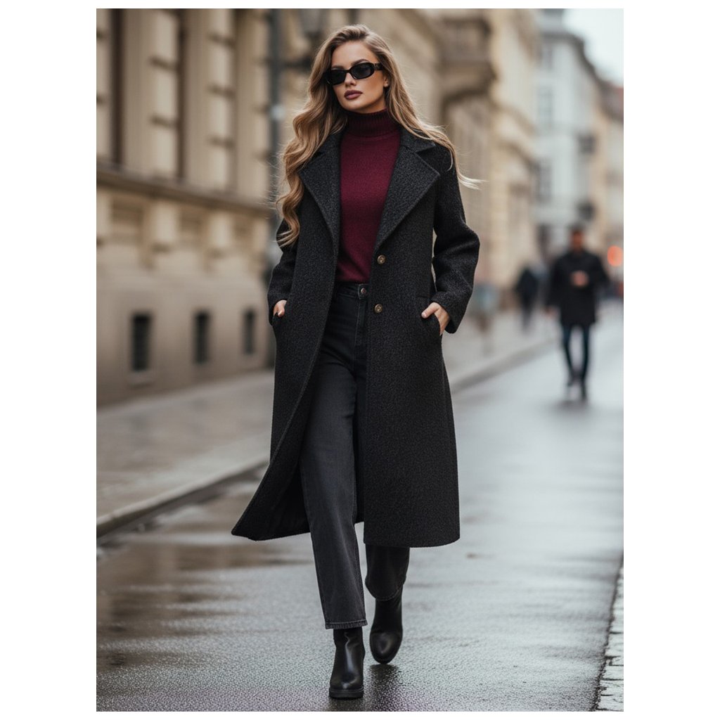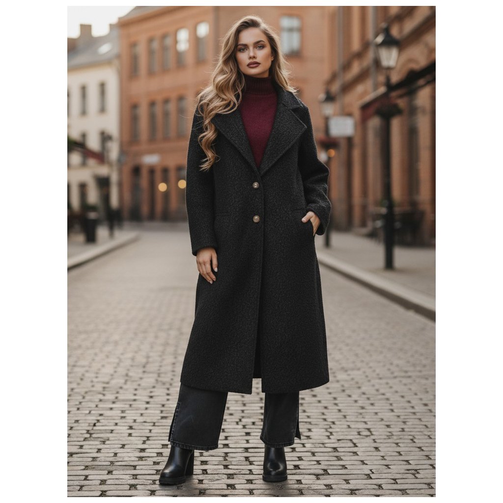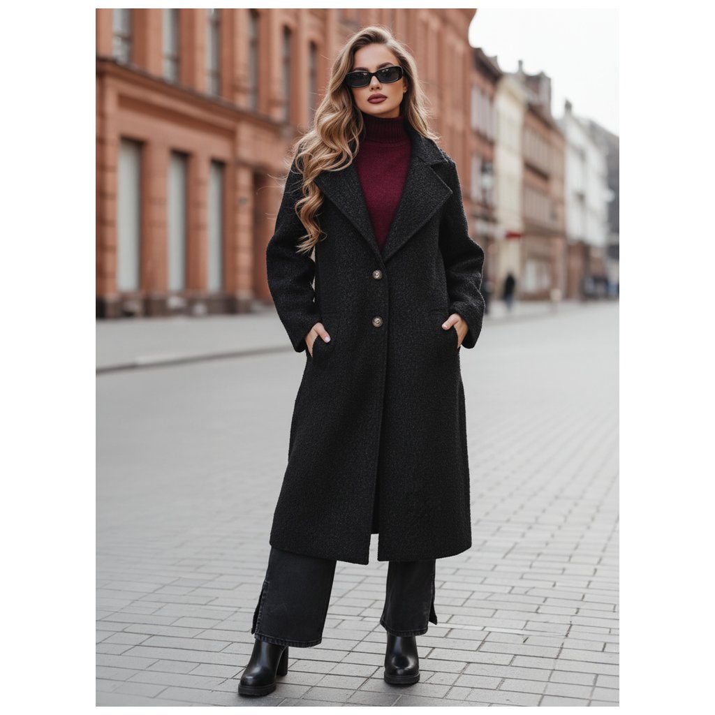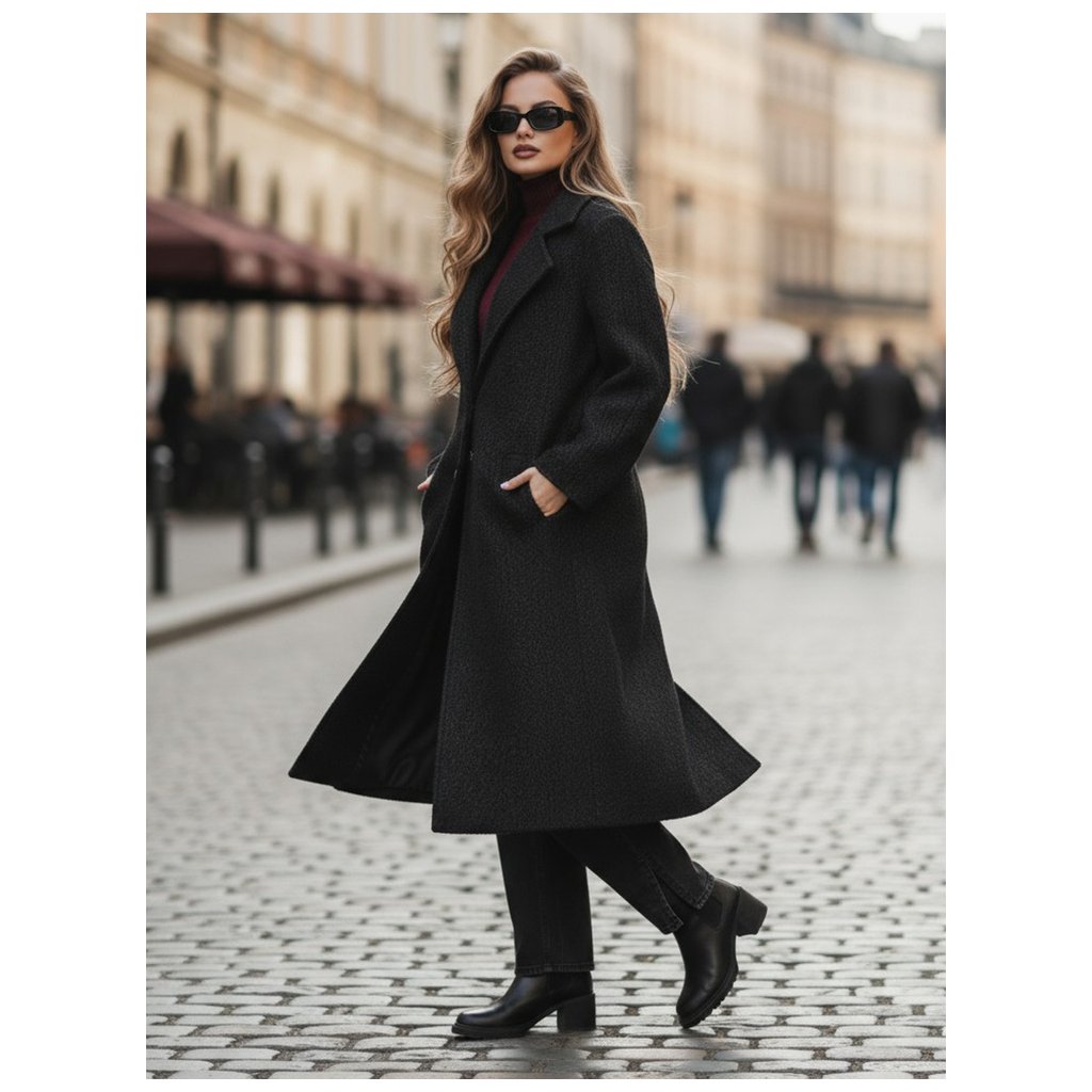 Tento černý dámský kabát z ovčí kůže je ideální pro ženy, které oceňují pohodlí a moderní styl. Měkká textura látky a mírně nadměrný střih krásně splývají a dodávají celkovému vzhledu ležérní nádech. Klasický límec se širokými klopami dodává eleganci, zatímco praktické kapsy zvyšují funkčnost kabátu.