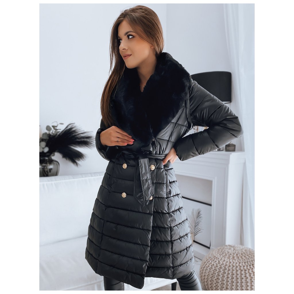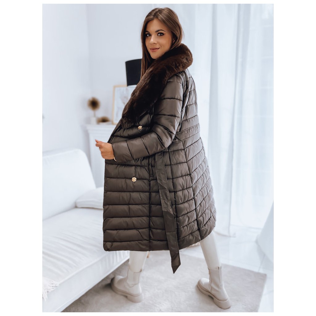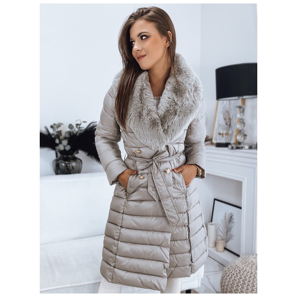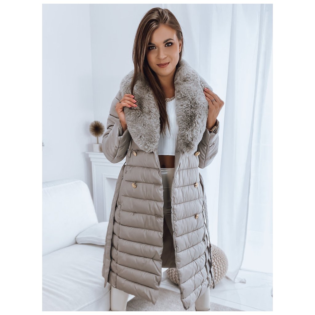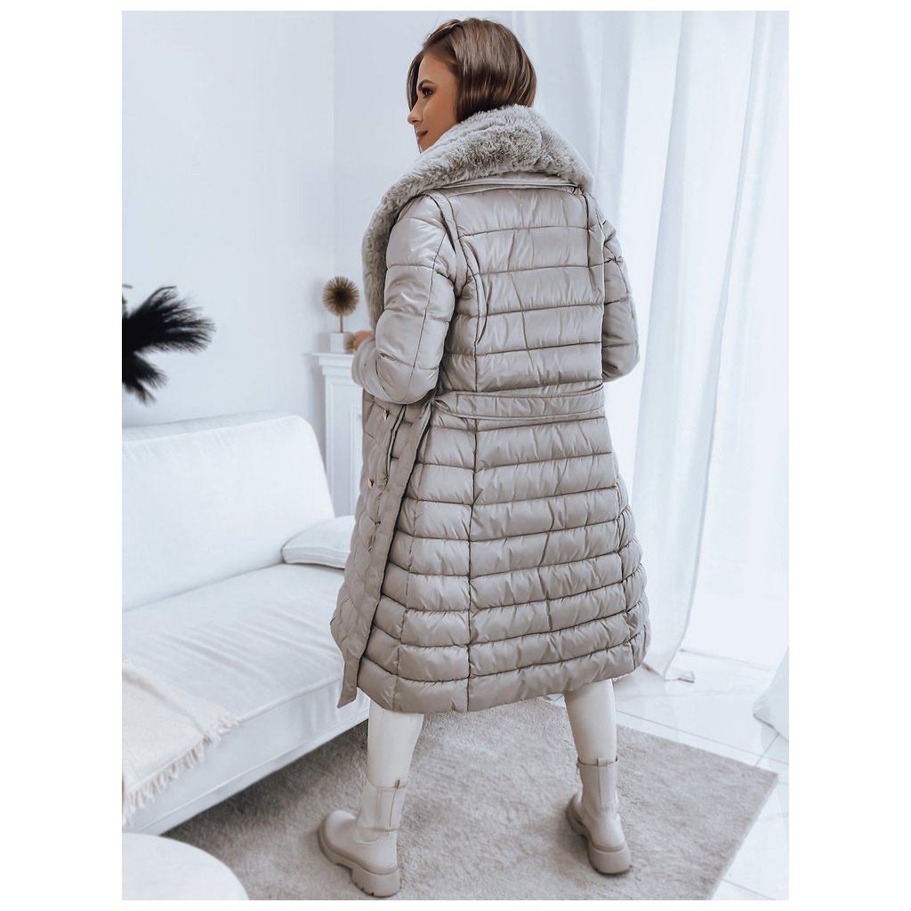 Jedinečný model, který plní stejné funkce kabátu a vesty díky odepínacím rukávům. Kožešina je také odepínací, takže můžeme vytvářet sportovní i elegantní stylizace. Zapínání na ozdobné knoflíky. V pase má zavazování, díky kterému skvěle zdůrazní ženskou postavu. Model je dodáván s páskem stejné barvy.