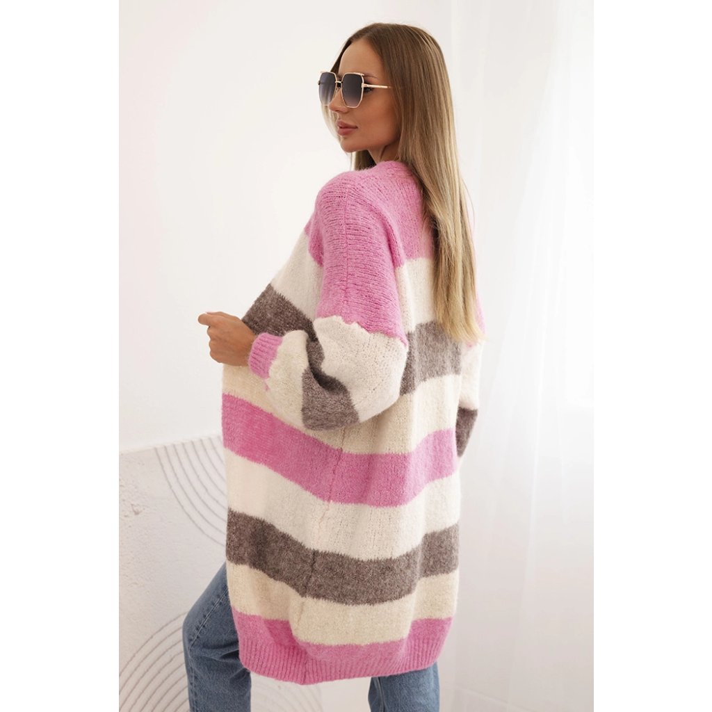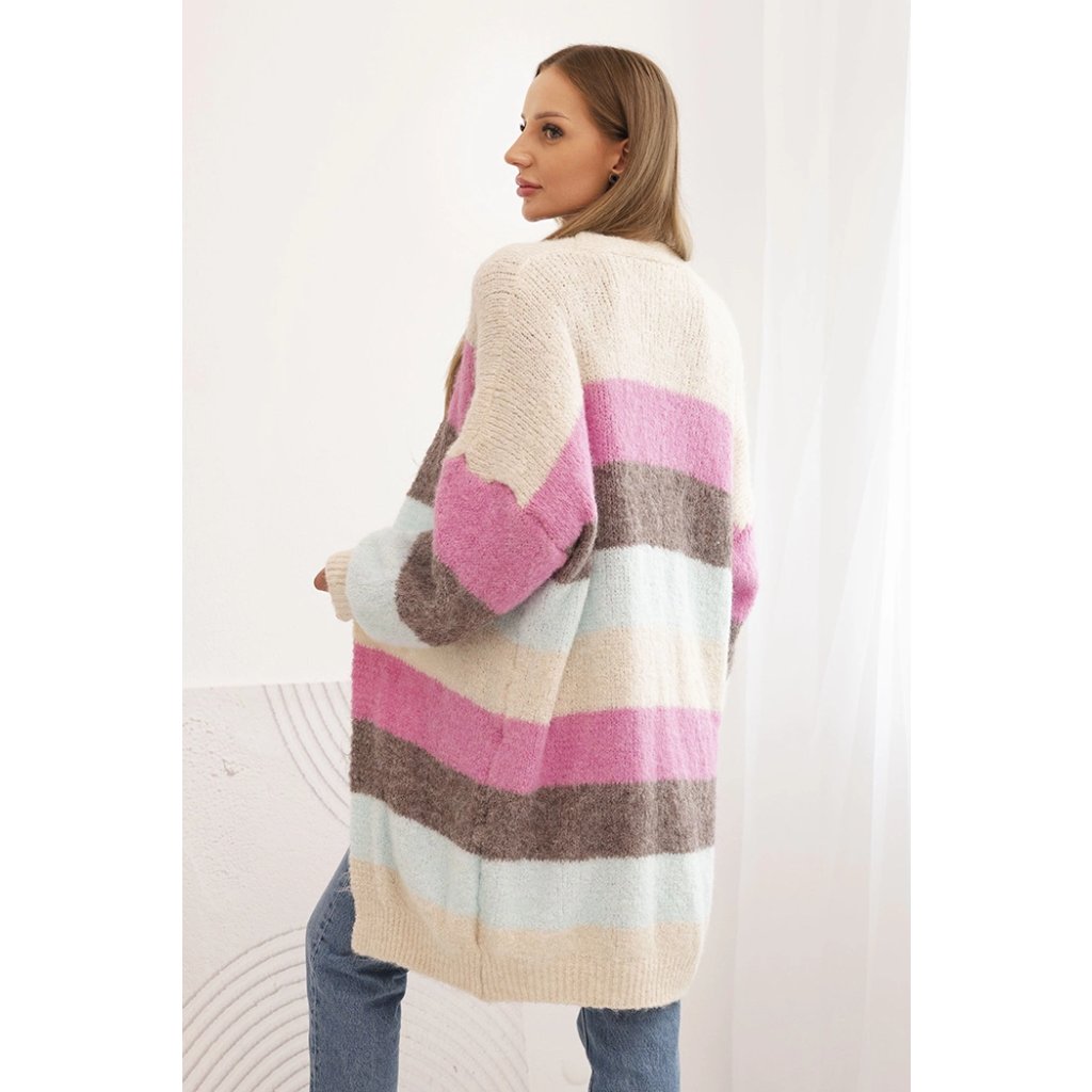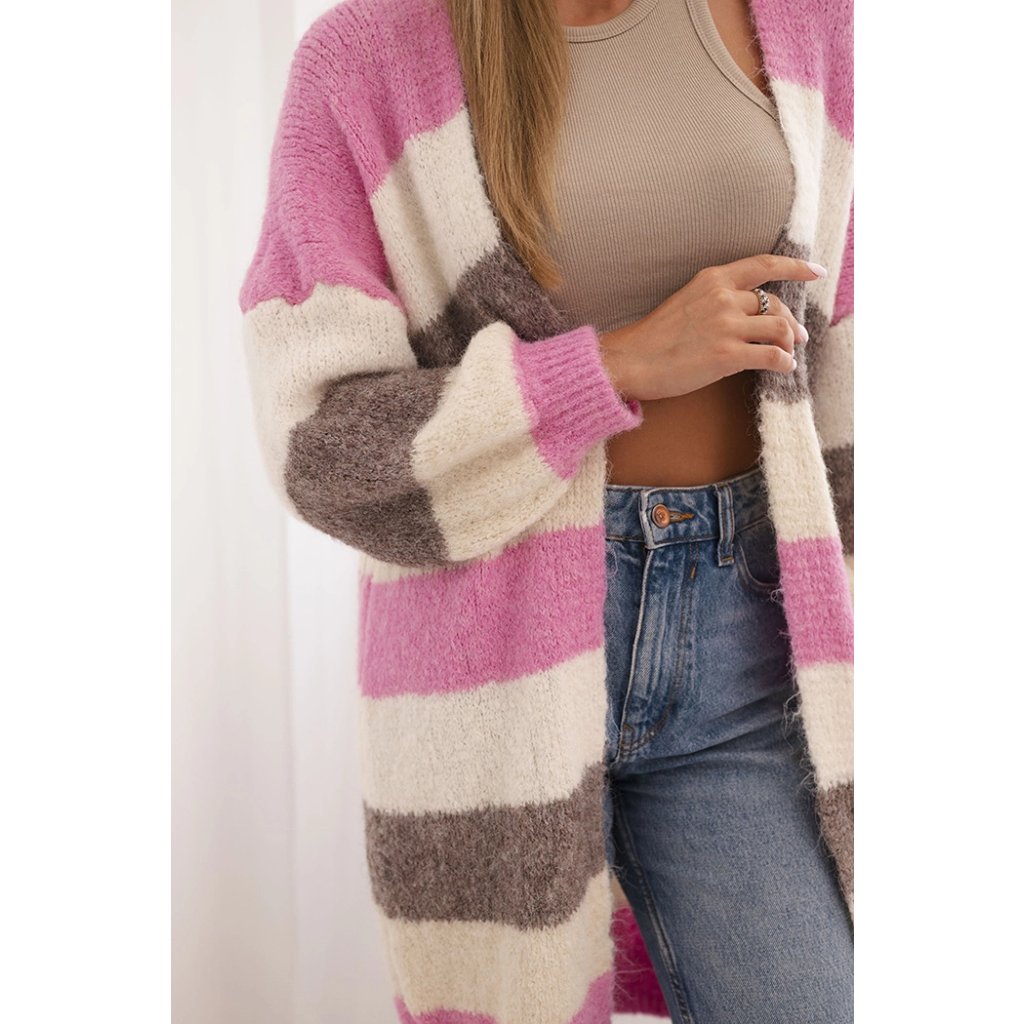 Tento dámský kardigan s příměsí vlny je ideální volbou na chladnější dny. Vzor v širokých, barevných pruzích přitahuje pozornost a dodává stylizaci moderní charakter. Volný, otevřený střih zajišťuje, že svetr se skvěle přizpůsobí postavě a hodí se k mnoha každodenním outfitům.