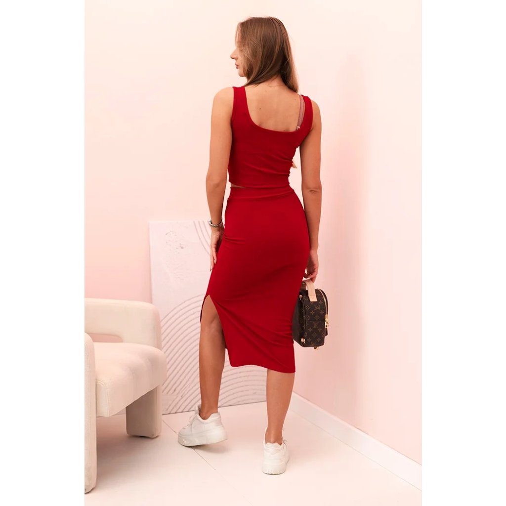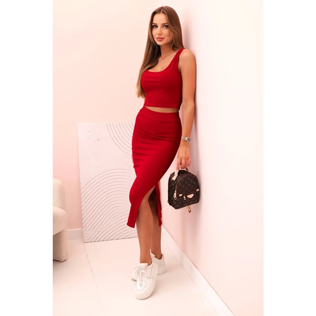 Tento stylový dámský komplet je ideálním řešením pro teplejší dny! Skládá se z přiléhavého topu se širokými ramínky a midi sukně s rozparkem na boku. Vyrobený z žebrovaného, elastického materiálu, který se skvěle přizpůsobí postavě a poskytuje pohodlí po celý den. Skvěle se hodí na každodenní nošení, na letní procházky nebo setkání s přáteli. Tento set spojuje módní vzhled s pohodlím – top zvýrazňuje linii ramen a sukně odhaluje nohy díky ženskému rozparku. Celek působí moderně a dívčím dojmem. Italská výroba zaručuje vysokou kvalitu zpracování a styl podle nejnovějších trendů.