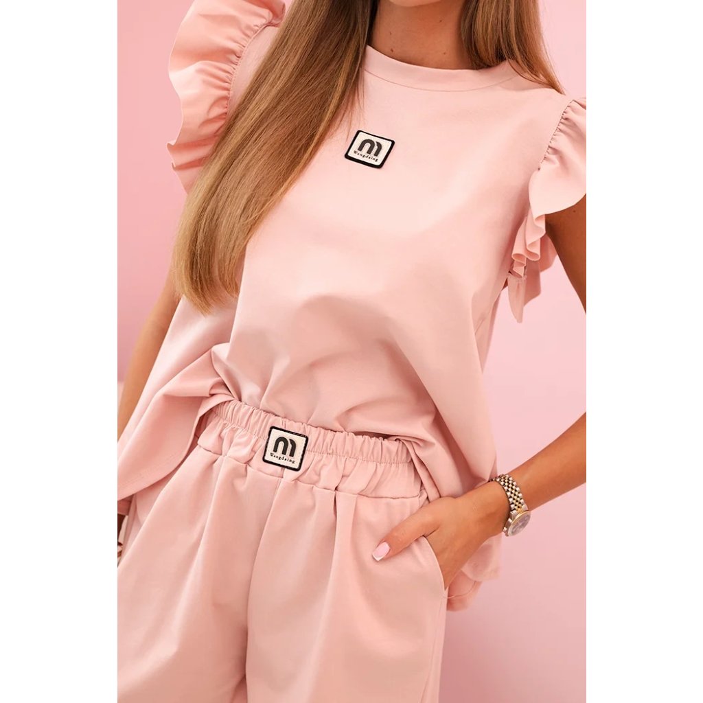Stylová dámská souprava, ideální na teplé dny! Skládá se z lehké halenky s roztomilými volánky na ramenou a přiléhavých šortek s pohodlnou gumičkou v pase. Halenka má klasický, jednoduchý střih s kulatým výstřihem a ozdobnou nášivkou, která dodává celku módní charakter. Šortky s volnými nohavicemi zajišťují volnost pohybu a pohodlí po celý den. Tato souprava je skvělou volbou na letní procházky, setkání s přáteli nebo prázdninové výlety. Díky univerzálnímu střihu a módnímu designu ji snadno zkombinujete se sportovními teniskami, sandály nebo espadrilkami.