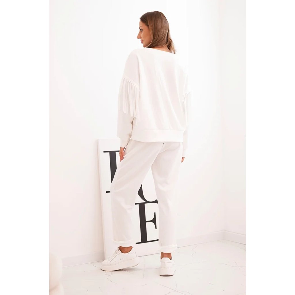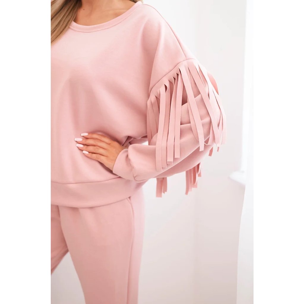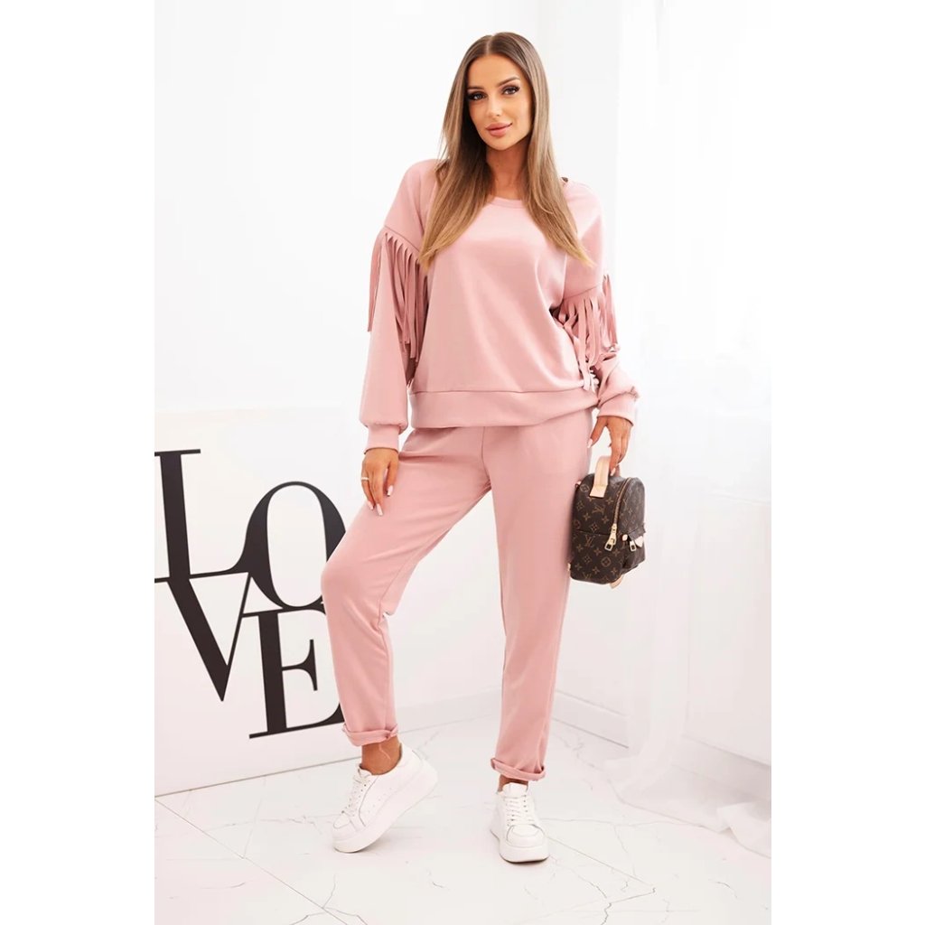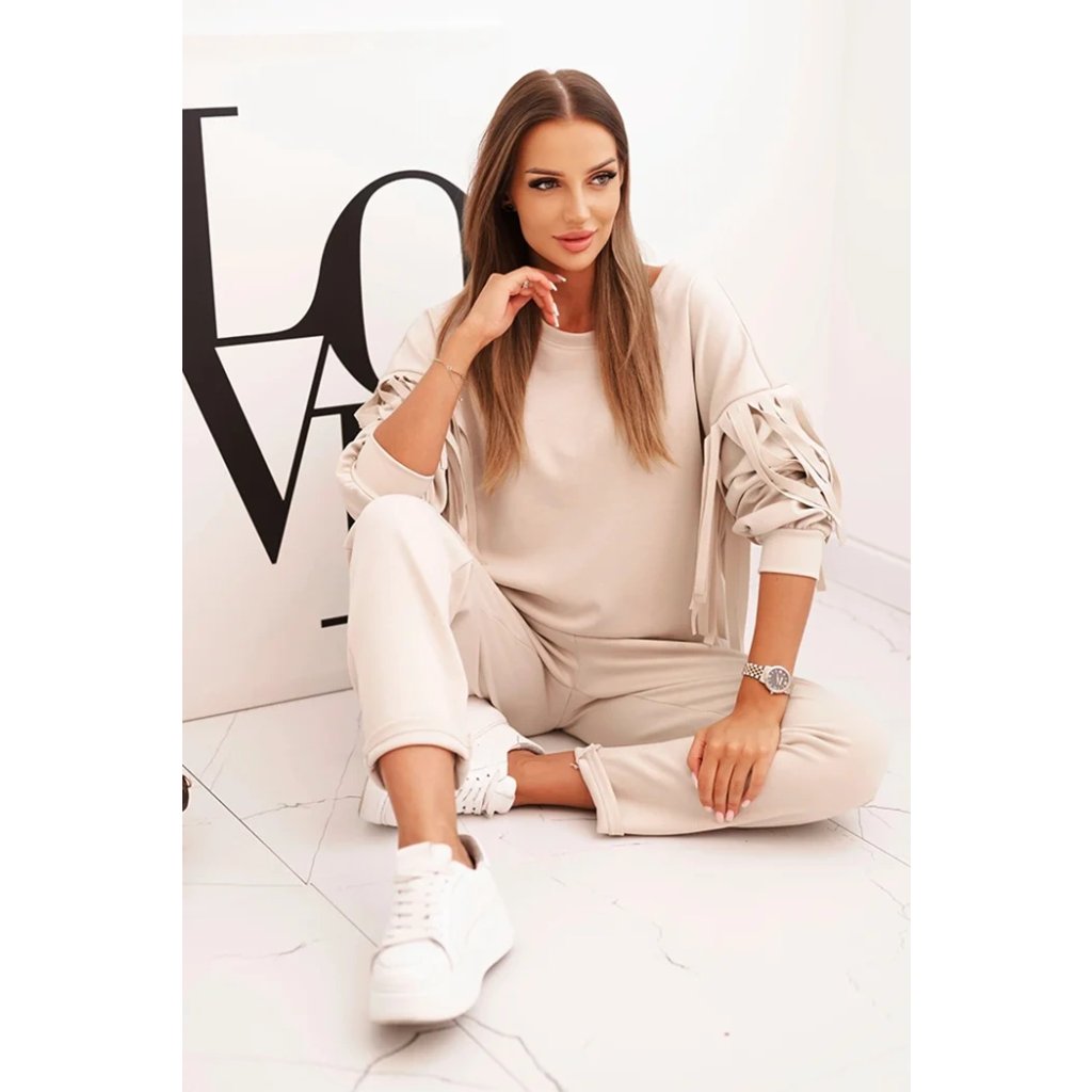 - Elegantní dámský komplet v máslové barvě je kombinací pohodlí a módního designu. Mikina volného střihu je ozdobena efektními třásněmi na rukávech, které jí dodávají výjimečný charakter. Vyrobena z příjemného na dotek, elastického úpletu, zajišťuje volnost pohybu a komfort nošení. Kalhoty s elastickým pasem a regulací na šňůrku zaručují dokonalé přizpůsobení, a jejich jednoduchý střih skvěle ladí s mikinou. Tento komplet se hodí jak do každodenních stylizací, tak při setkání s přáteli.