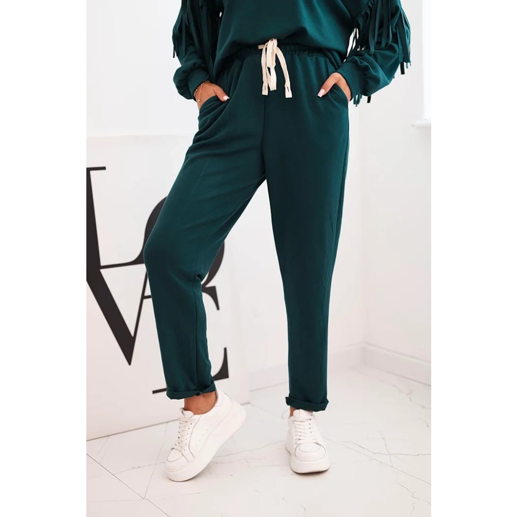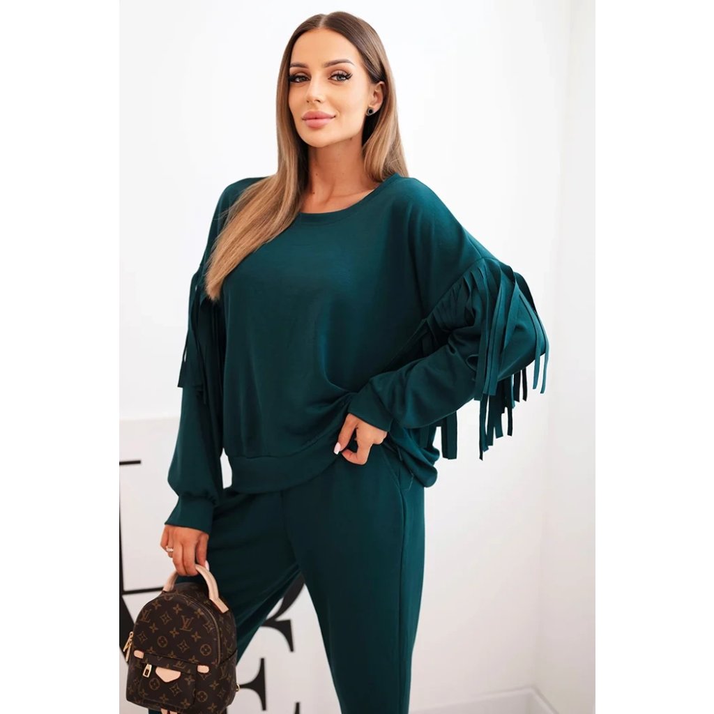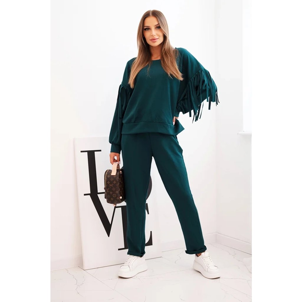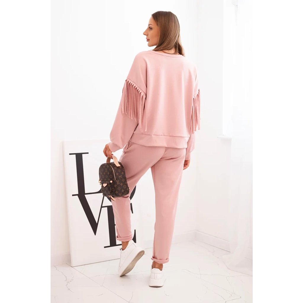 - Elegantní dámský komplet v máslové barvě je kombinací pohodlí a módního designu. Mikina volného střihu je ozdobena efektními třásněmi na rukávech, které jí dodávají výjimečný charakter. Vyrobena z příjemného na dotek, elastického úpletu, zajišťuje volnost pohybu a komfort nošení. Kalhoty s elastickým pasem a regulací na šňůrku zaručují dokonalé přizpůsobení, a jejich jednoduchý střih skvěle ladí s mikinou. Tento komplet se hodí jak do každodenních stylizací, tak při setkání s přáteli.