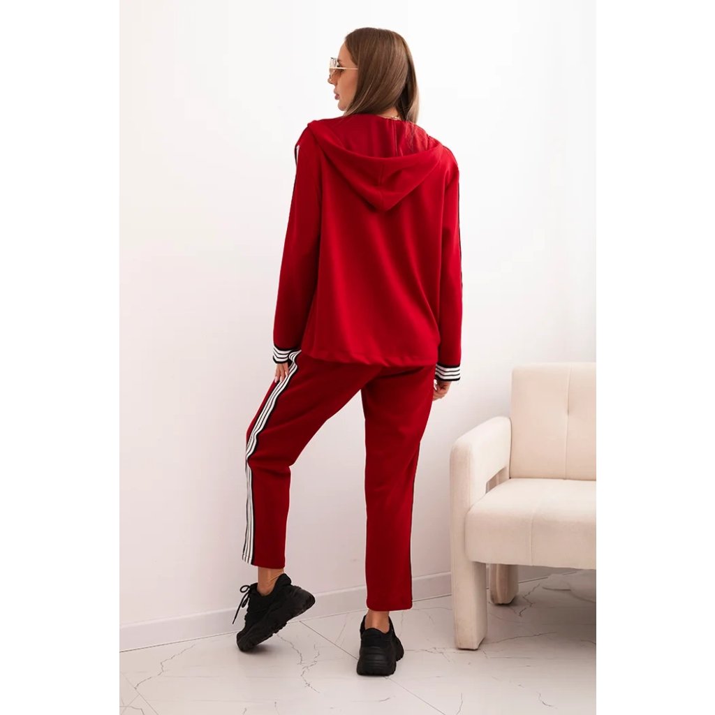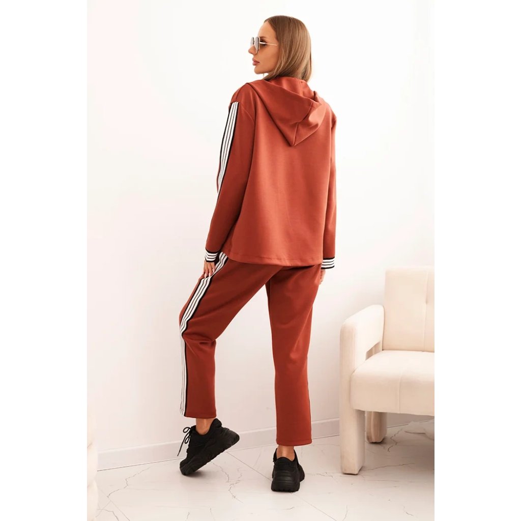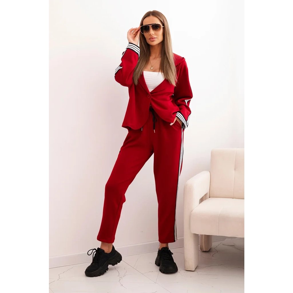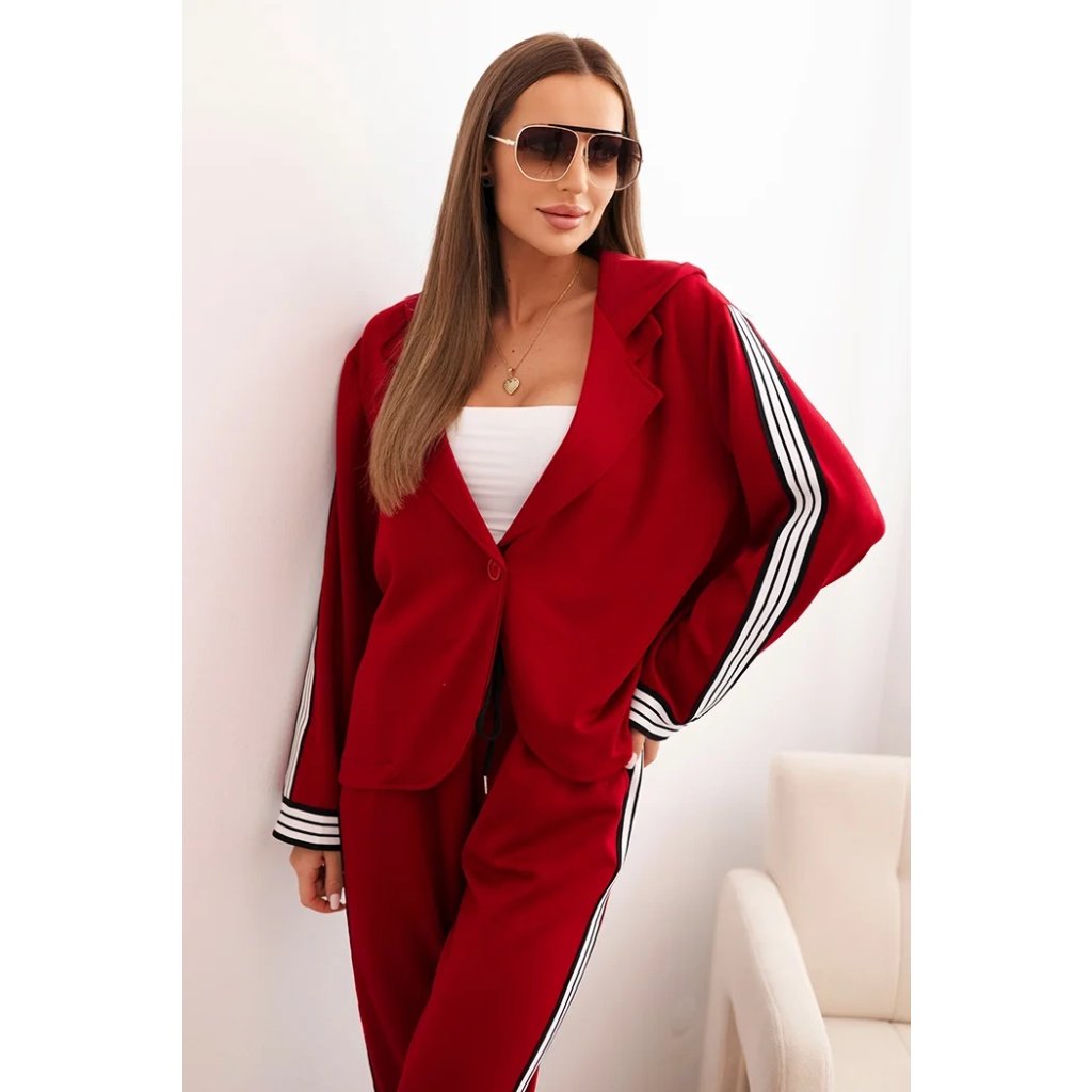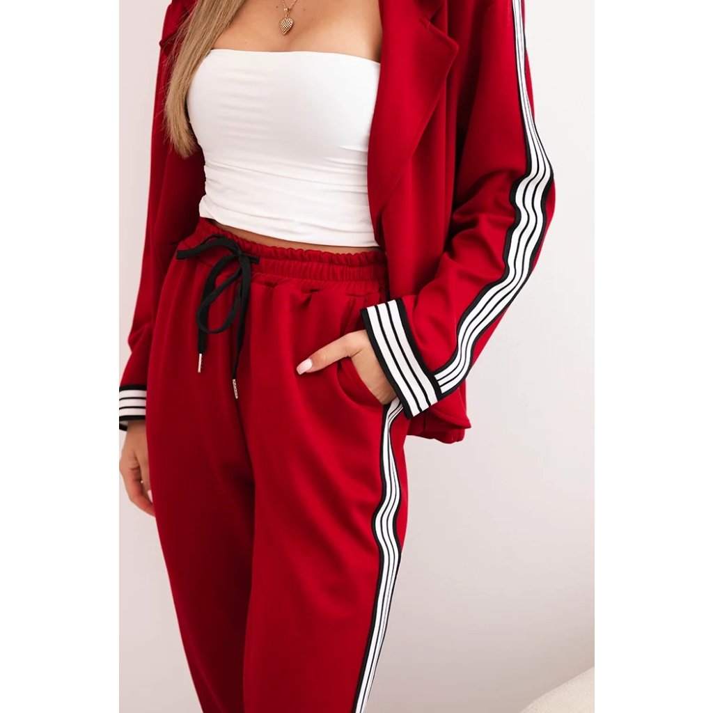 Moderní dámská souprava s viskózou je ideálním řešením pro ženy, které ocení módu a pohodlí v jednom. Sportovní sako volného střihu s kontrastními lampasy na rukávech skvěle ladí s kalhotami s elastickým pasem a bočními lampasy. Celkově vytváří casual, ale zároveň stylový outfit, který se hodí jak na každodenní nošení, tak do méně formálních stylizací do práce nebo na schůzku.