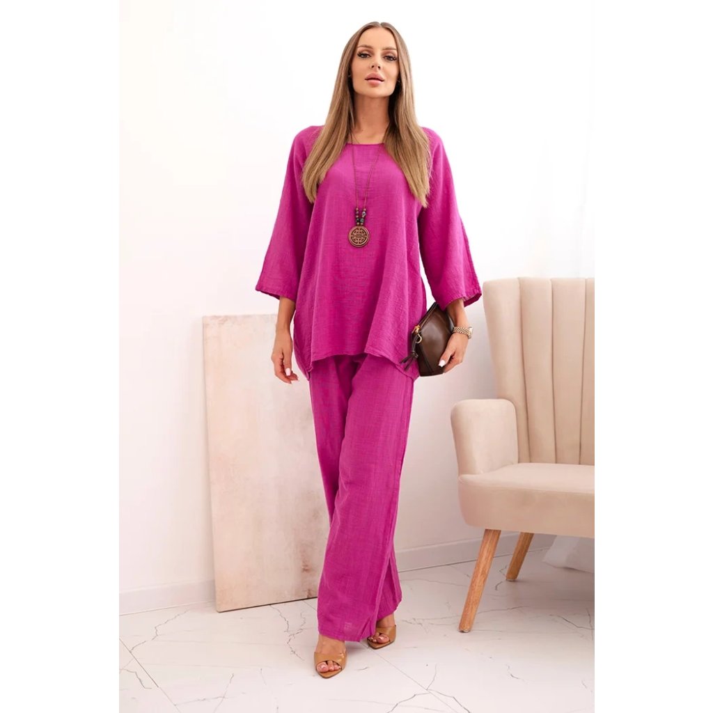 Stylový dámský komplet skládající se z lehké blůzky s rukávem 3/4 a širokých kalhot s vázáním v pase, který se skvěle hodí na každodenní nošení a do casualových stylizací. Blůzka je ozdobena elegantním náhrdelníkem, který dodává celku výjimečný charakter a podtrhuje přirozený, subtilní styl. Vyrobeno ze měkké viskózy, zajišťuje pohodlí nošení a prodyšnost i v teplejších dnech. Kalhoty s širokou nohavicí zaručují volnost pohybu a módní vzhled. Velikost je univerzální a bude vhodná pro dámy ve velikosti S, M nebo L.