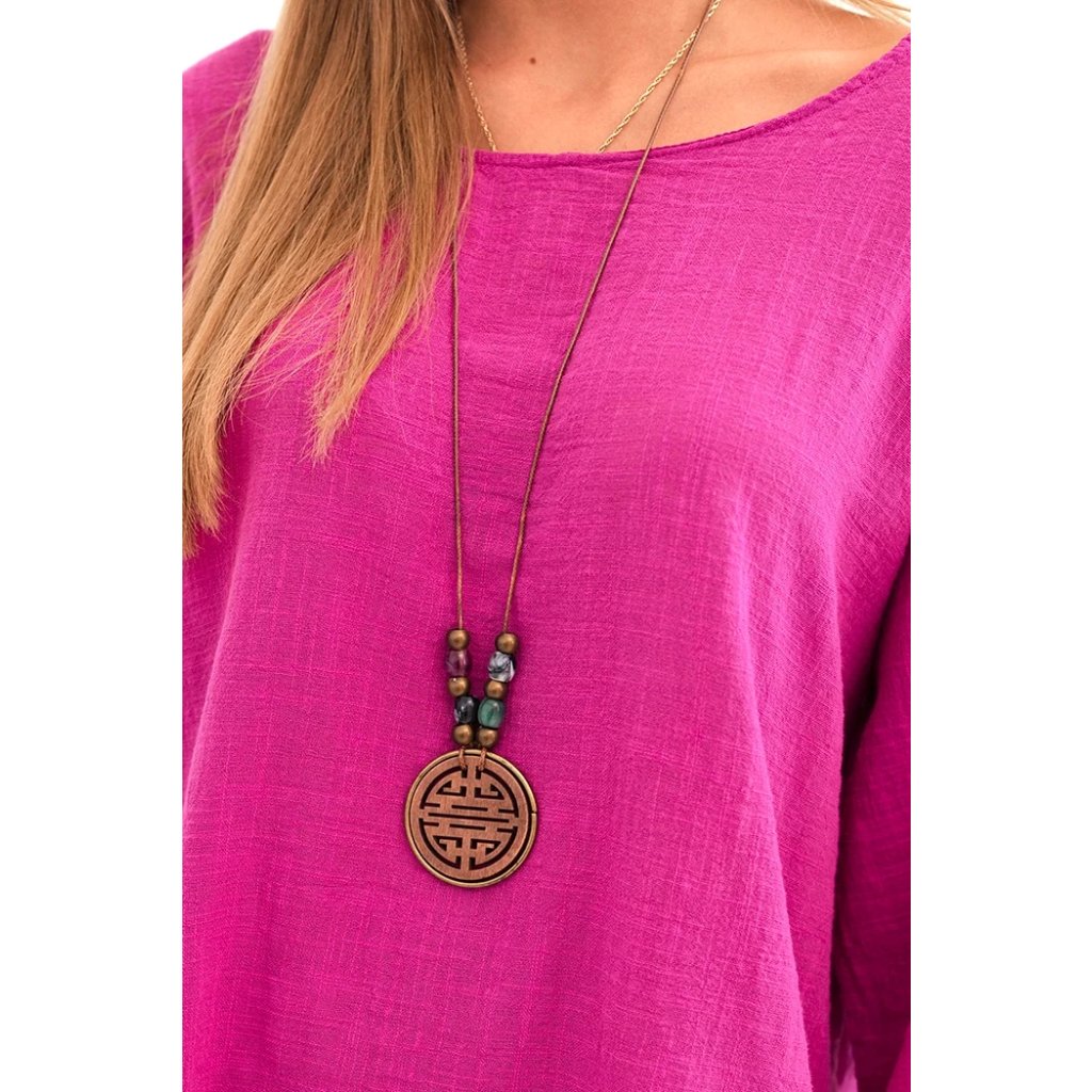 - Blůzka s rukávem 3/4, ozdobená náhrdelníkem na šňůrce
