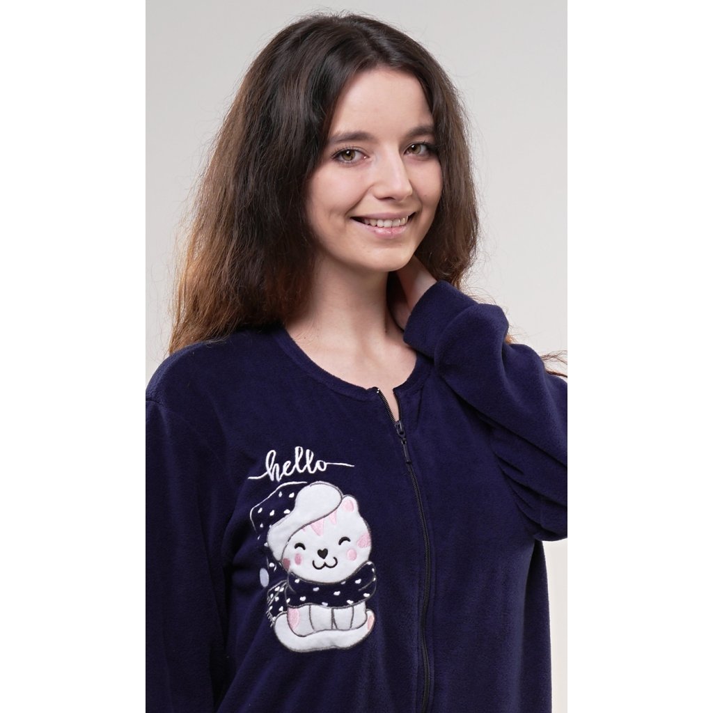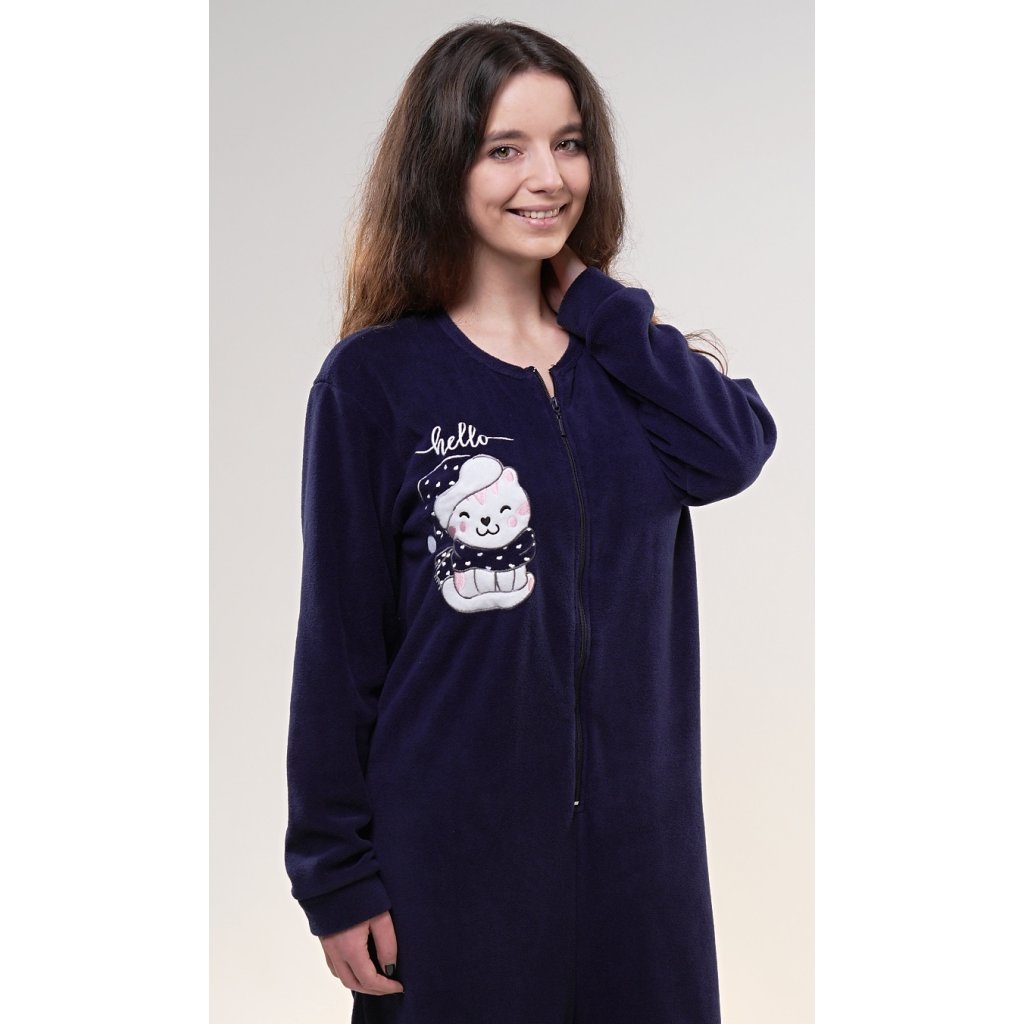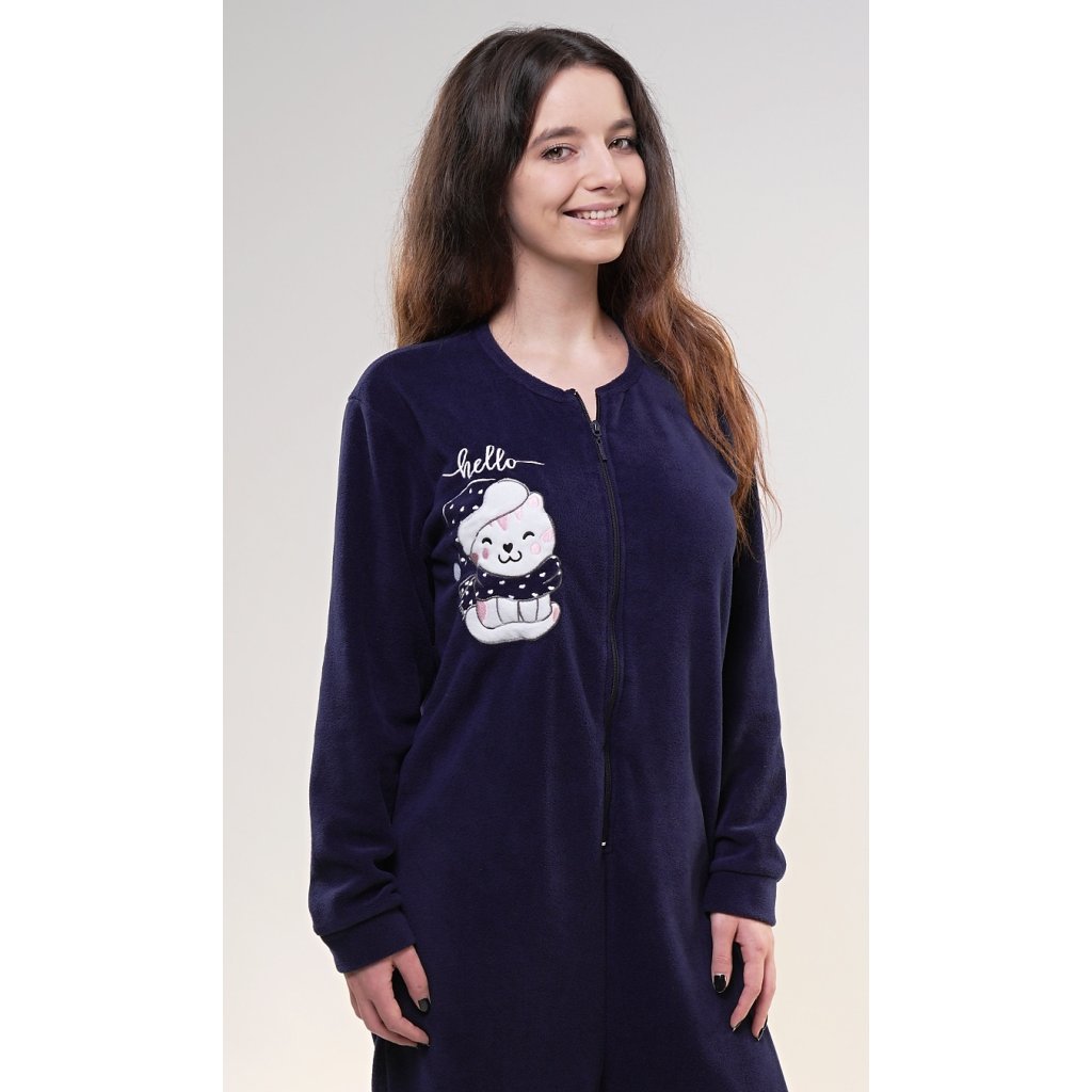 Dámský polarový overal Kočka. Dámský overal má kulatý výstřih a zapínání na zip. Rukávy a kalhoty jsou zakončeny praktickými lemy. Decentní overal zdobí aplikace s motivem koťete, které má na sobě čepici a šálu pro zahřátí. Na tmavě modrém podkladu je vyšitý nápis 'Hello'. Použitý materiál je hřejivý a poddajný na dotek, obzvláště ho oceníte v chladných zimních dnech.