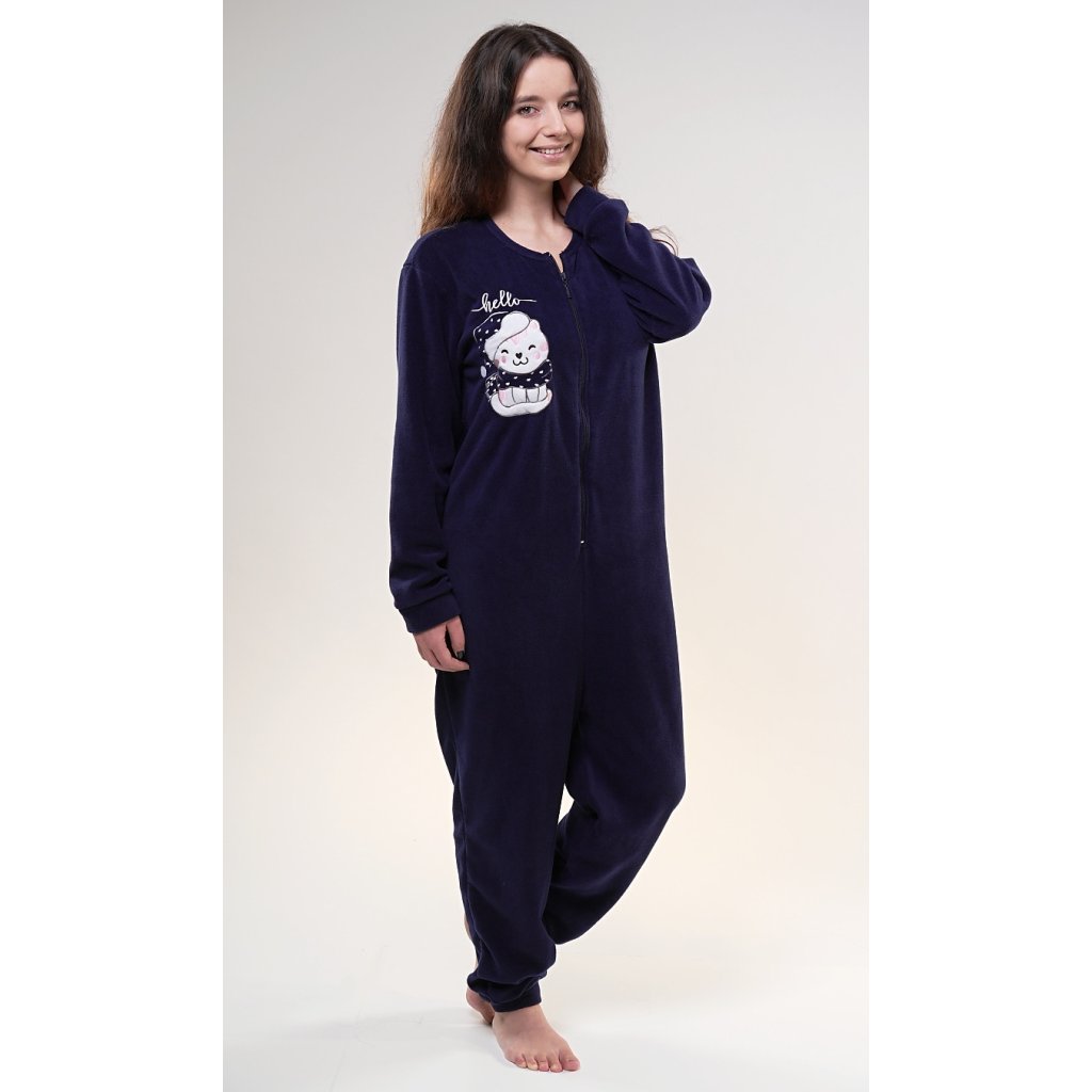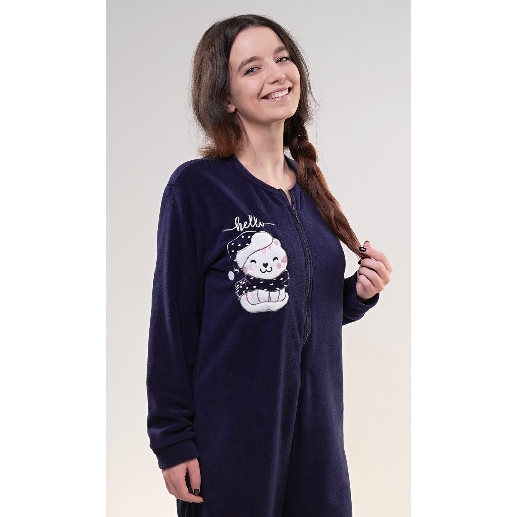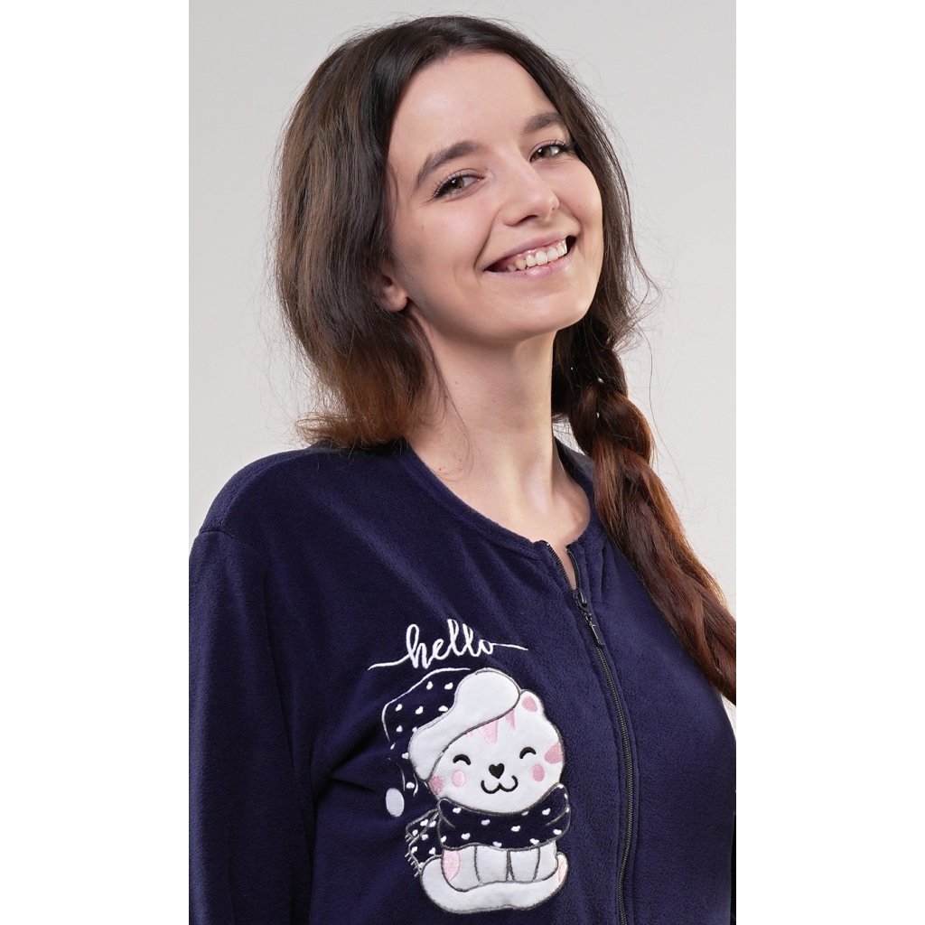 Dámský polarový overal Kočka. Dámský overal má kulatý výstřih a zapínání na zip. Rukávy a kalhoty jsou zakončeny praktickými lemy. Decentní overal zdobí aplikace s motivem koťete, které má na sobě čepici a šálu pro zahřátí. Na tmavě modrém podkladu je vyšitý nápis 'Hello'. Použitý materiál je hřejivý a poddajný na dotek, obzvláště ho oceníte v chladných zimních dnech.