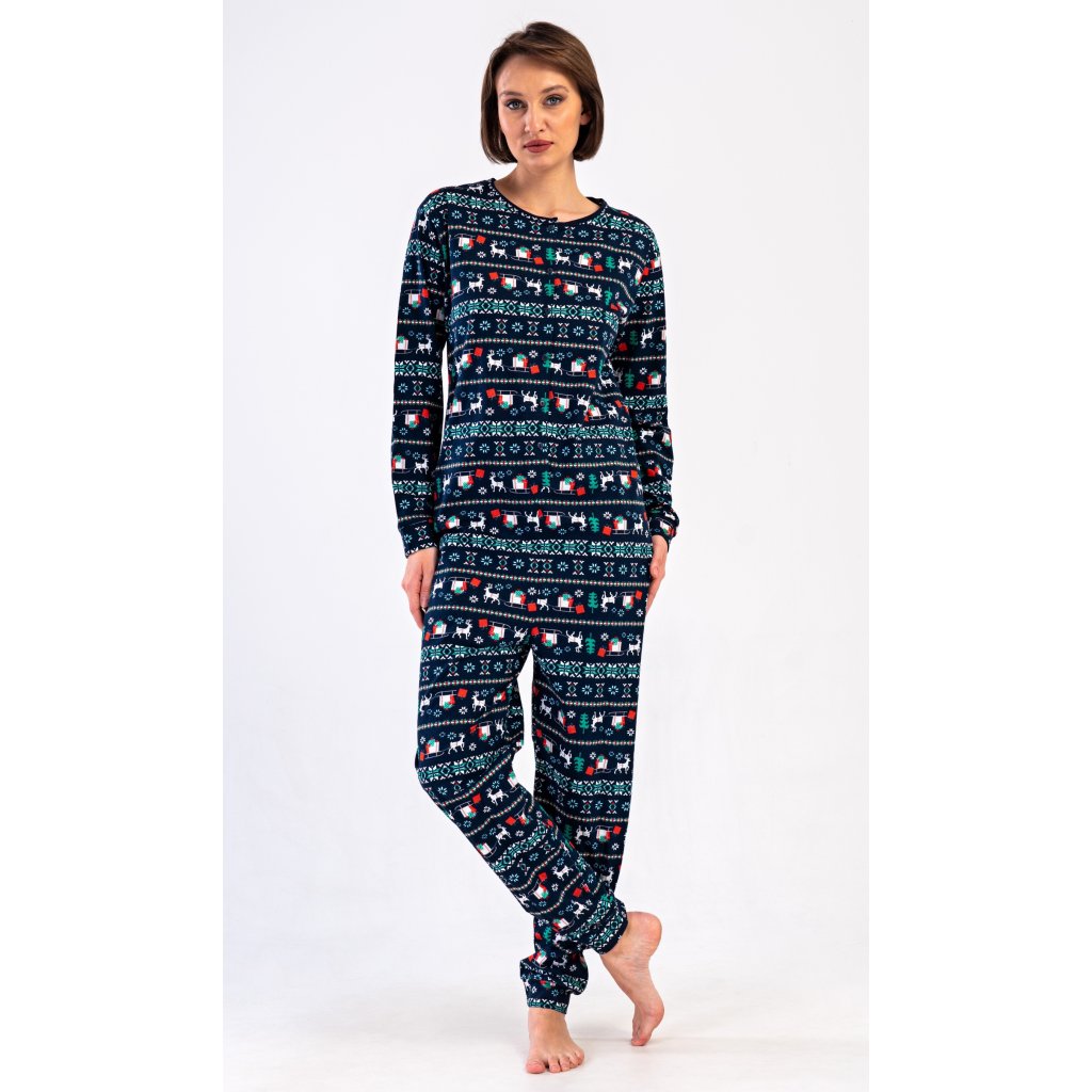 Dámský bavlněný overal Merry christmas. Overal je celopropínací, potištěný vánočními motivy. Dlouhé nohavice a rukávy jsou ukončeny lemy. Bavlněný materiál je poddajný a příjemný na dotek.