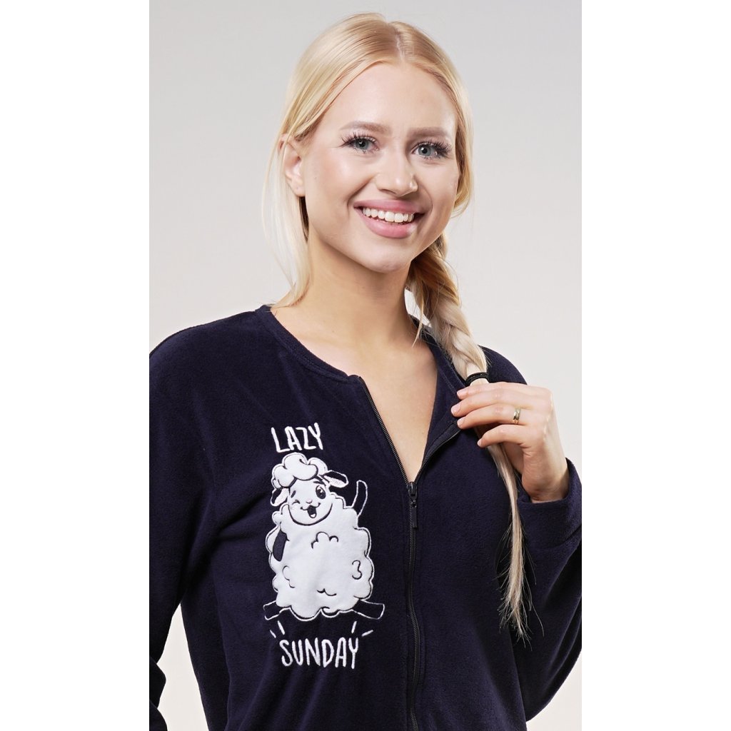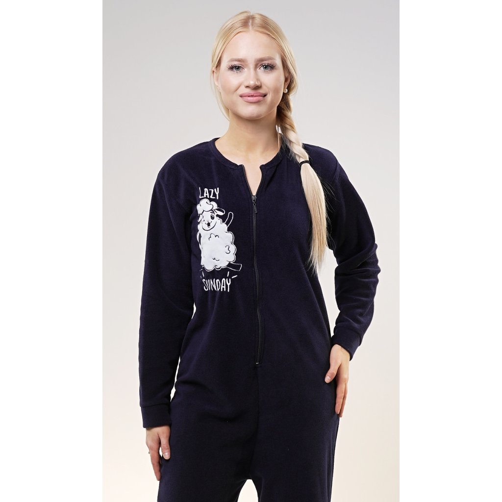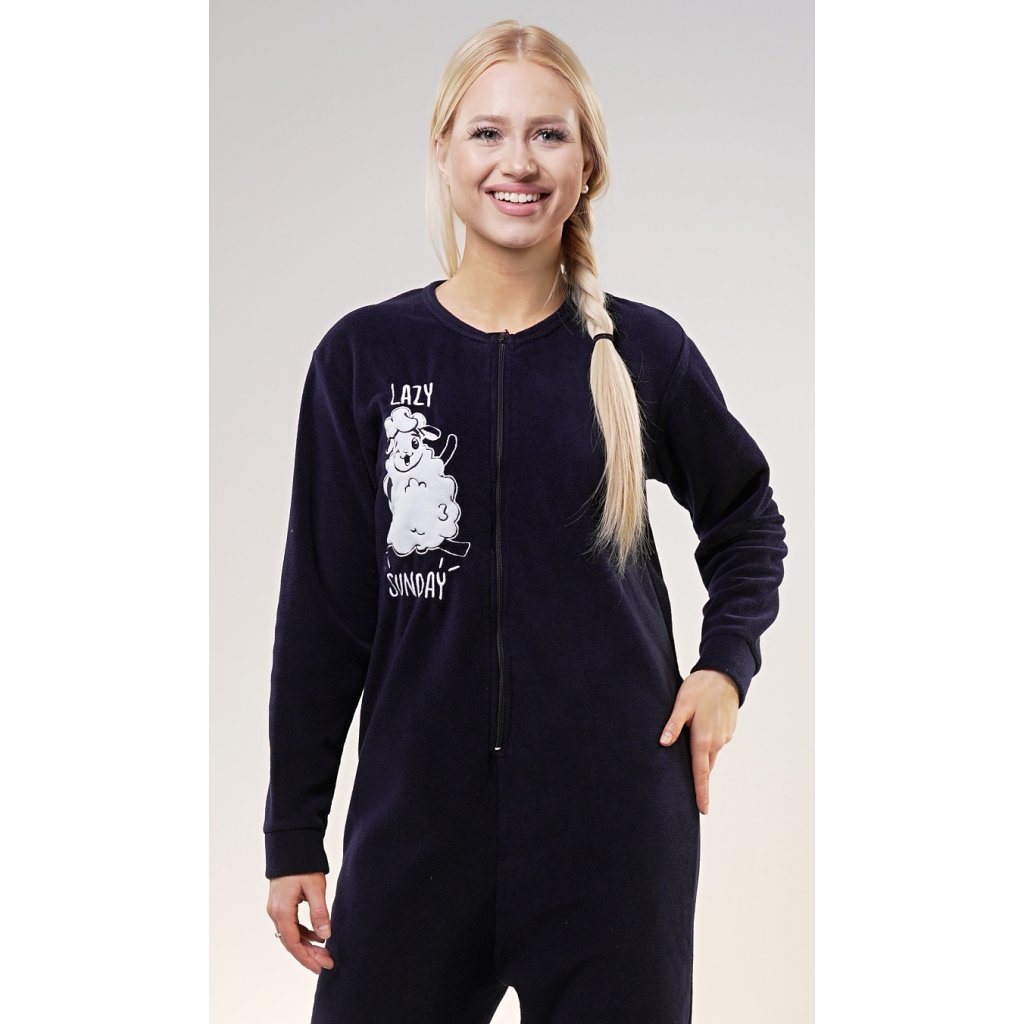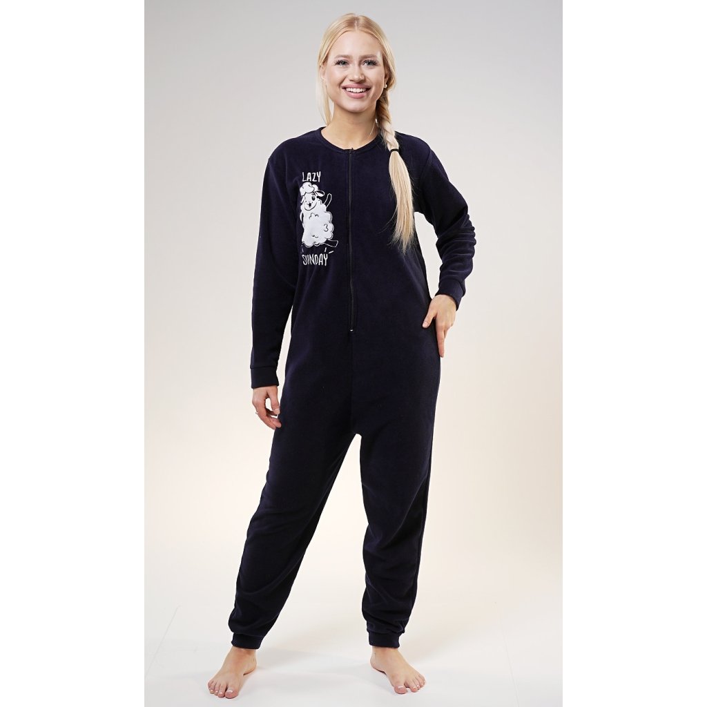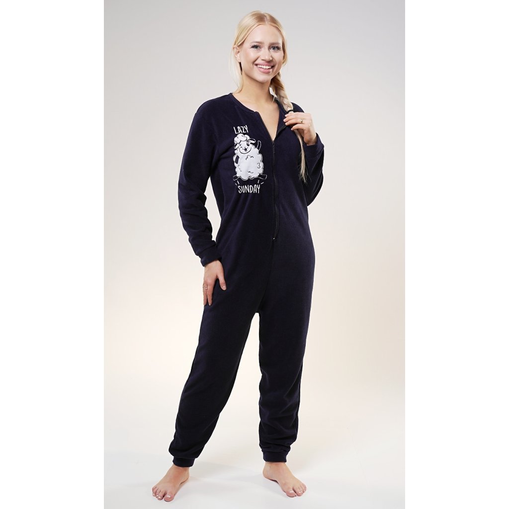 Dámský polarový overal Ovečka. Dámský overal má kulatý výstřih a zapínání na zip. Rukávy a kalhoty jsou zakončeny praktickými lemy. Decentní overal zdobí aplikace s motivem veselé ovečky. Na tmavě modrém podkladu je vyšitý nápis 'Lazy sunday'. Použitý materiál je hřejivý a poddajný na dotek, obzvláště ho oceníte v chladných zimních dnech.