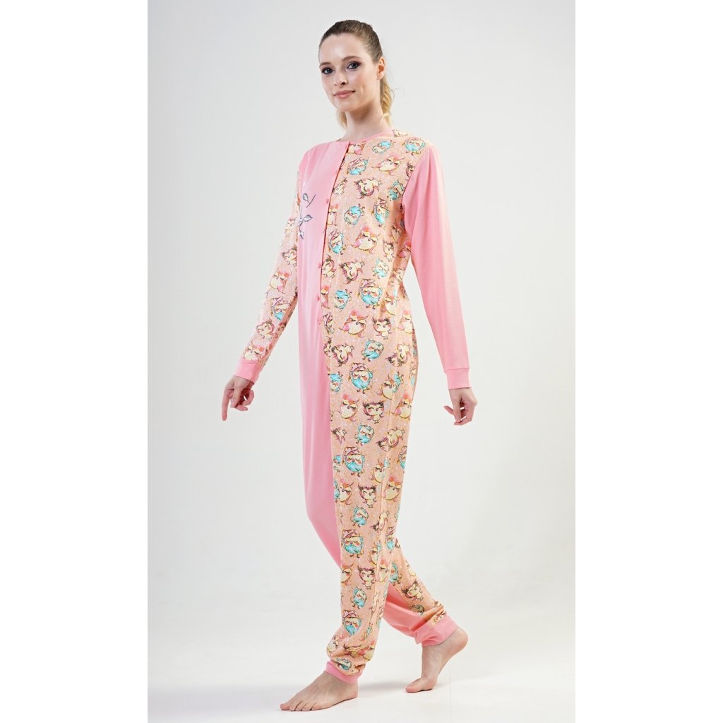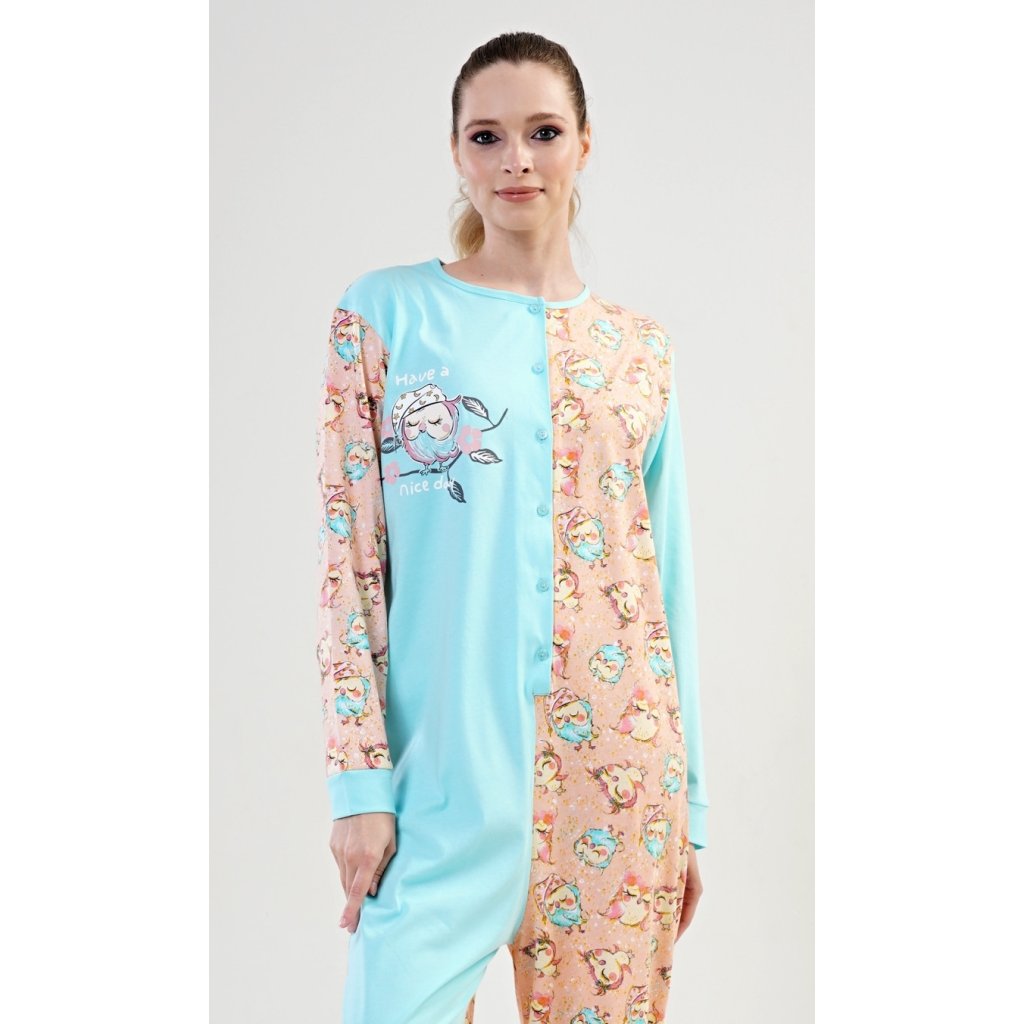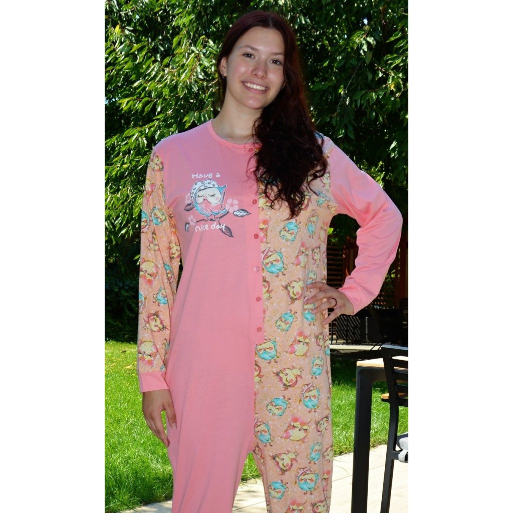 Dámský bavlněný overal Sovičky. Overal je celopropínací - z jedné strany zdobený obrázkem sovy s čepičkou, z druhé strany celoplošným potiskem soviček. Dlouhé nohavice jsou ukončeny elastickými lemy. Bavlněný materiál je poddajný a příjemný na dotek.