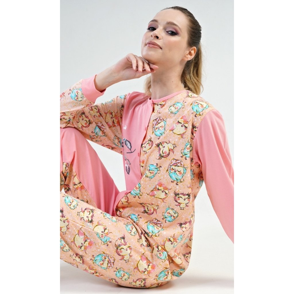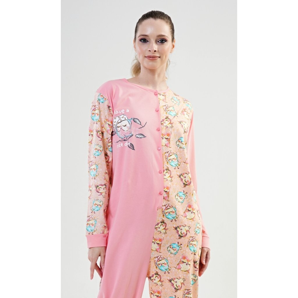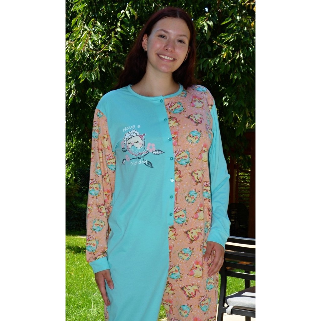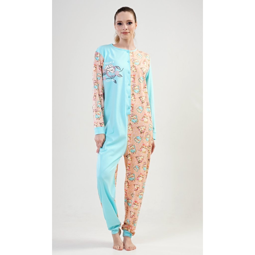 Dámský bavlněný overal Sovičky. Overal je celopropínací - z jedné strany zdobený obrázkem sovy s čepičkou, z druhé strany celoplošným potiskem soviček. Dlouhé nohavice jsou ukončeny elastickými lemy. Bavlněný materiál je poddajný a příjemný na dotek.