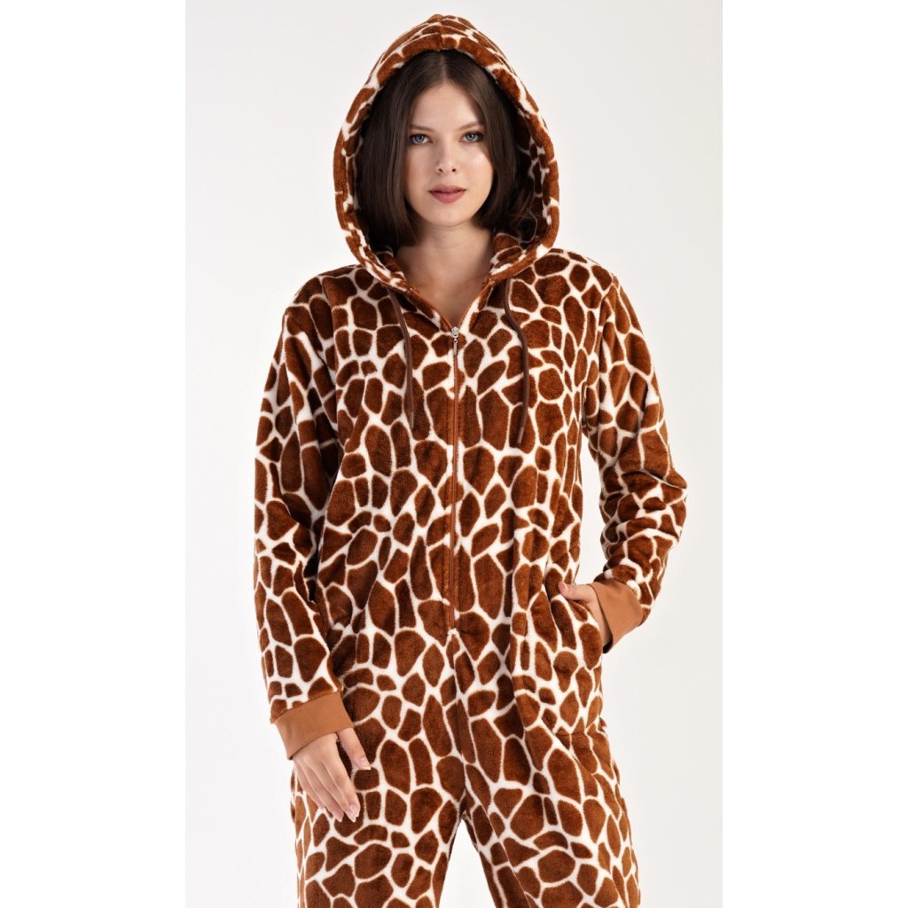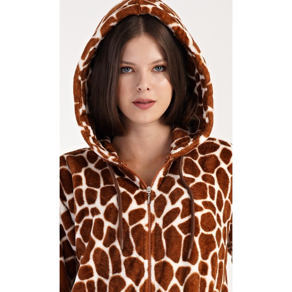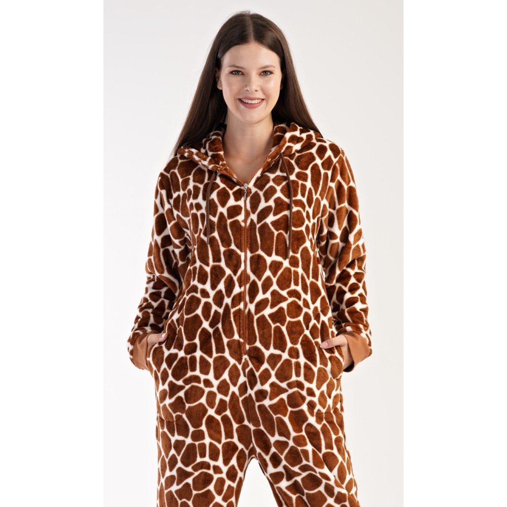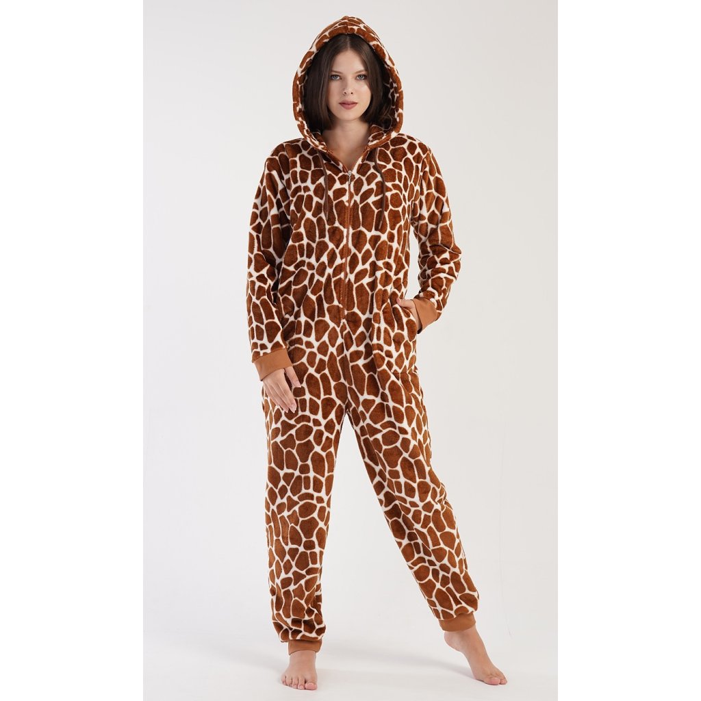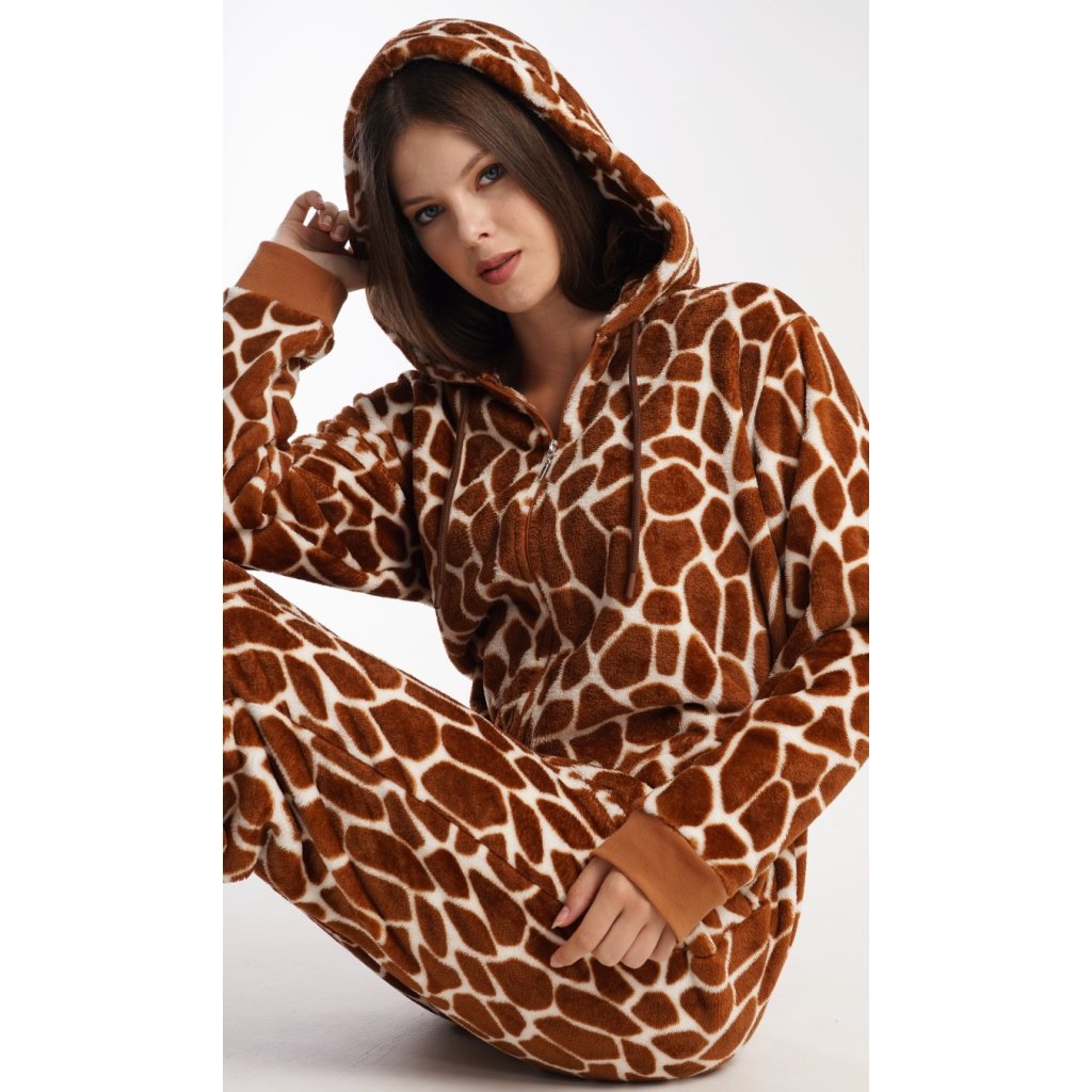 Dámský softový overal Žirafa. Overal má kapuci, zapínání na zip a praktické kapsy. Kalhoty a rukávy jsou zakončeny lemy. Zaujme výrazným žirafím vzorem. Použitý softový materiál je hřejivý a poddajný na dotek, je vhodný i jako domácí oblečení, obzvlášť ho oceníte v chladných zimních dnech.
