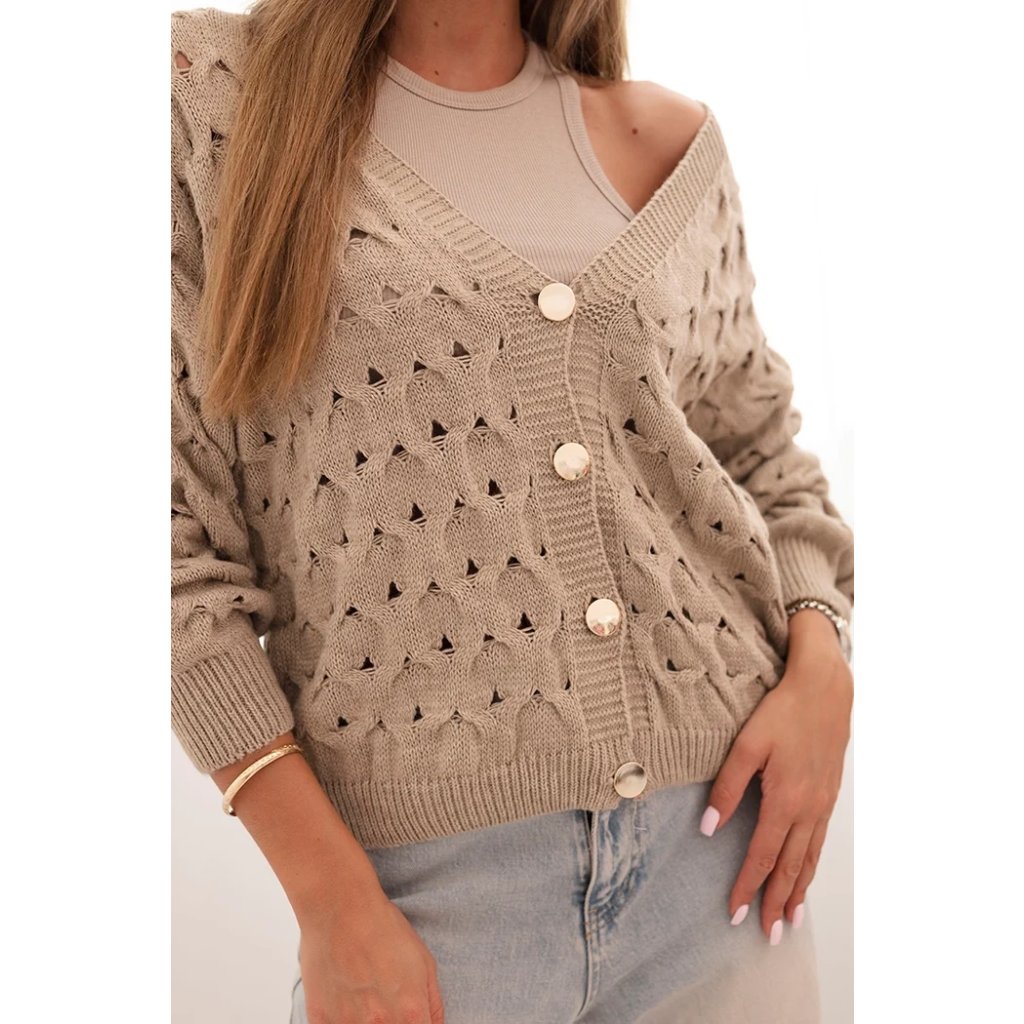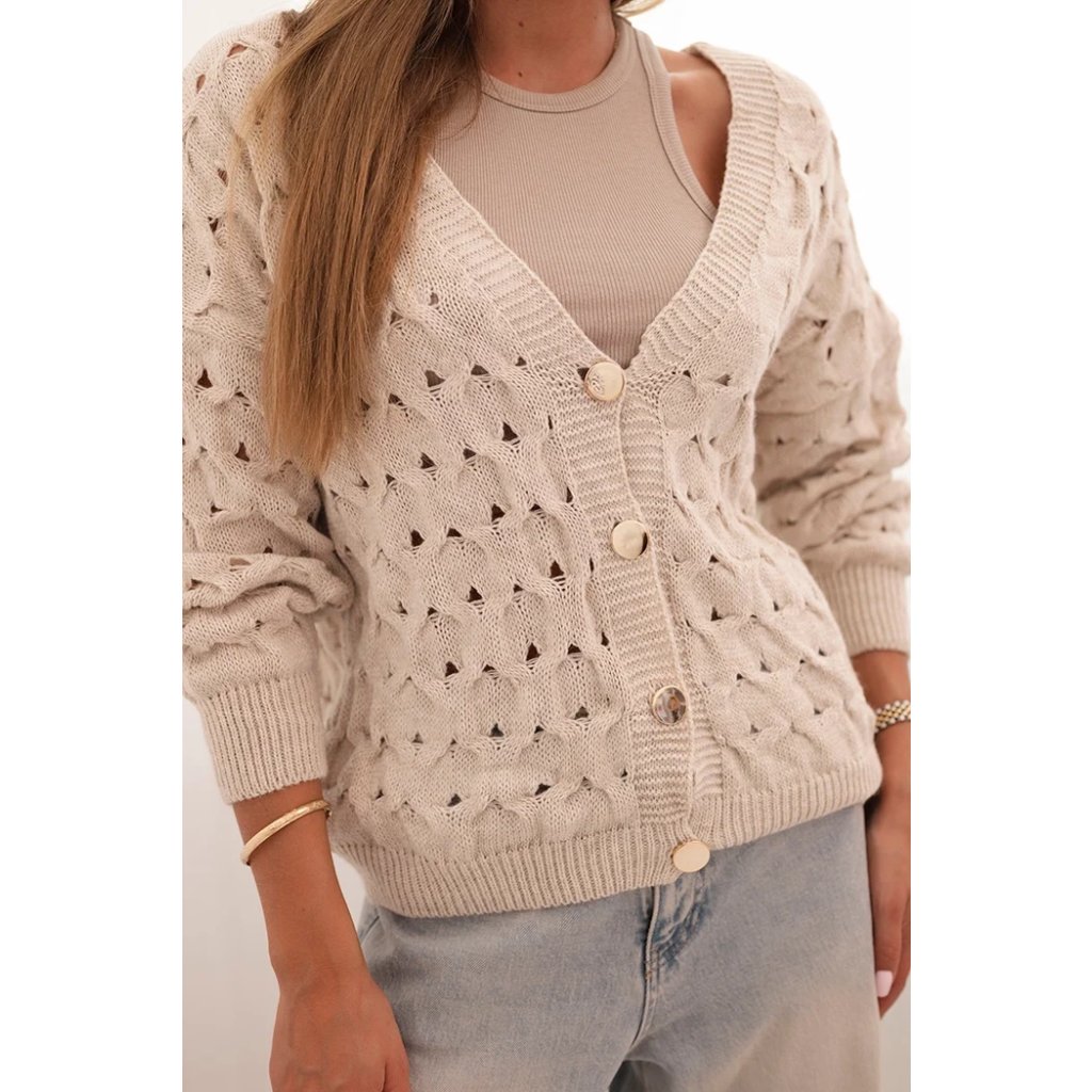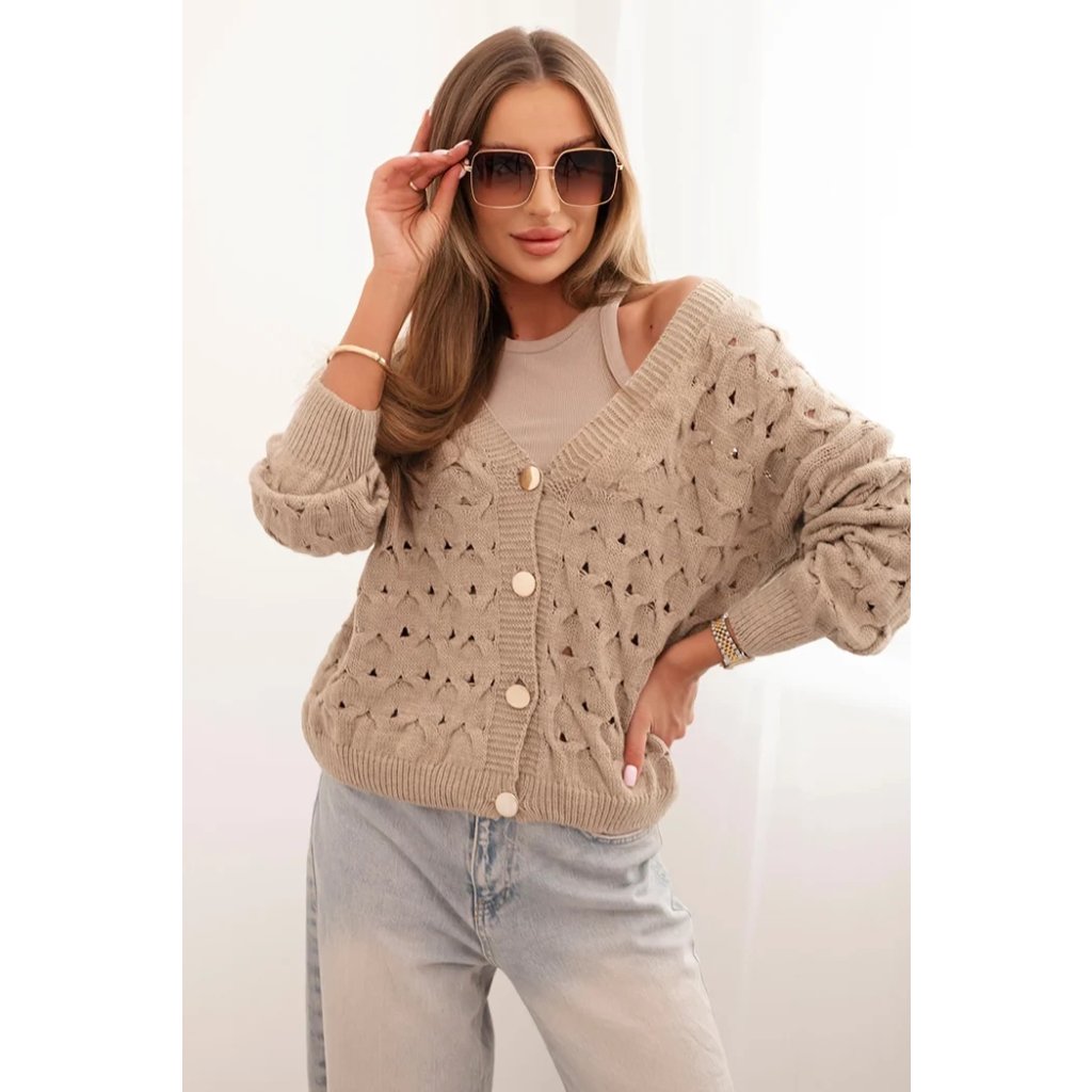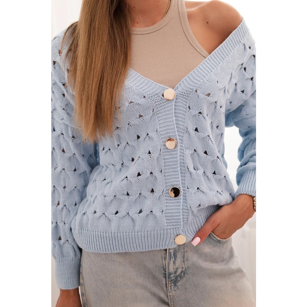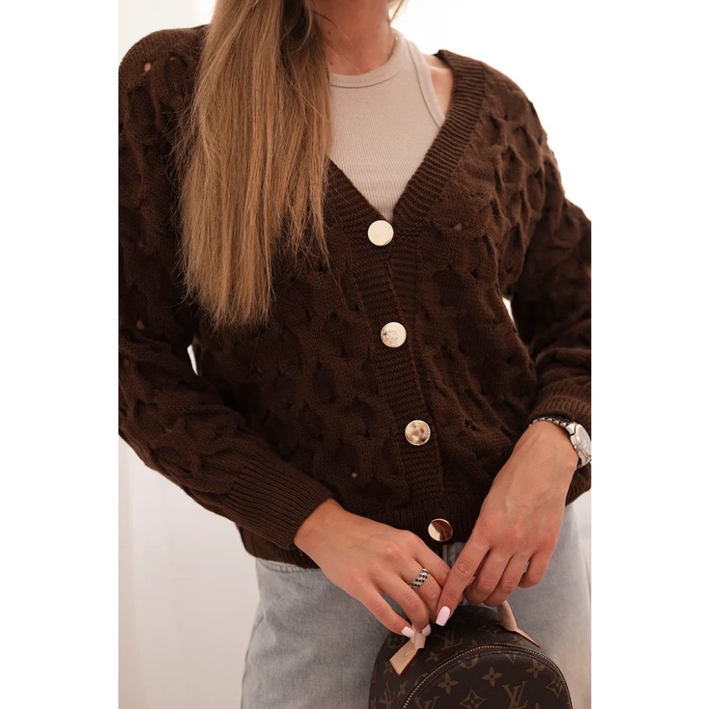 Tento roztomilý dámský svetr s ažurovým vzorem je ideální volbou pro ženy, které si cení elegance a pohodlí. Model se zapínáním na efektní zlaté knoflíky a hlubokým výstřihem do V mu dodává jemný půvab a ženský charakter. Volnější střih zajišťuje, že svetr krásně sedí na postavě, neomezuje v pohybu a hodí se jak k džínům, tak k sukním. Svetr bude skvělou volbou na chladnější dny – vezmete si ho do práce, na procházku, schůzku s přáteli nebo jako součást ležérního outfitu. Lehký a prodyšný ažurový materiál zajišťuje pohodlí po celý den. Velikost je univerzální a bude vhodná pro dámy velikosti S, M nebo L.