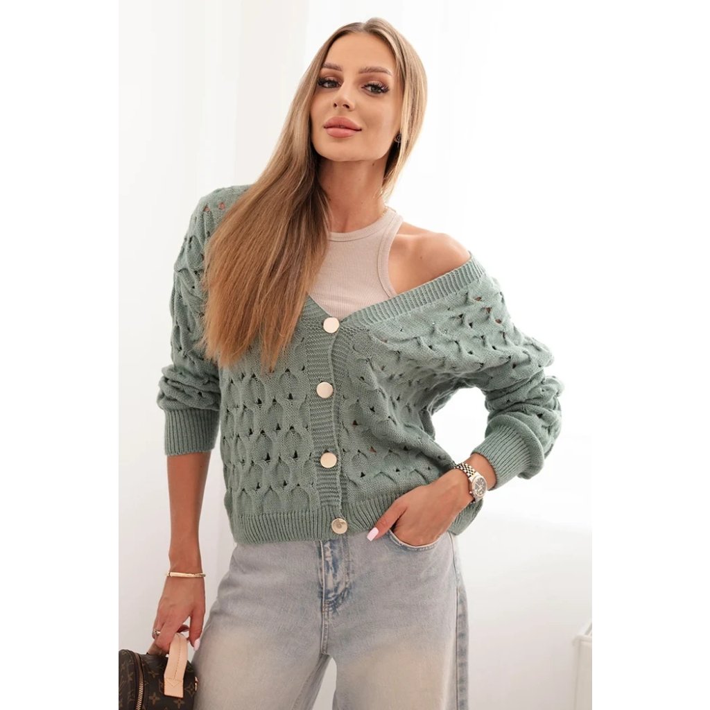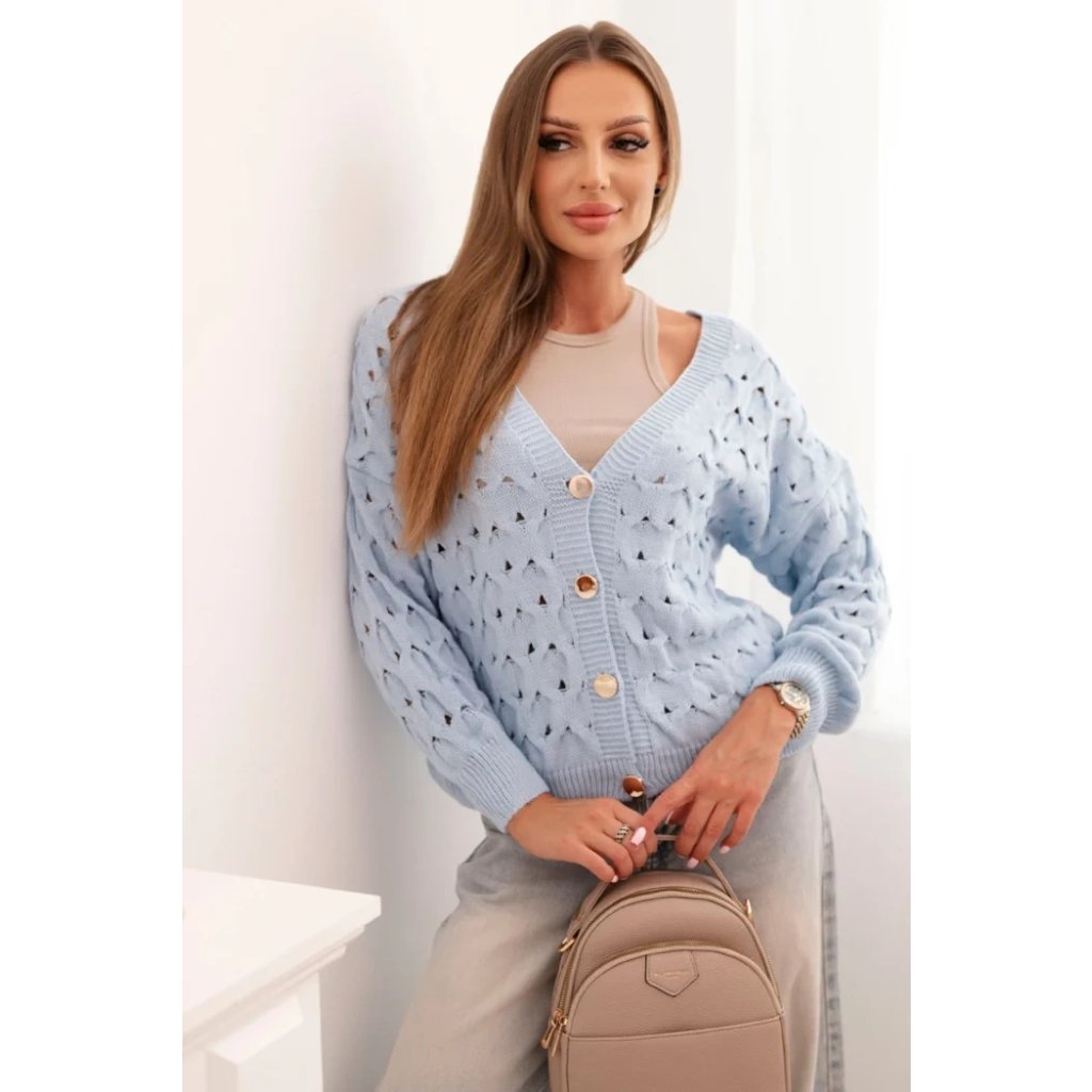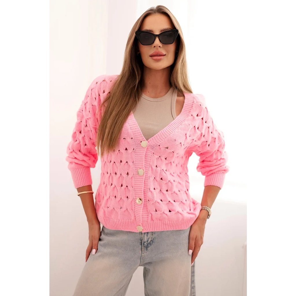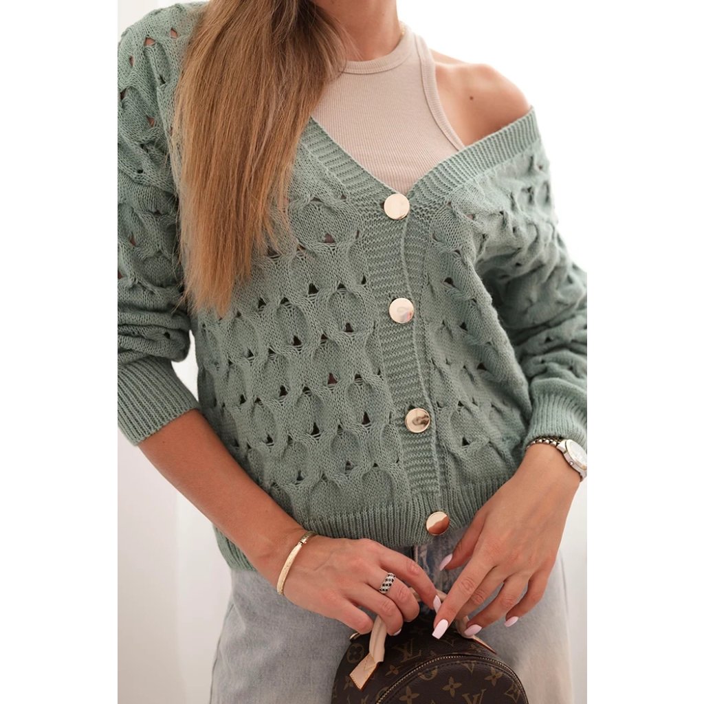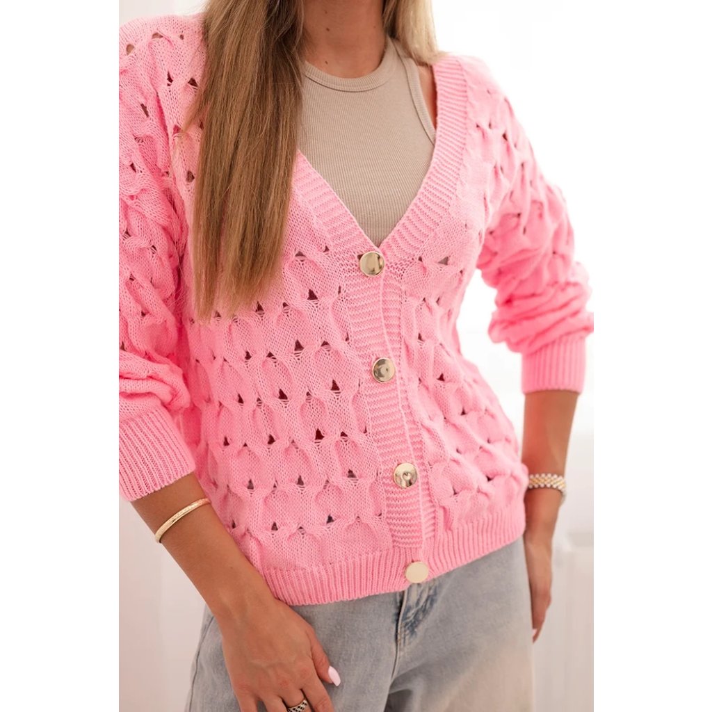 Tento roztomilý dámský svetr s ažurovým vzorem je ideální volbou pro ženy, které si cení elegance a pohodlí. Model se zapínáním na efektní zlaté knoflíky a hlubokým výstřihem do V mu dodává jemný půvab a ženský charakter. Volnější střih zajišťuje, že svetr krásně sedí na postavě, neomezuje v pohybu a hodí se jak k džínům, tak k sukním. Svetr bude skvělou volbou na chladnější dny – vezmete si ho do práce, na procházku, schůzku s přáteli nebo jako součást ležérního outfitu. Lehký a prodyšný ažurový materiál zajišťuje pohodlí po celý den. Velikost je univerzální a bude vhodná pro dámy velikosti S, M nebo L.