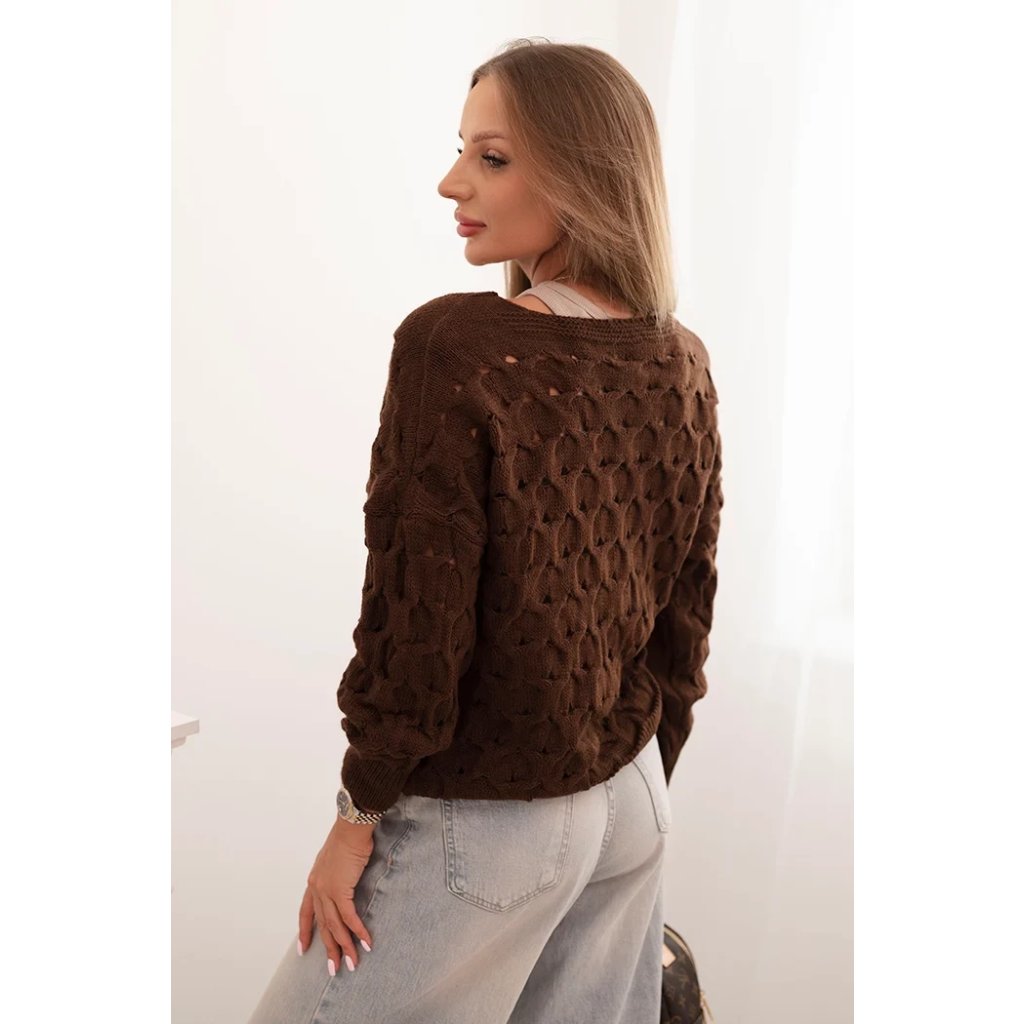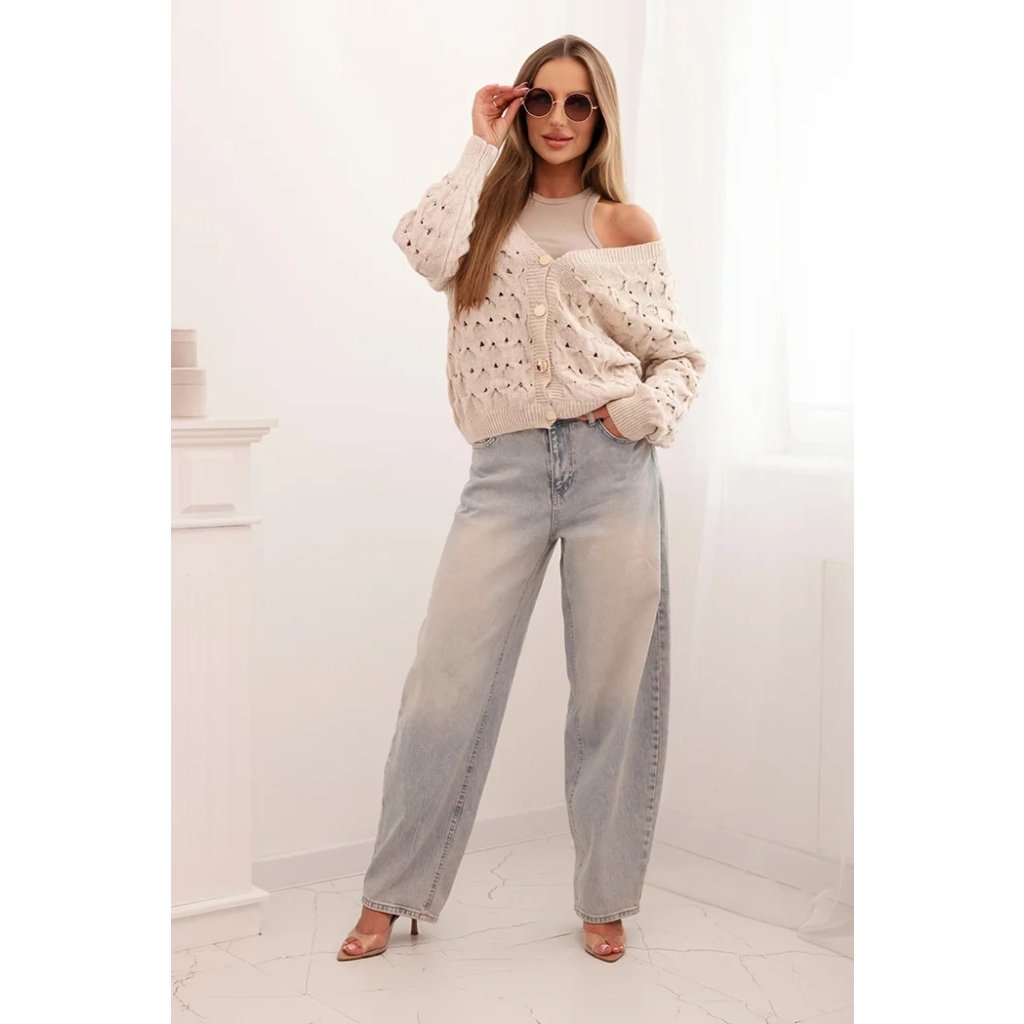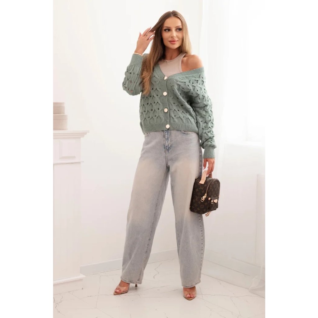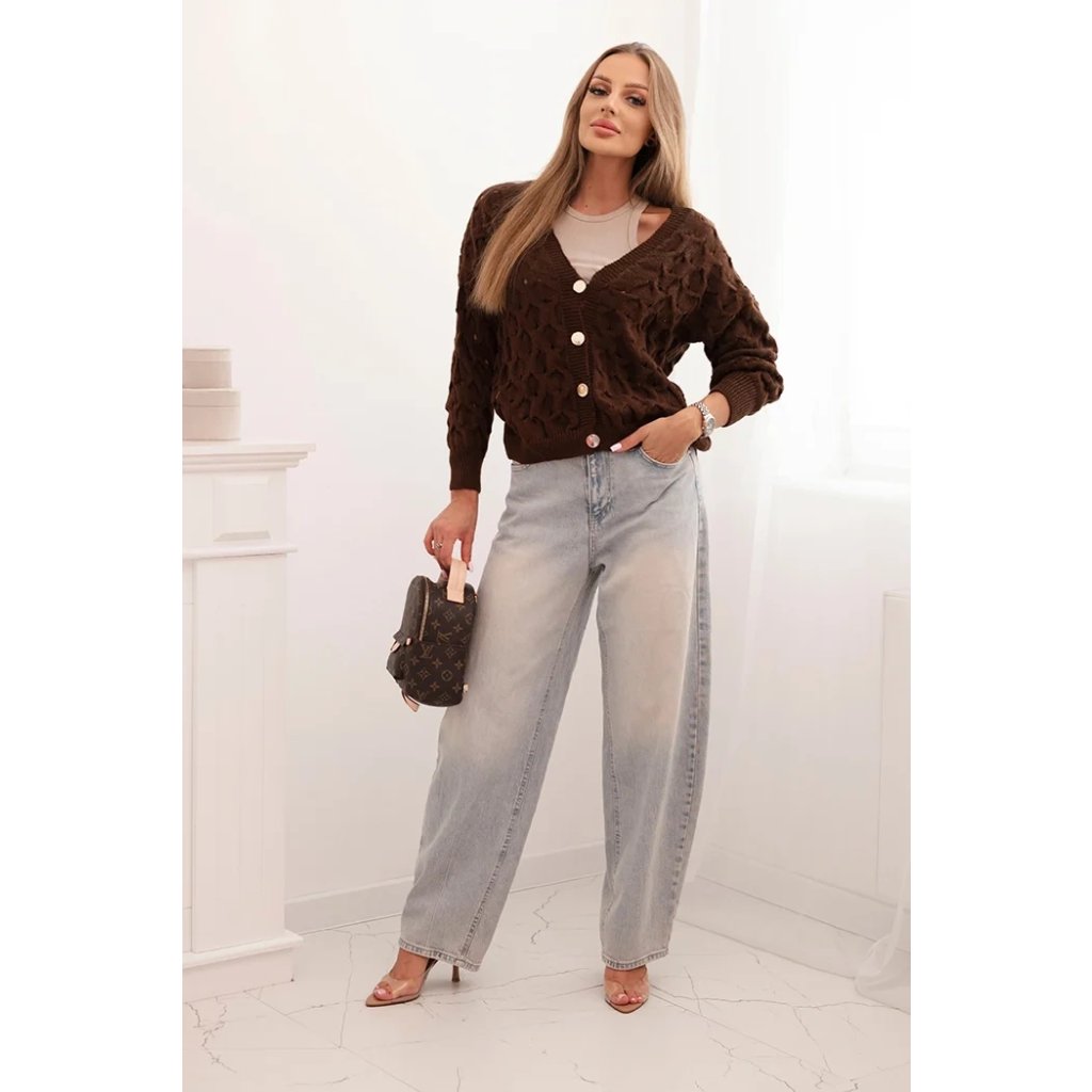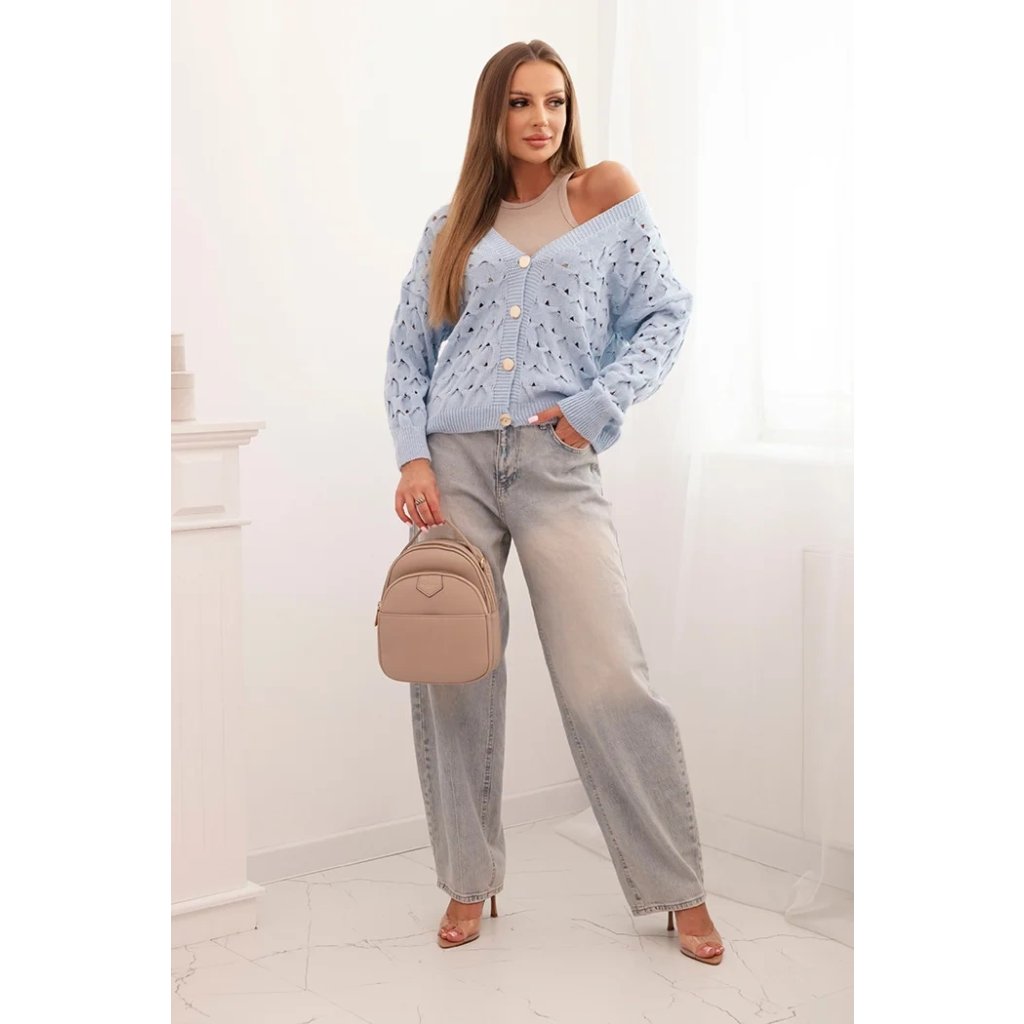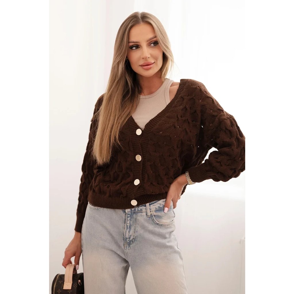 Tento roztomilý dámský svetr s ažurovým vzorem je ideální volbou pro ženy, které si cení elegance a pohodlí. Model se zapínáním na efektní zlaté knoflíky a hlubokým výstřihem do V mu dodává jemný půvab a ženský charakter. Volnější střih zajišťuje, že svetr krásně sedí na postavě, neomezuje v pohybu a hodí se jak k džínům, tak k sukním. Svetr bude skvělou volbou na chladnější dny – vezmete si ho do práce, na procházku, schůzku s přáteli nebo jako součást ležérního outfitu. Lehký a prodyšný ažurový materiál zajišťuje pohodlí po celý den. Velikost je univerzální a bude vhodná pro dámy velikosti S, M nebo L.