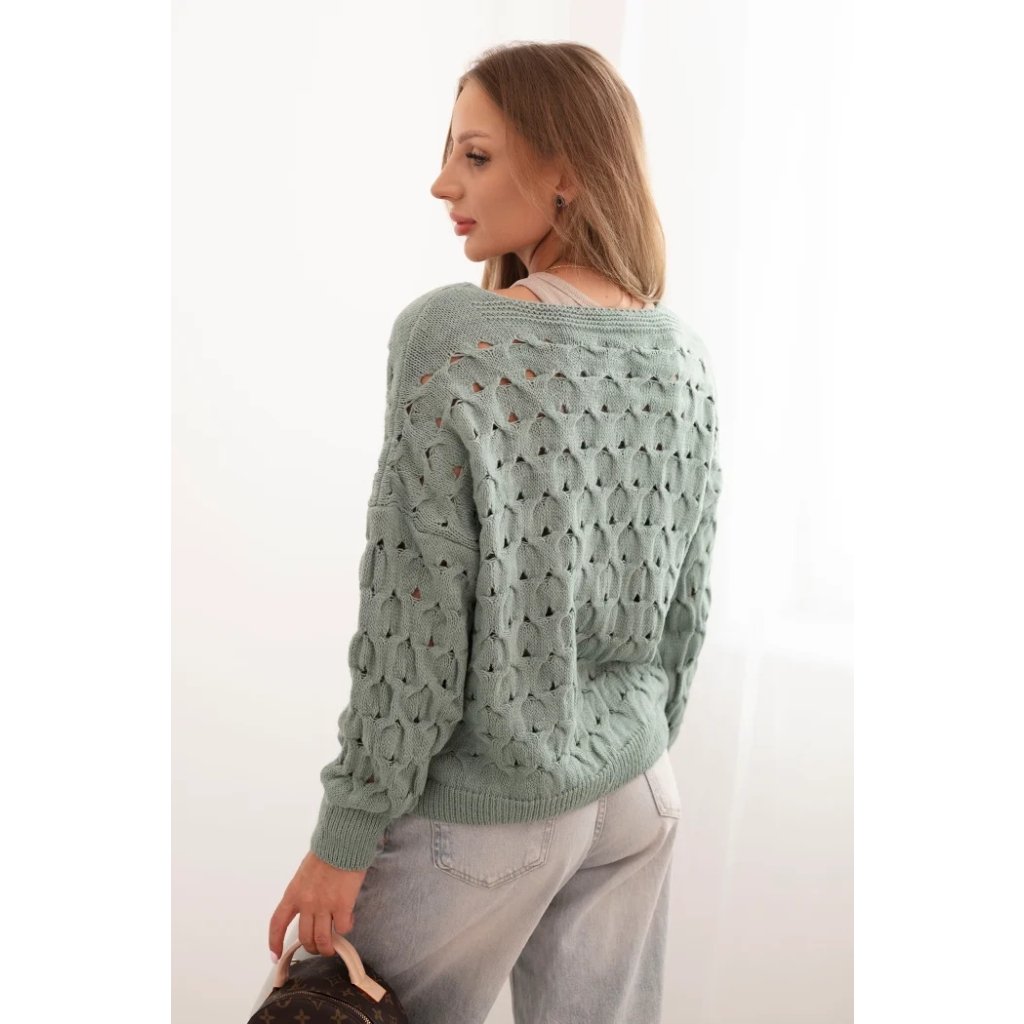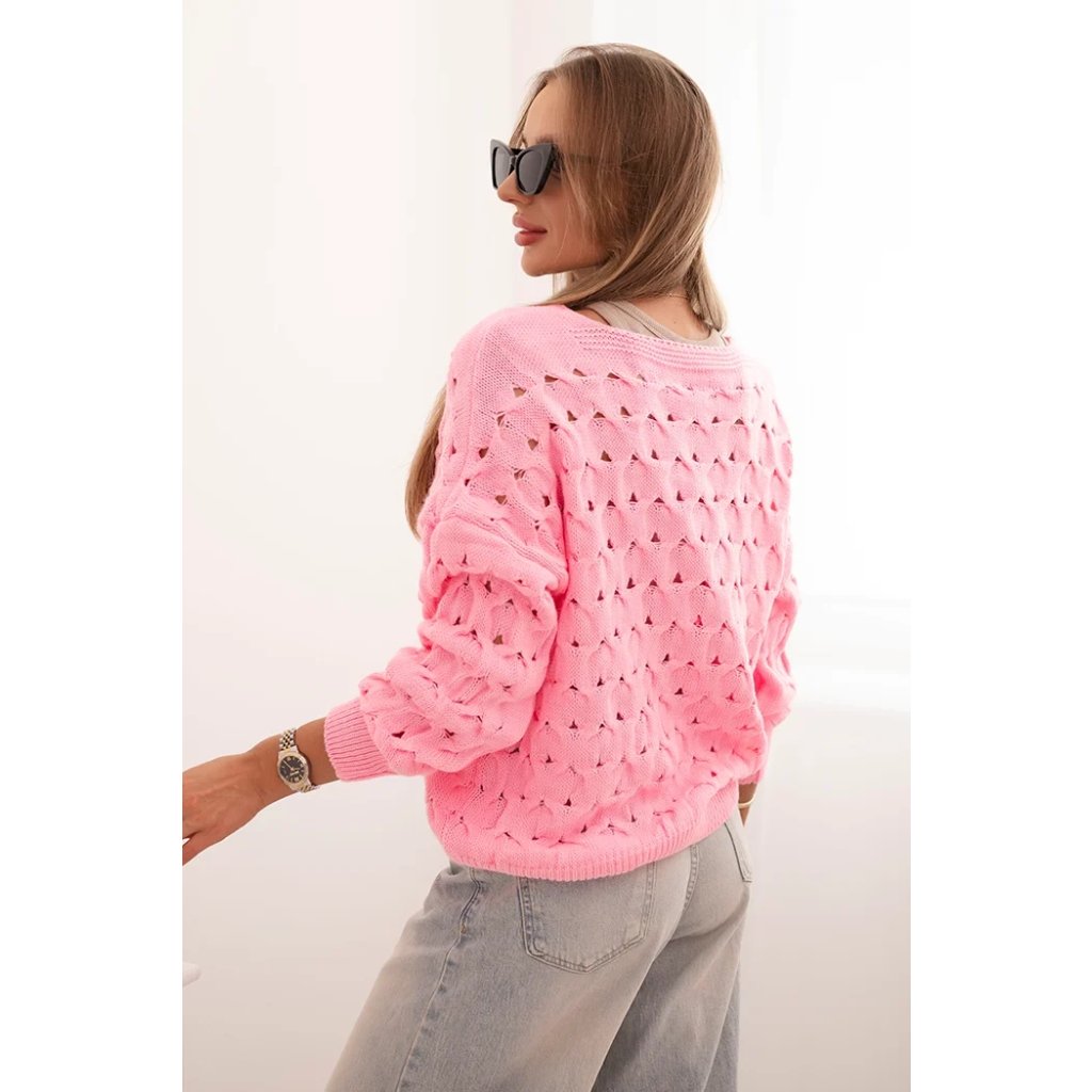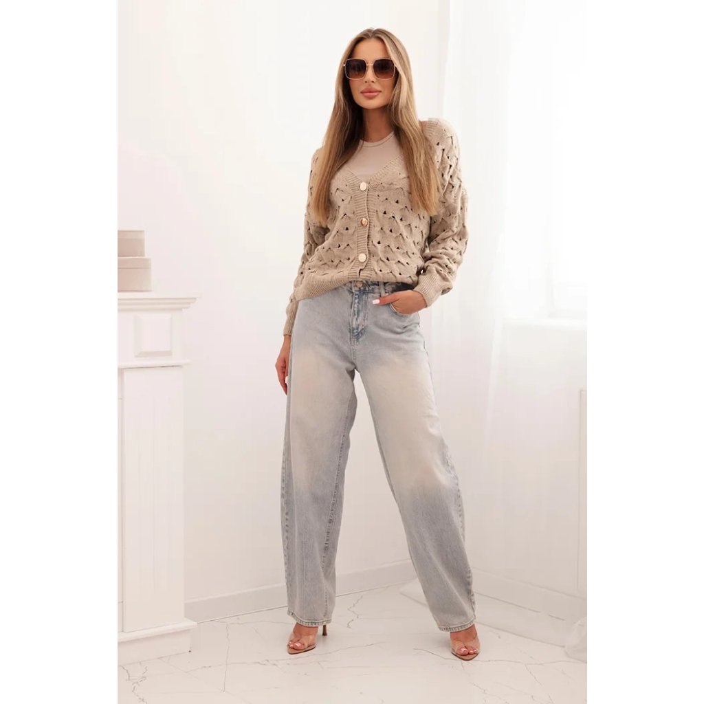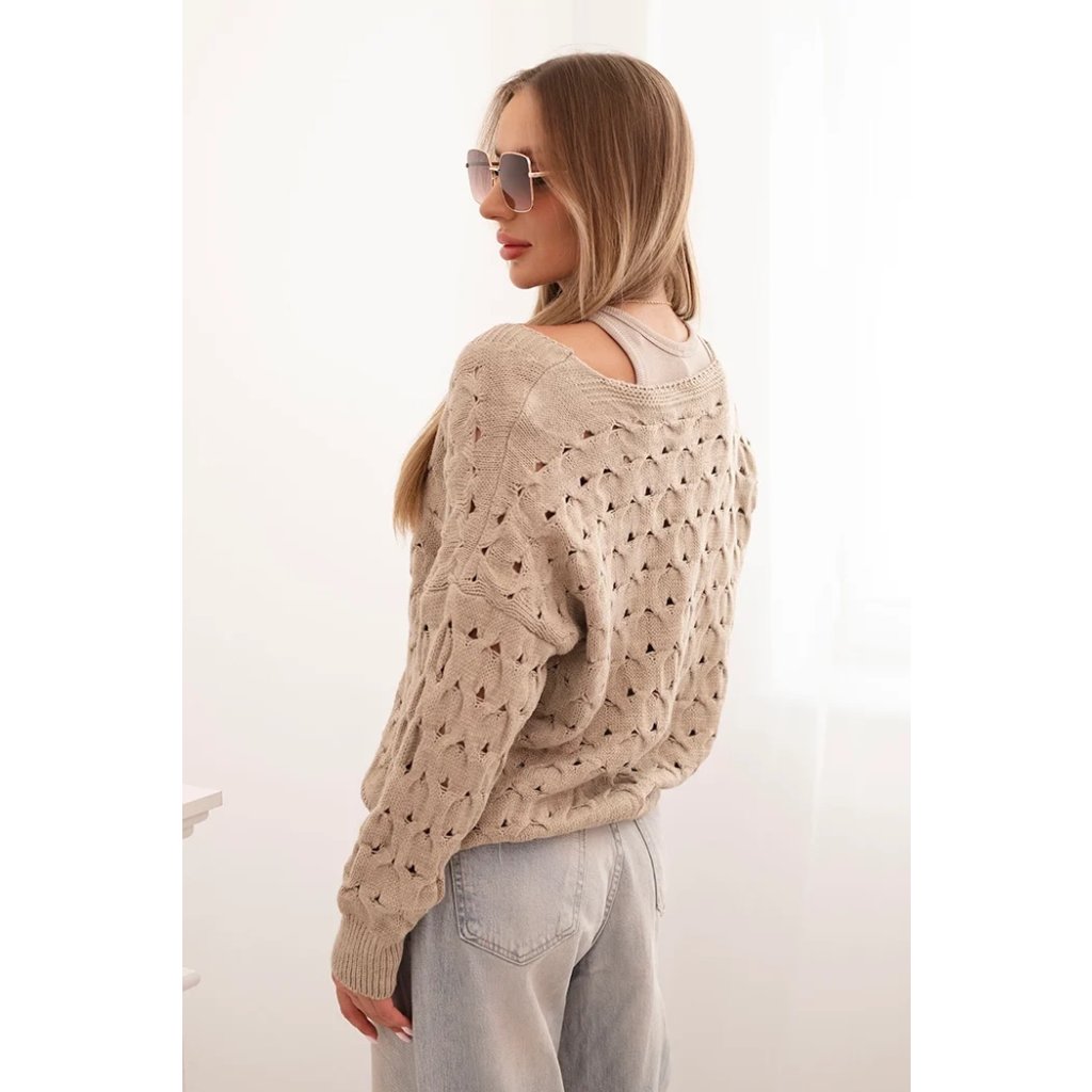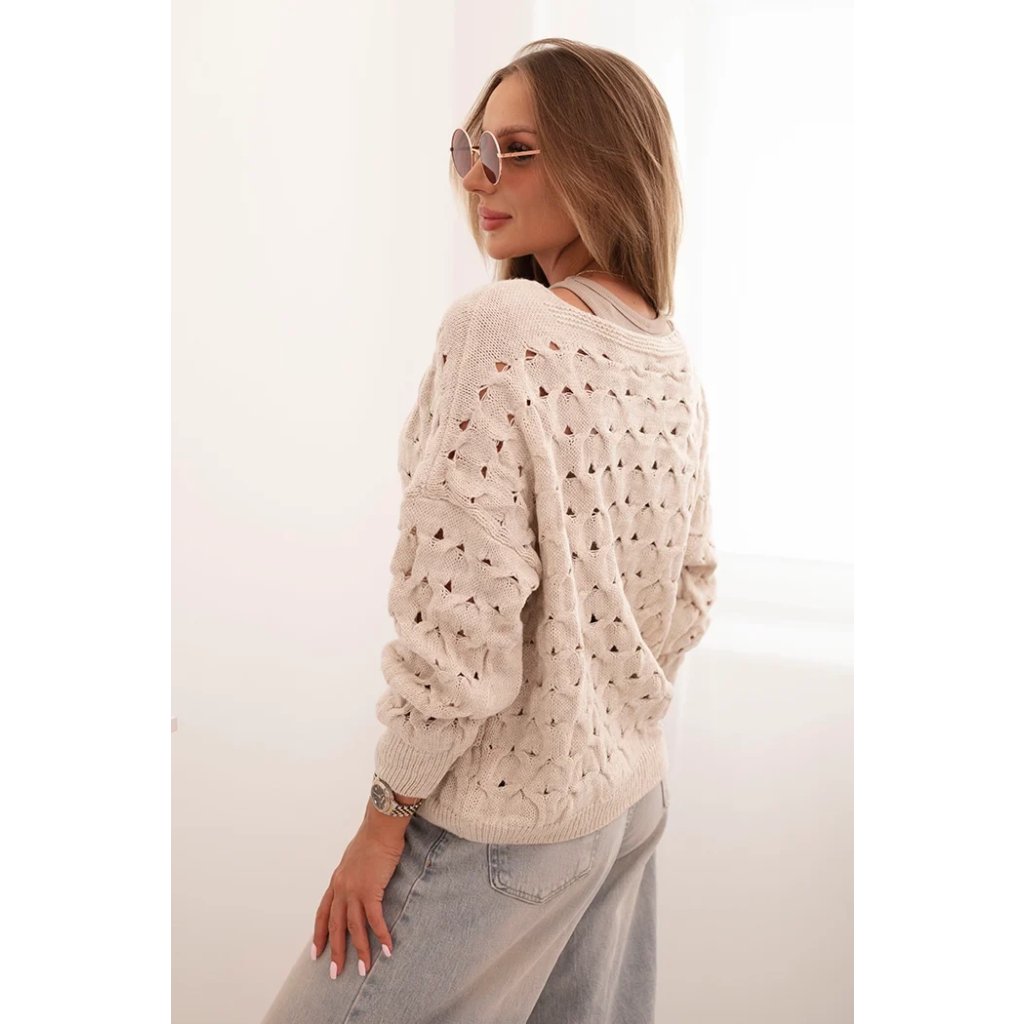 Tento roztomilý dámský svetr s ažurovým vzorem je ideální volbou pro ženy, které si cení elegance a pohodlí. Model se zapínáním na efektní zlaté knoflíky a hlubokým výstřihem do V mu dodává jemný půvab a ženský charakter. Volnější střih zajišťuje, že svetr krásně sedí na postavě, neomezuje v pohybu a hodí se jak k džínům, tak k sukním. Svetr bude skvělou volbou na chladnější dny – vezmete si ho do práce, na procházku, schůzku s přáteli nebo jako součást ležérního outfitu. Lehký a prodyšný ažurový materiál zajišťuje pohodlí po celý den. Velikost je univerzální a bude vhodná pro dámy velikosti S, M nebo L.