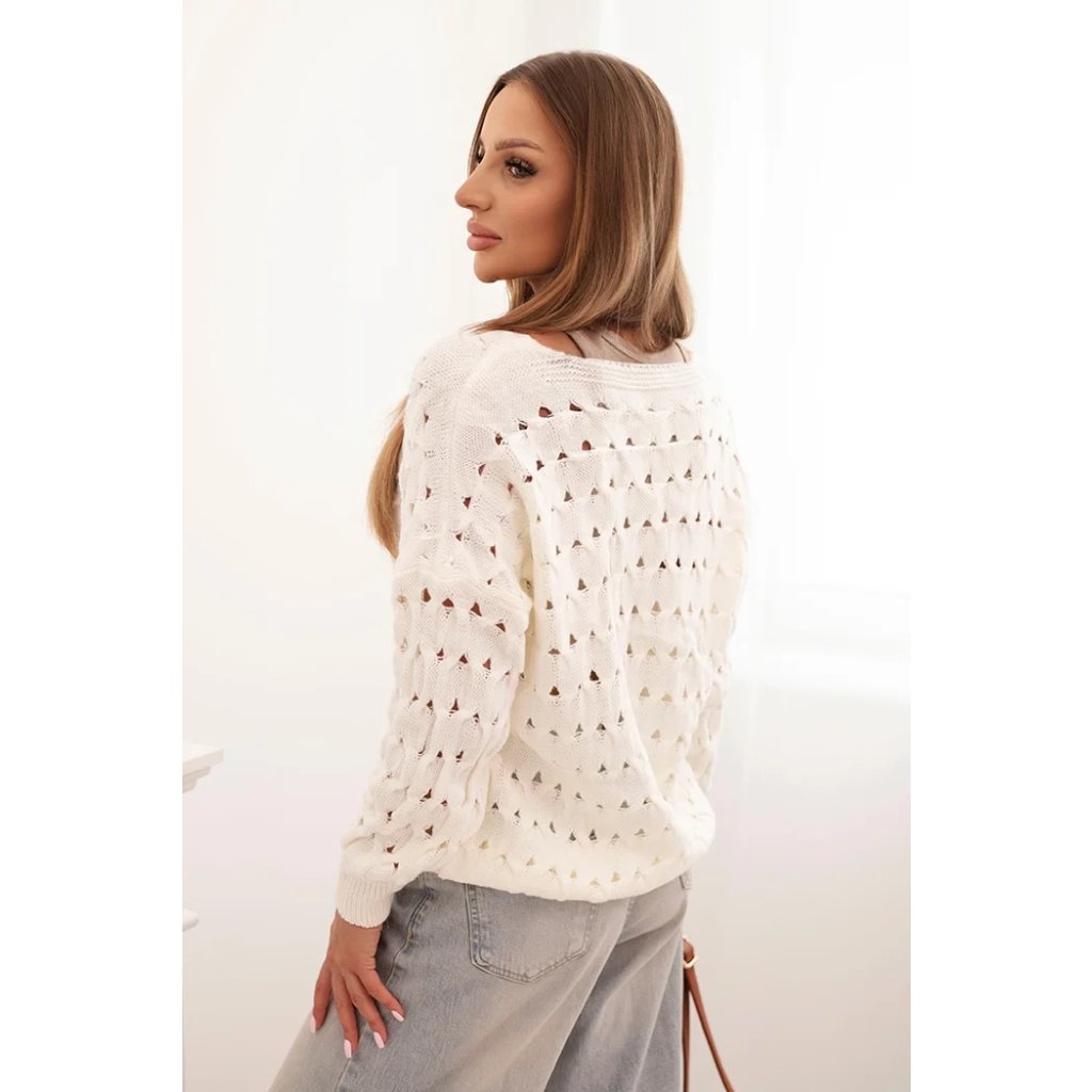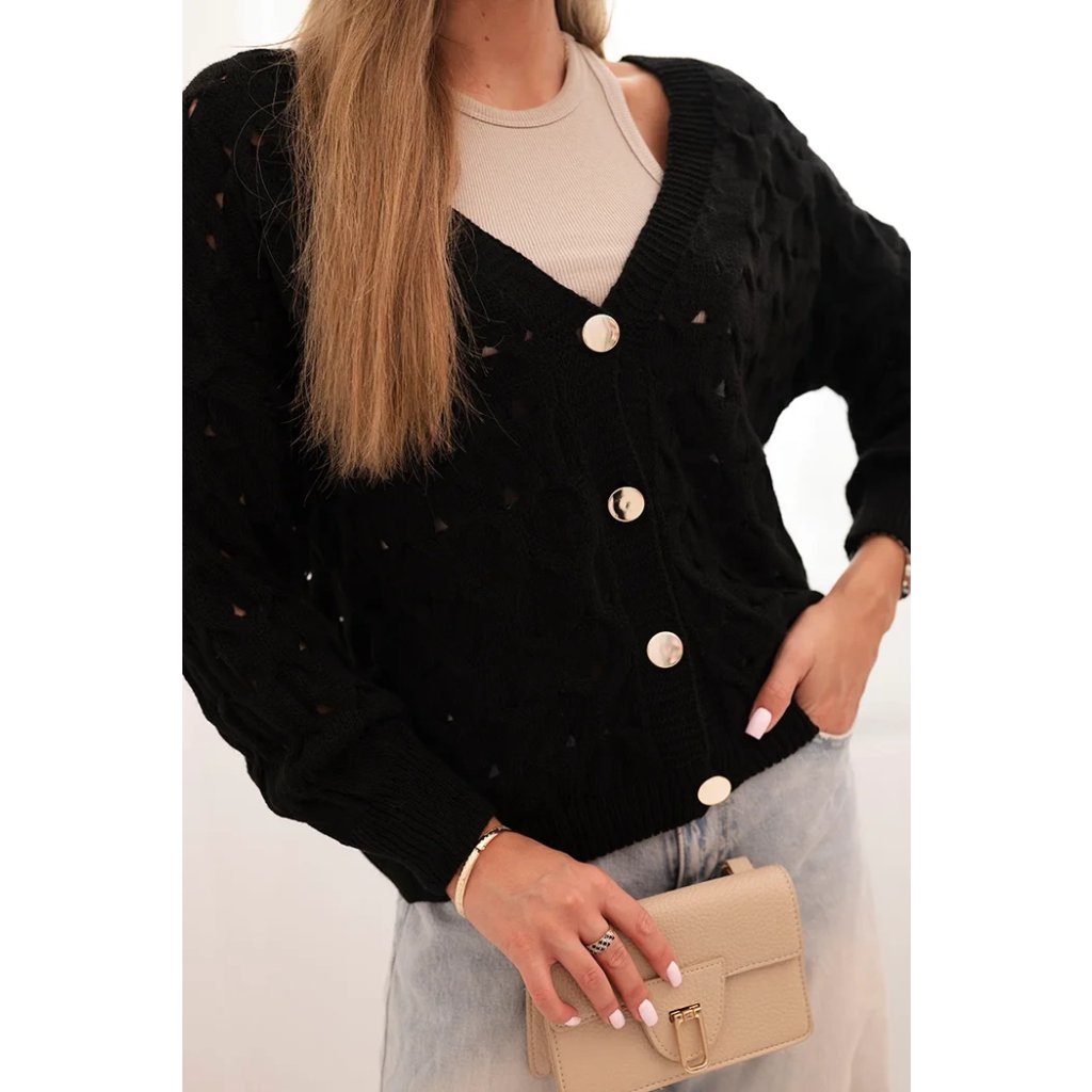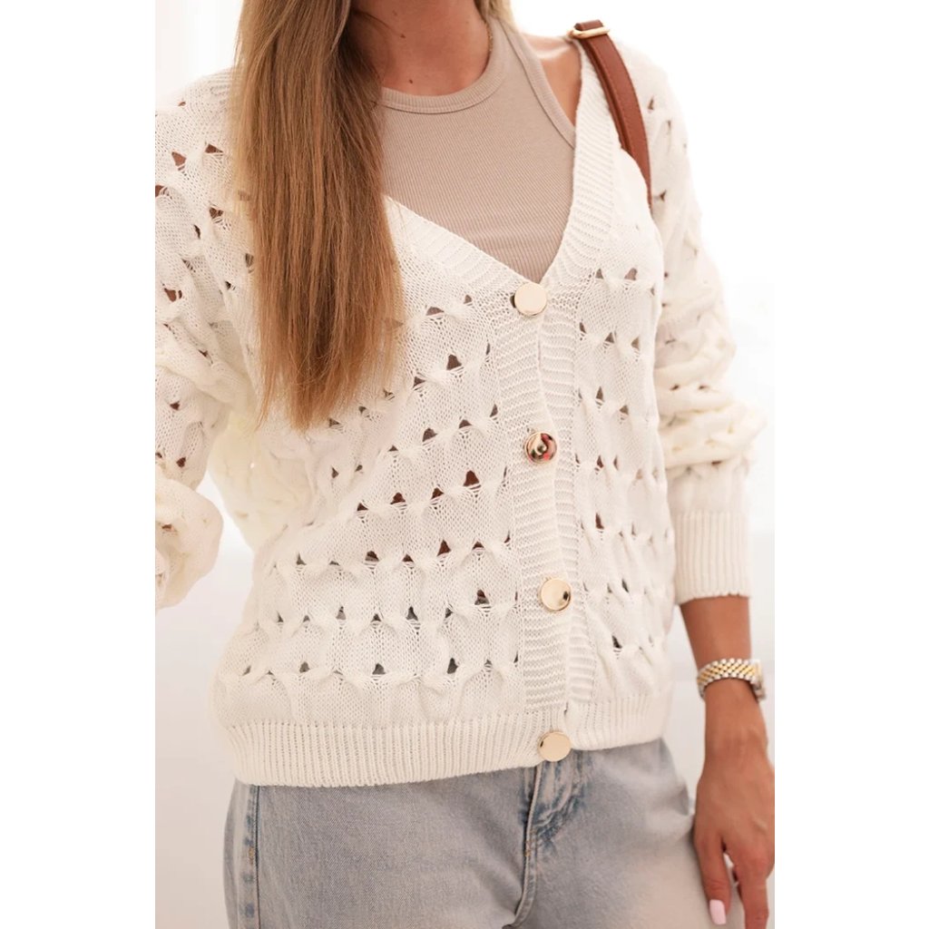 Tento roztomilý dámský svetr s ažurovým vzorem je ideální volbou pro ženy, které si cení elegance a pohodlí. Model se zapínáním na efektní zlaté knoflíky a hlubokým výstřihem do V mu dodává jemný půvab a ženský charakter. Volnější střih zajišťuje, že svetr krásně sedí na postavě, neomezuje v pohybu a hodí se jak k džínům, tak k sukním. Svetr bude skvělou volbou na chladnější dny – vezmete si ho do práce, na procházku, schůzku s přáteli nebo jako součást ležérního outfitu. Lehký a prodyšný ažurový materiál zajišťuje pohodlí po celý den. Velikost je univerzální a bude vhodná pro dámy velikosti S, M nebo L.