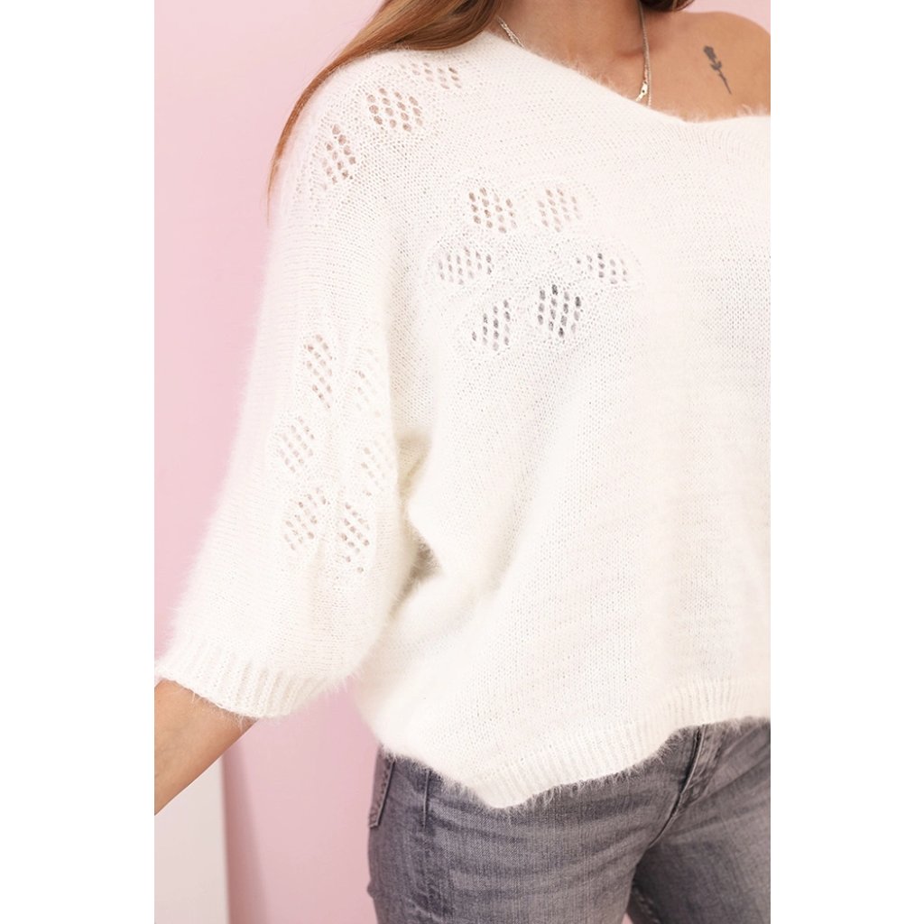 Stylový dámský svetr s příměsí mohairu je skvělým návrhem na chladnější dny. Volný střih s jemným výstřihem do V zajišťuje pohodlí při nošení a svobodu pohybu, zatímco subtilní vzor propletený do pleteniny dodává celku lehkost. Materiál je měkký, příjemný na dotek a dobře udržuje teplo.
