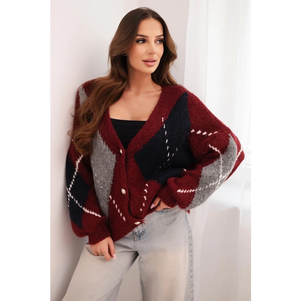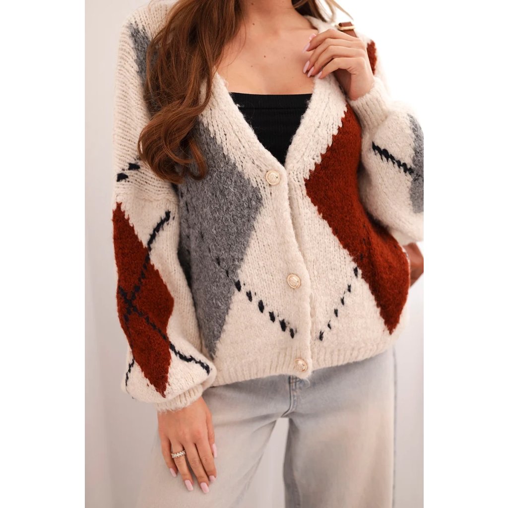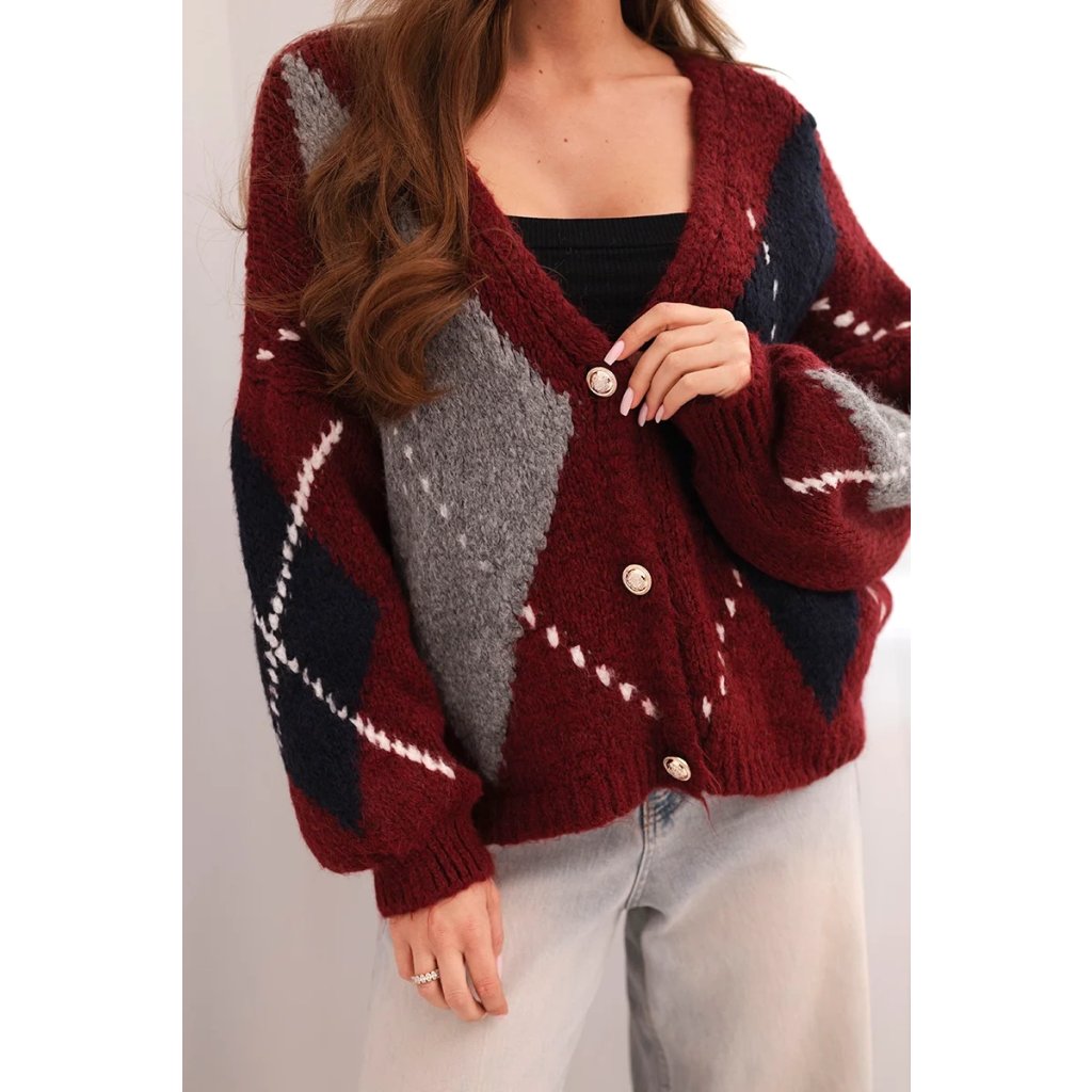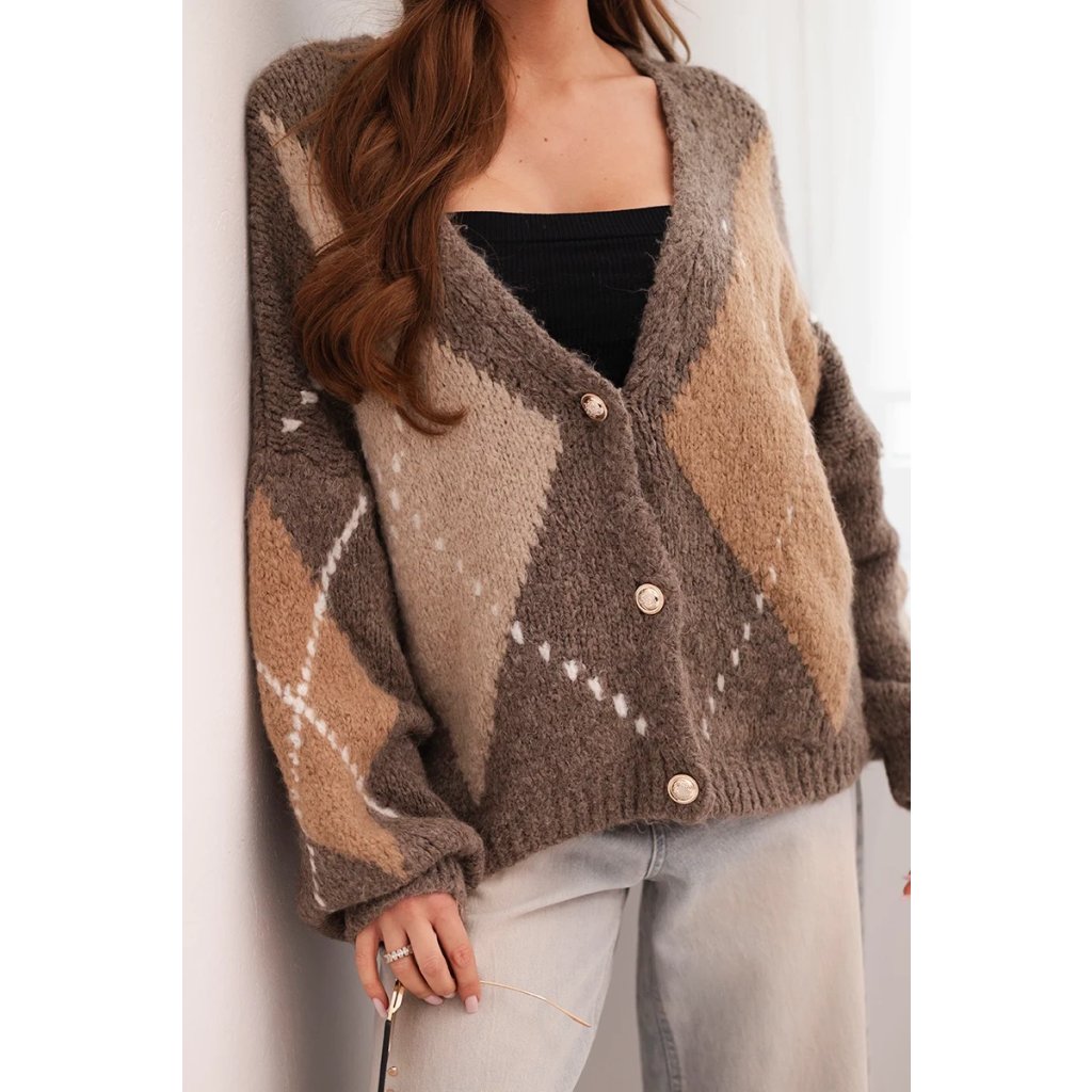 Stylový dámský kardigan v módním vzoru kosočtverců je must-have sezóny podzim–zima. Volný, oversized střih s hlubokým výstřihem do V dodává siluetě lehkost a volnost. Zapínání na dekorativní knoflíky přidává eleganci, a teplý, měkký materiál dělá z něj ideální volbu na chladné dny. Kardigan se skvěle kombinuje jak s džíny, tak s sukněmi, a hodí se do každodenních a casualových stylizací. Velké kosočtverce mu dodávají originální a nadčasový vzhled.